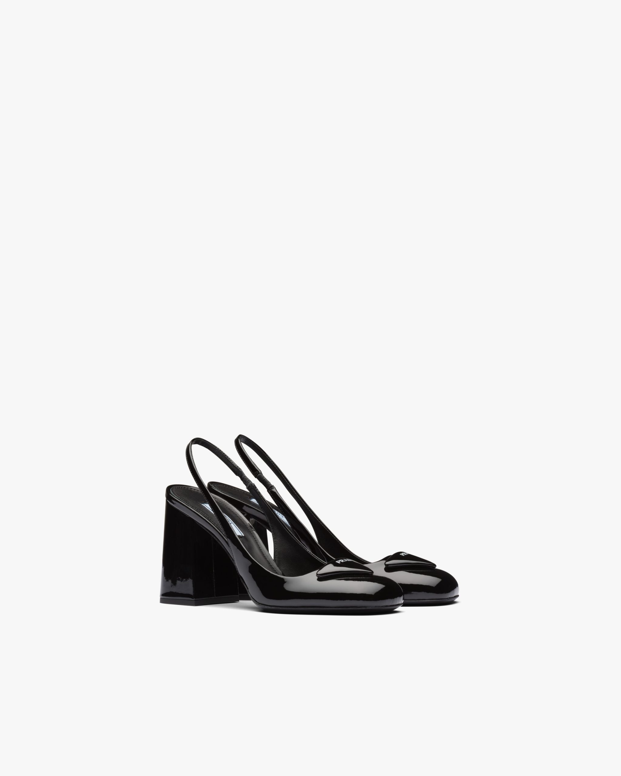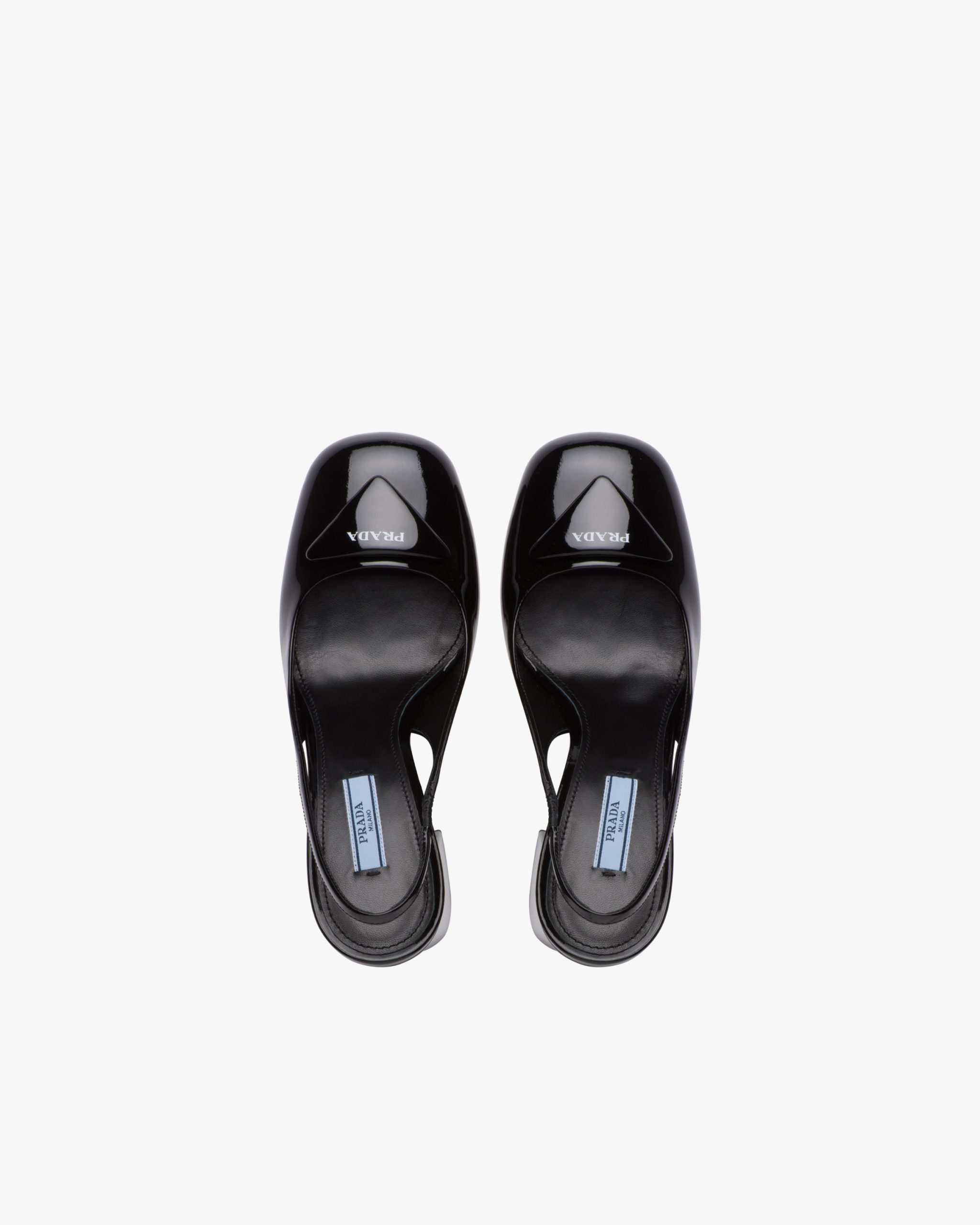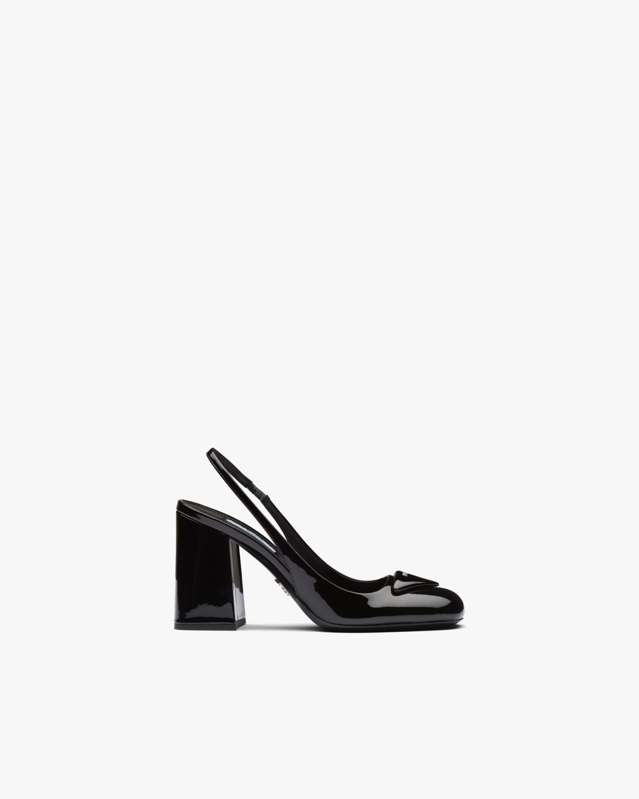 A new variation transforms the brand’s iconic triangle into a slightly padded leather detail and is accented with the screen-printed Prada logo2. The geometric element decorates the toe of these patent leather slingback pumps characterized by a sophisticated silhouette and elegant charm.