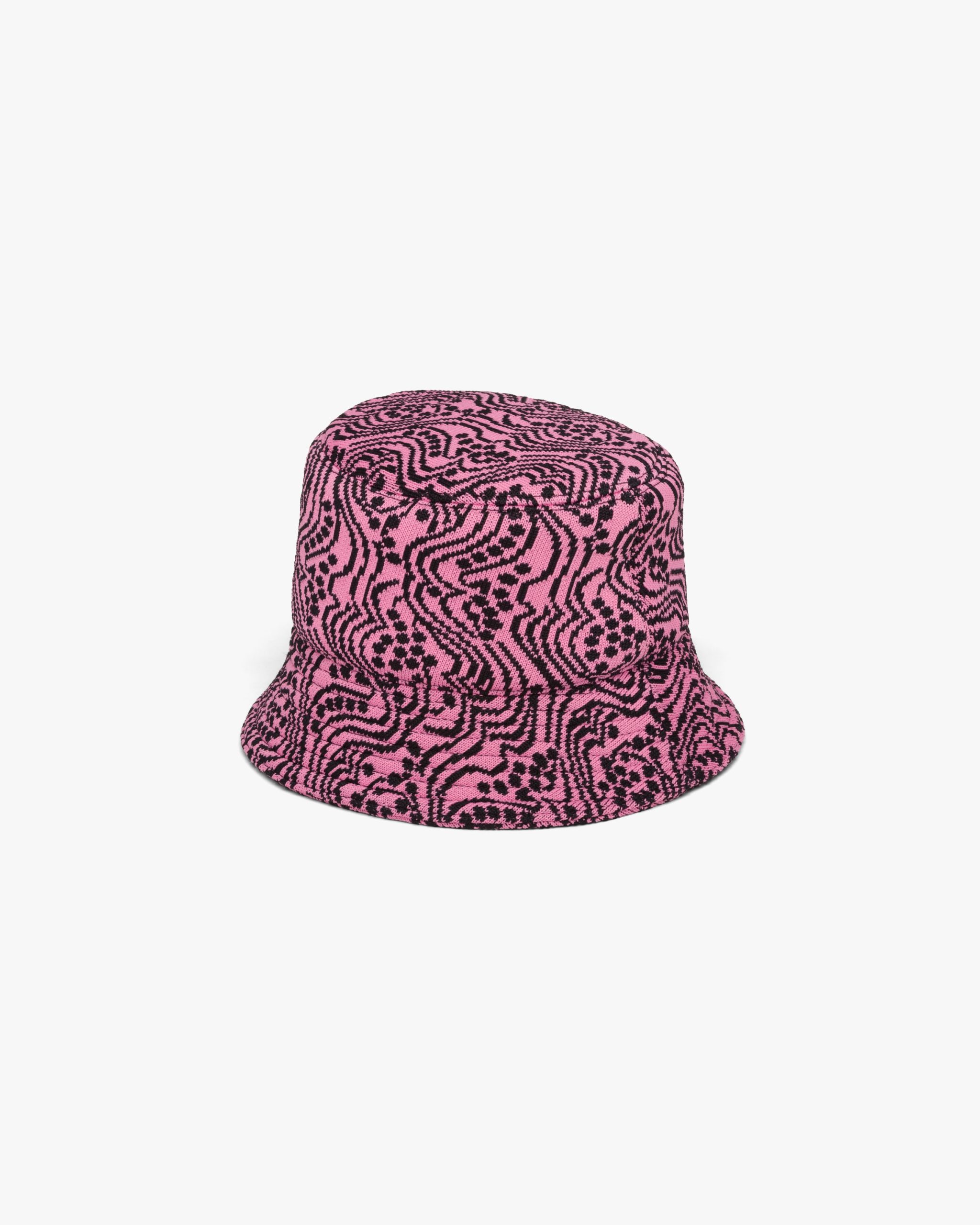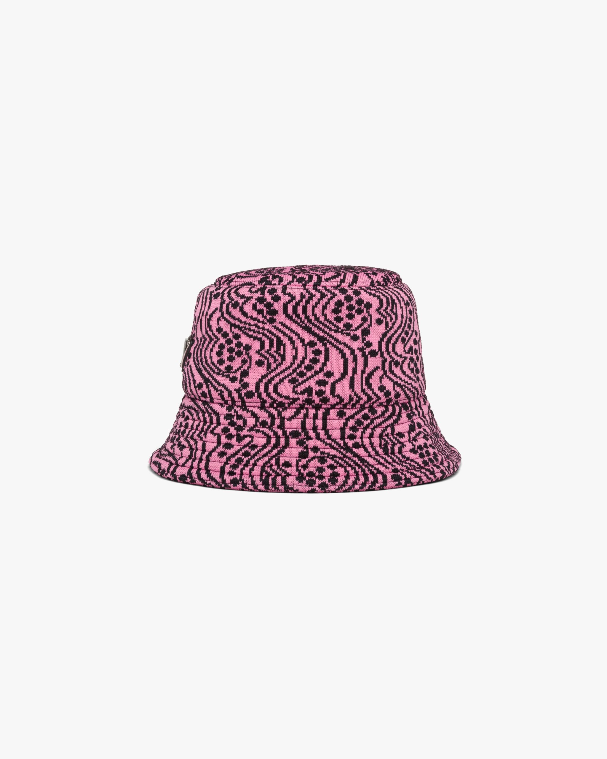 Geometric jacquard patterns that recall a sixties design animate the classic bucket hat, reinterpreted with sophisticated allure for the Fall/Winter 2021 season. The enameled metal lettering logo2 decorates the accessory.