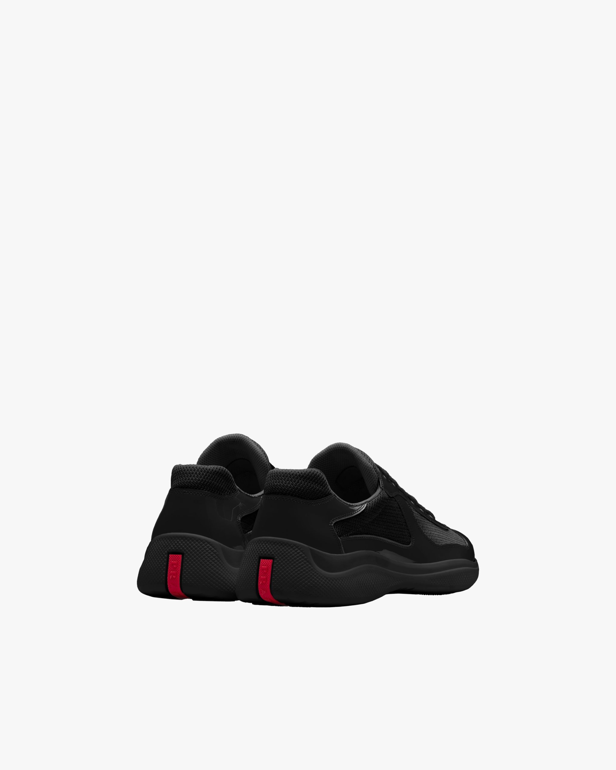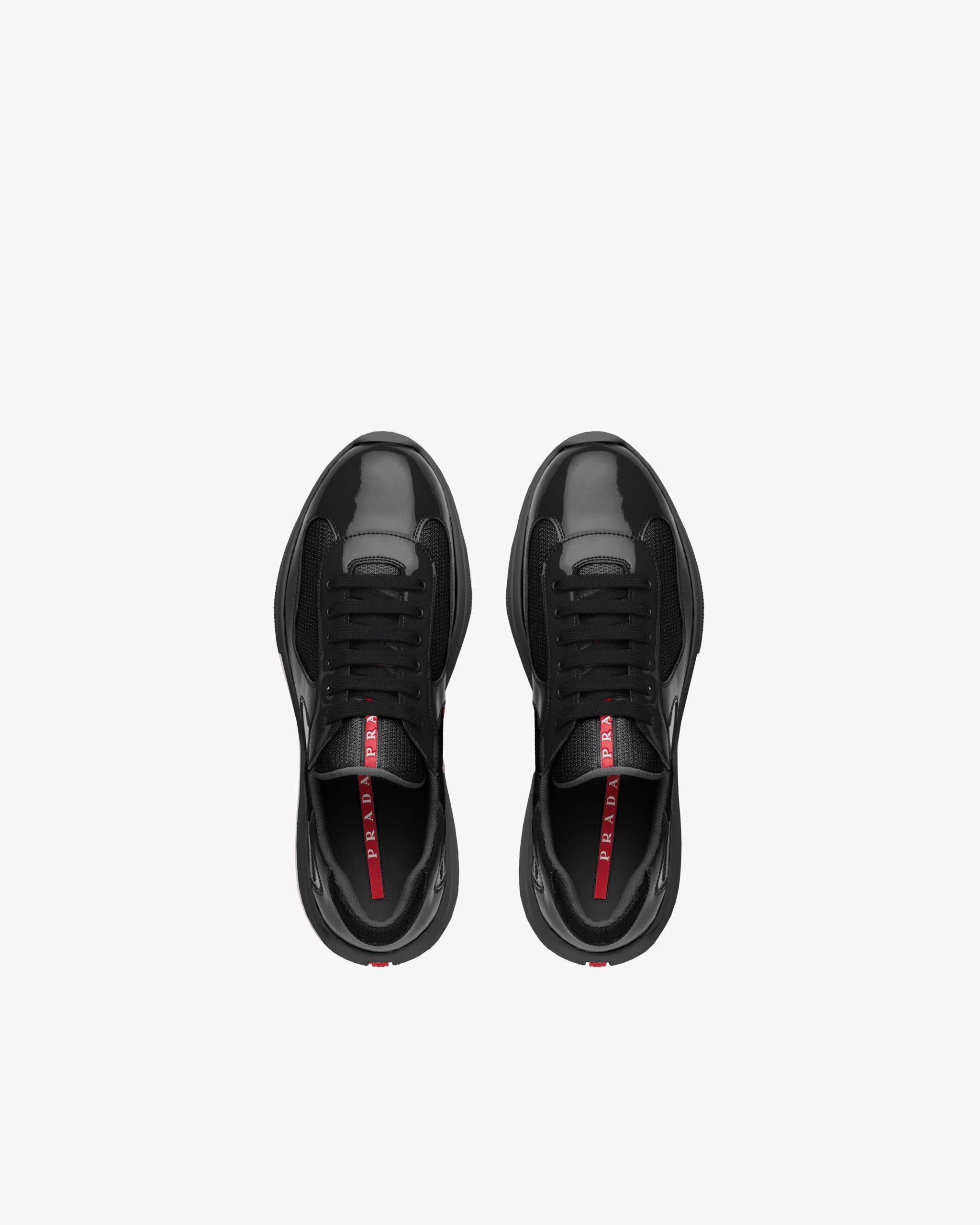 These patent leather sneakers with bike fabric inserts are inspired by an iconic aesthetic. The unmistakable Prada Linea Rossa logo2 on the tongue and sole enhances the design.