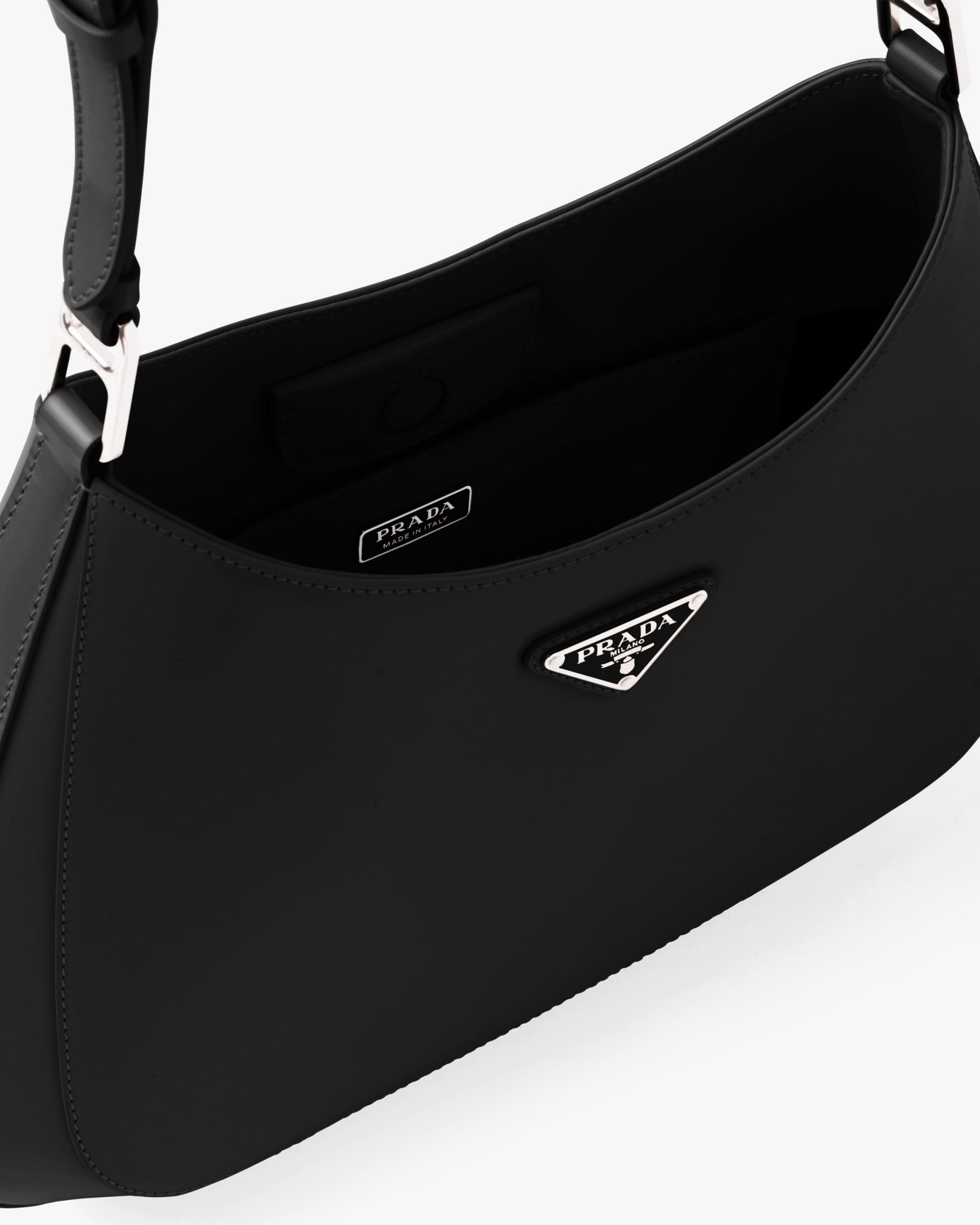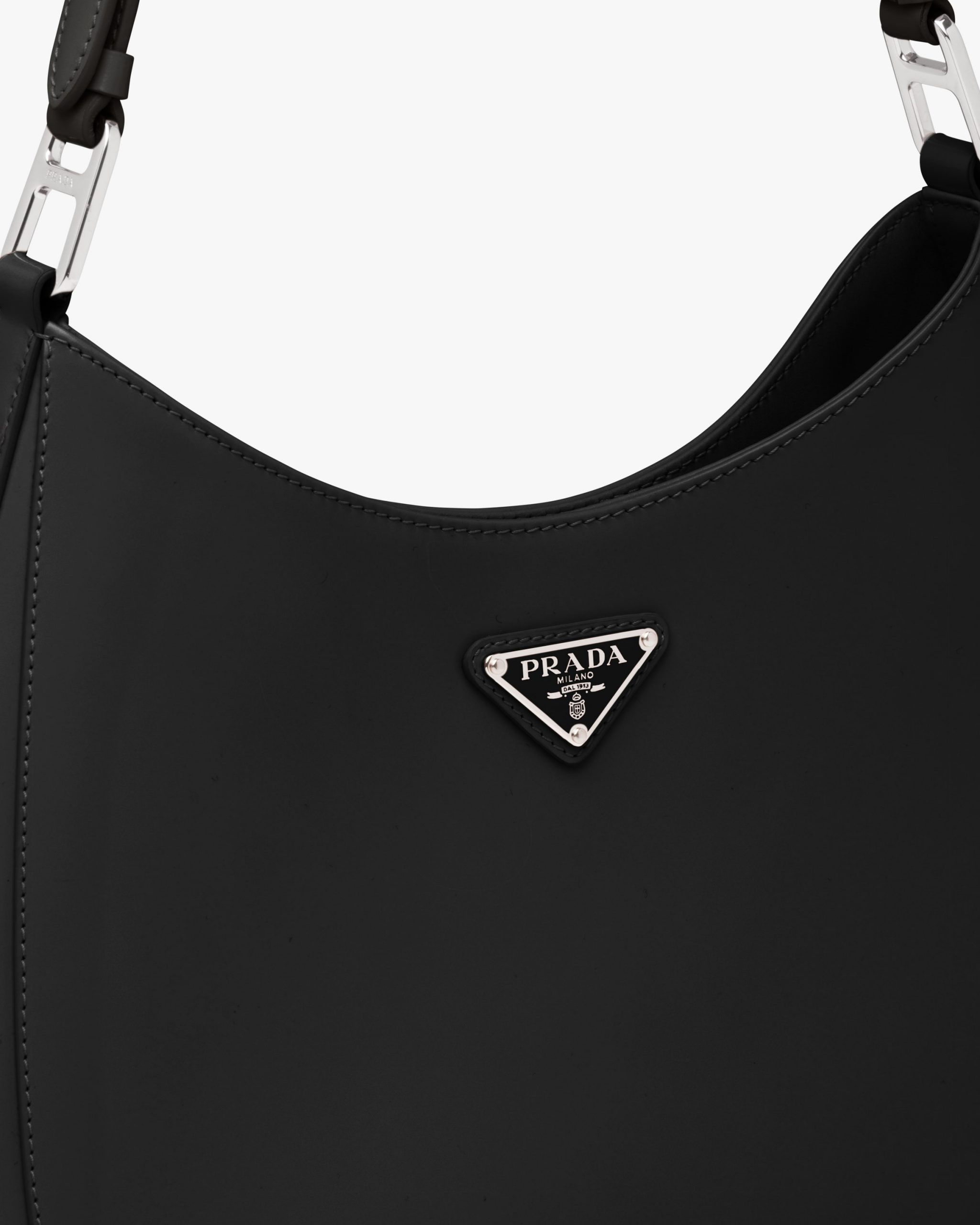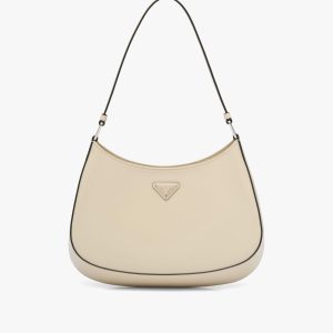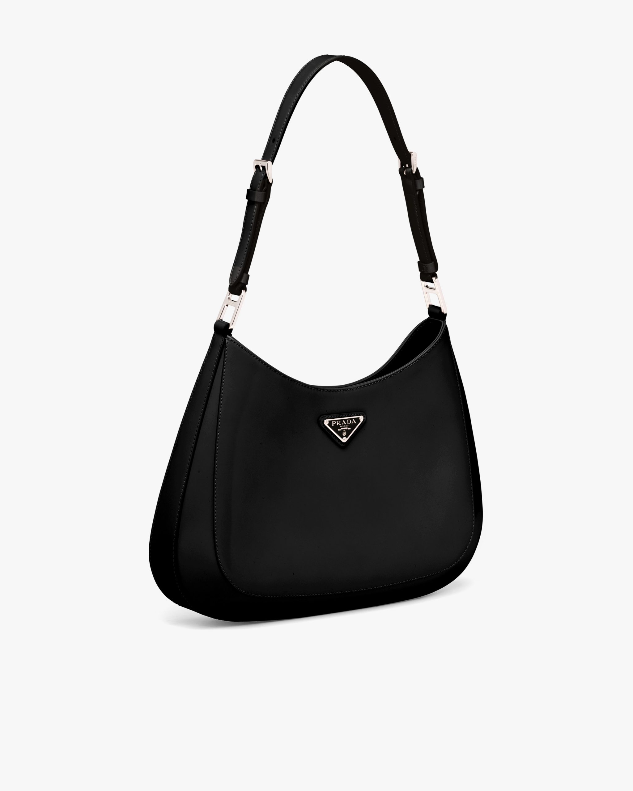 The Prada Cleo bag with sophisticated allure reinterprets an iconic design of the brand from the nineties. The sleek, curved lines emphasized by the particular sloped construction of the bottom and sides give this hobo bag a soft, light look. Brushed leather, a distinctive element of Prada collectsions, is a modern and versatile material that lends itself to always new combinations and contrasts. The enamel triangle logo2 decorates the silhouette.