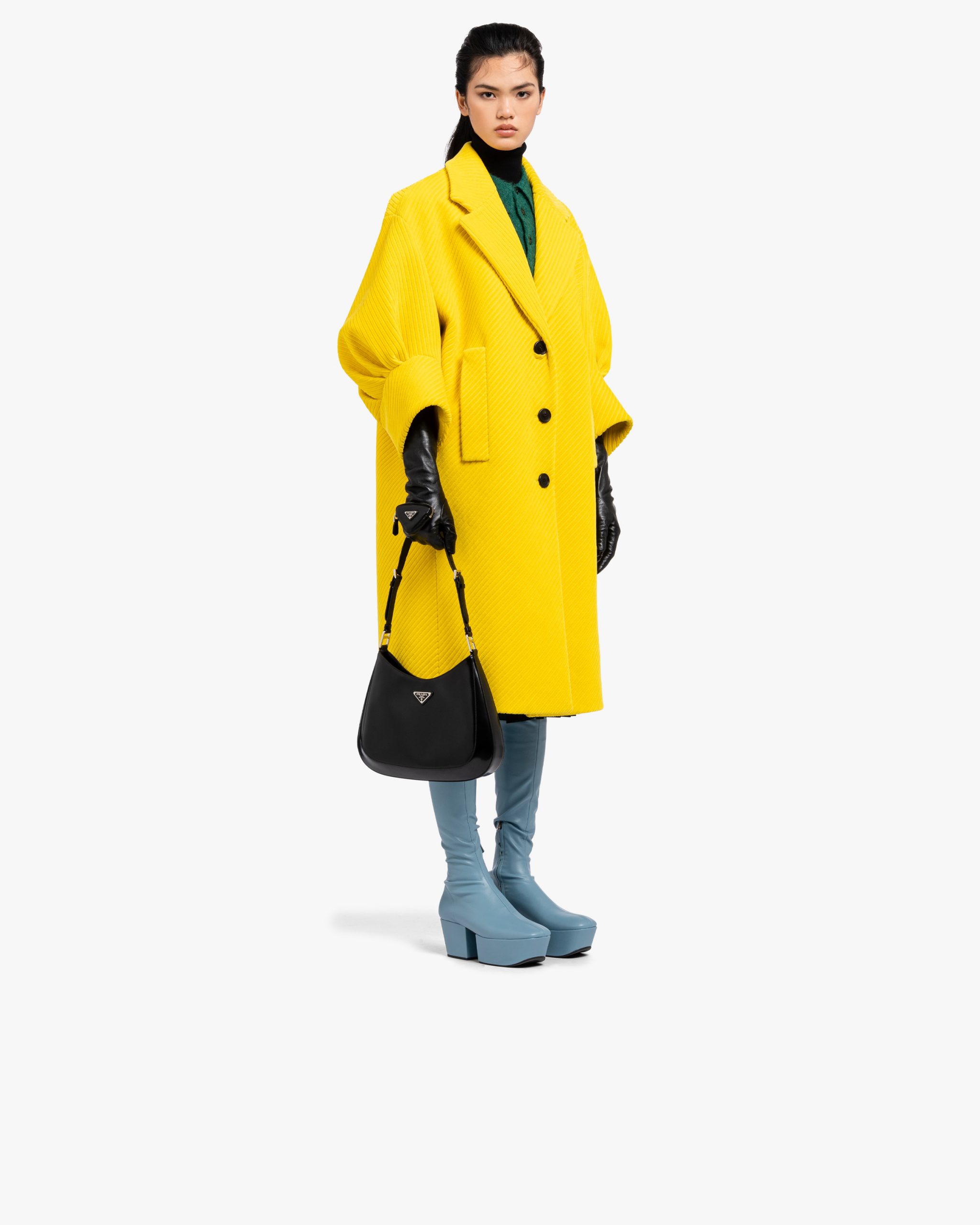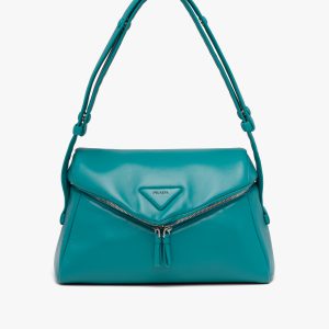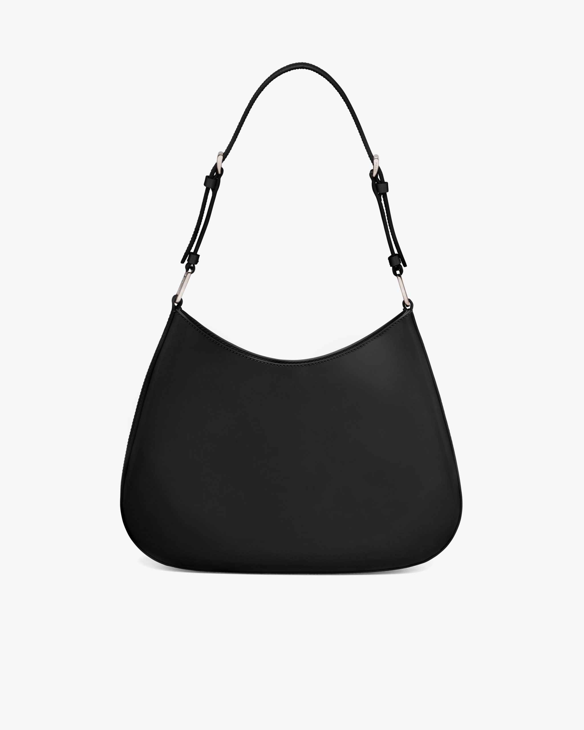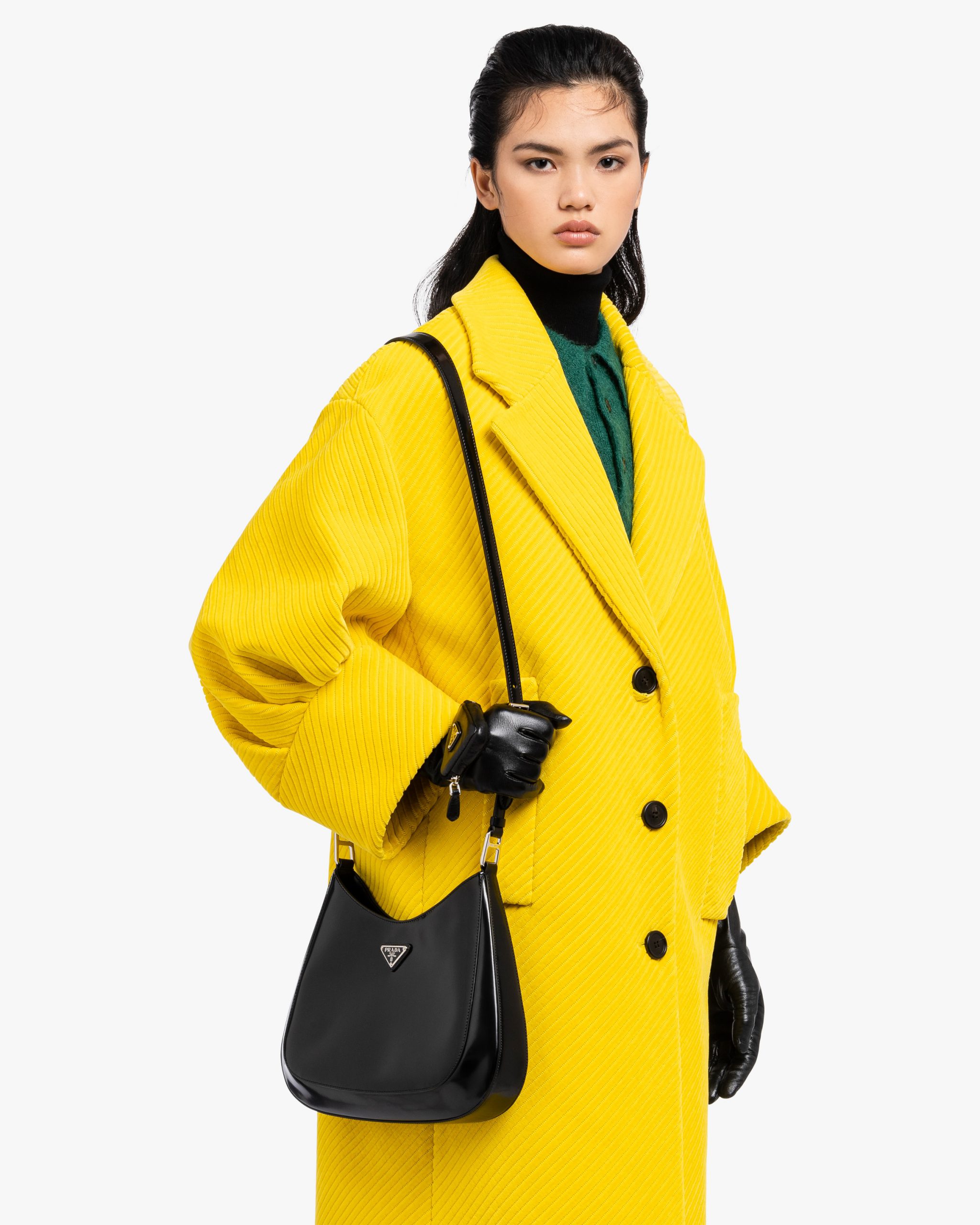 The Prada Cleo bag with sophisticated allure reinterprets an iconic design of the brand from the nineties. The sleek, curved lines emphasized by the particular sloped construction of the bottom and sides give this hobo bag a soft, light look. Brushed leather, a distinctive element of Prada collectsions, is a modern and versatile material that lends itself to always new combinations and contrasts. The enamel triangle logo2 decorates the silhouette.