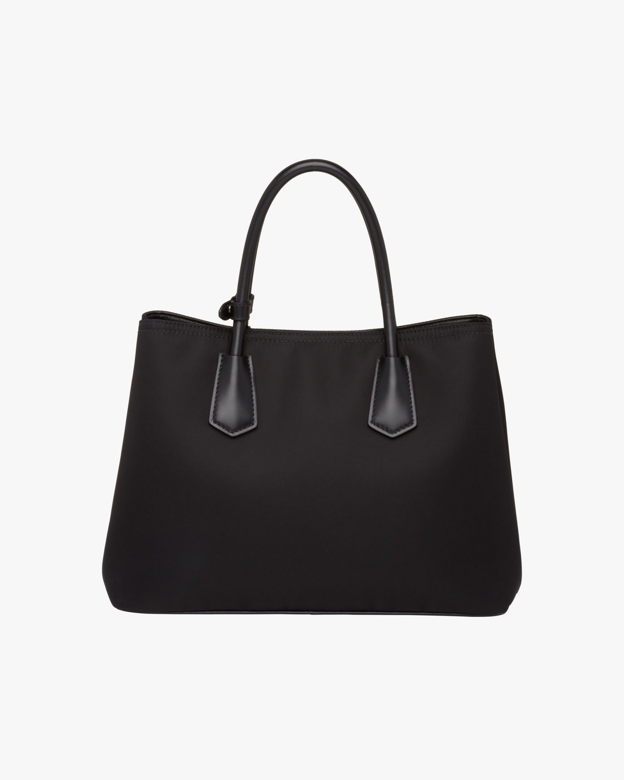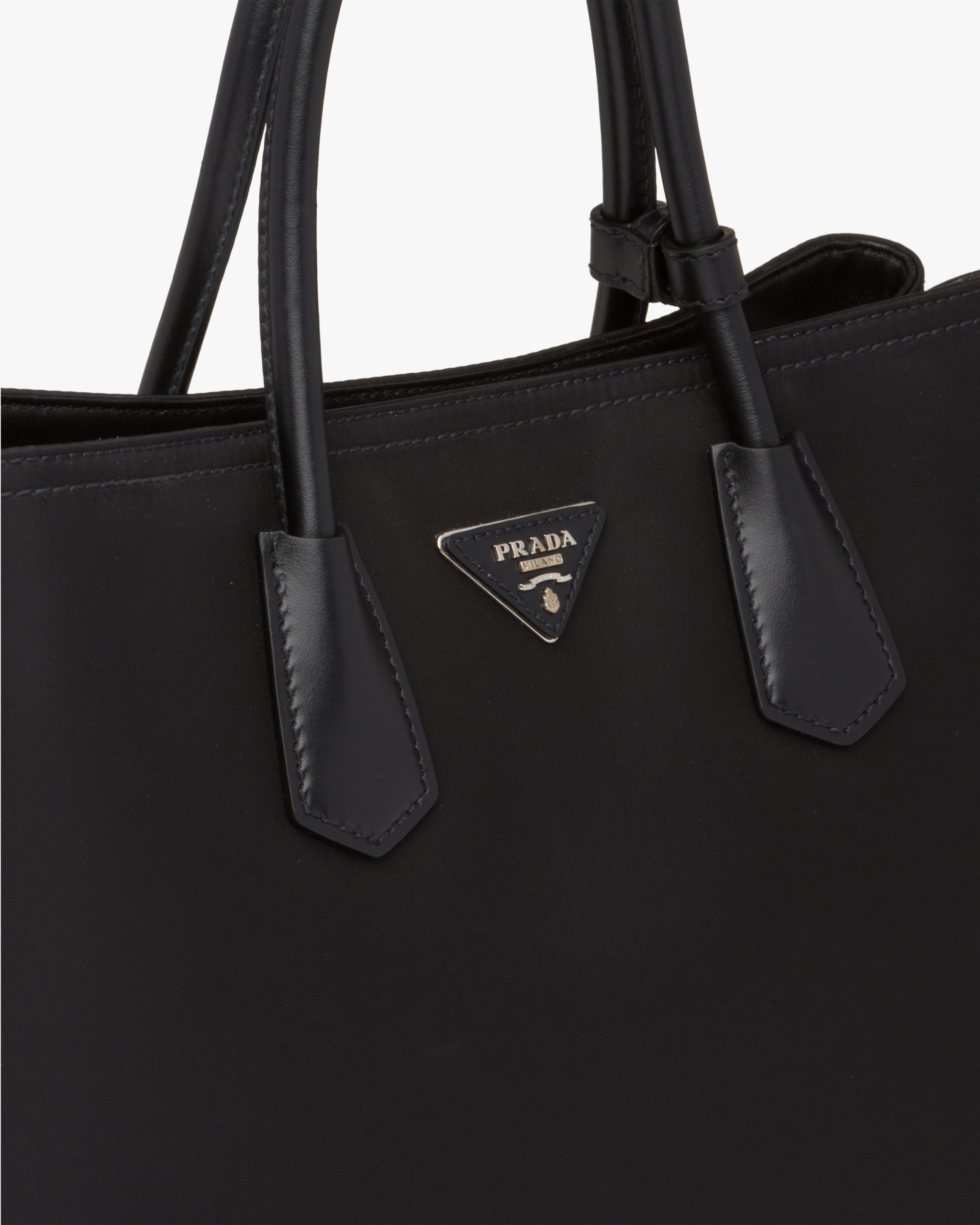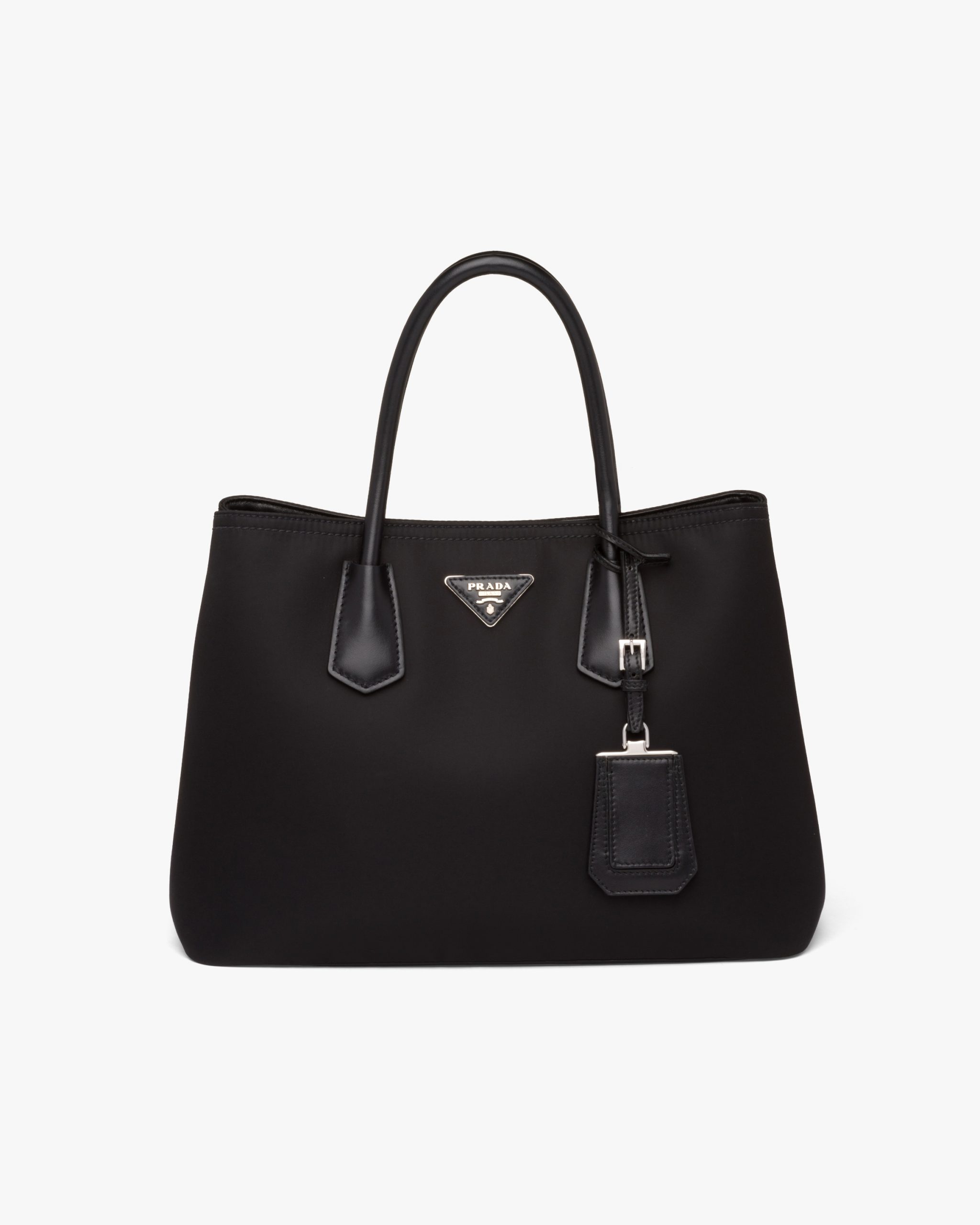 This unmistakable Prada Double bag is a new version that combines two iconic materials of the brand: Saffiano leather and nylon. The accessory with snap closure on the sides has leather handles and a detachable shoulder strap. It has a leather name tag with metal trim and is decorated with the metal lettering logo2.