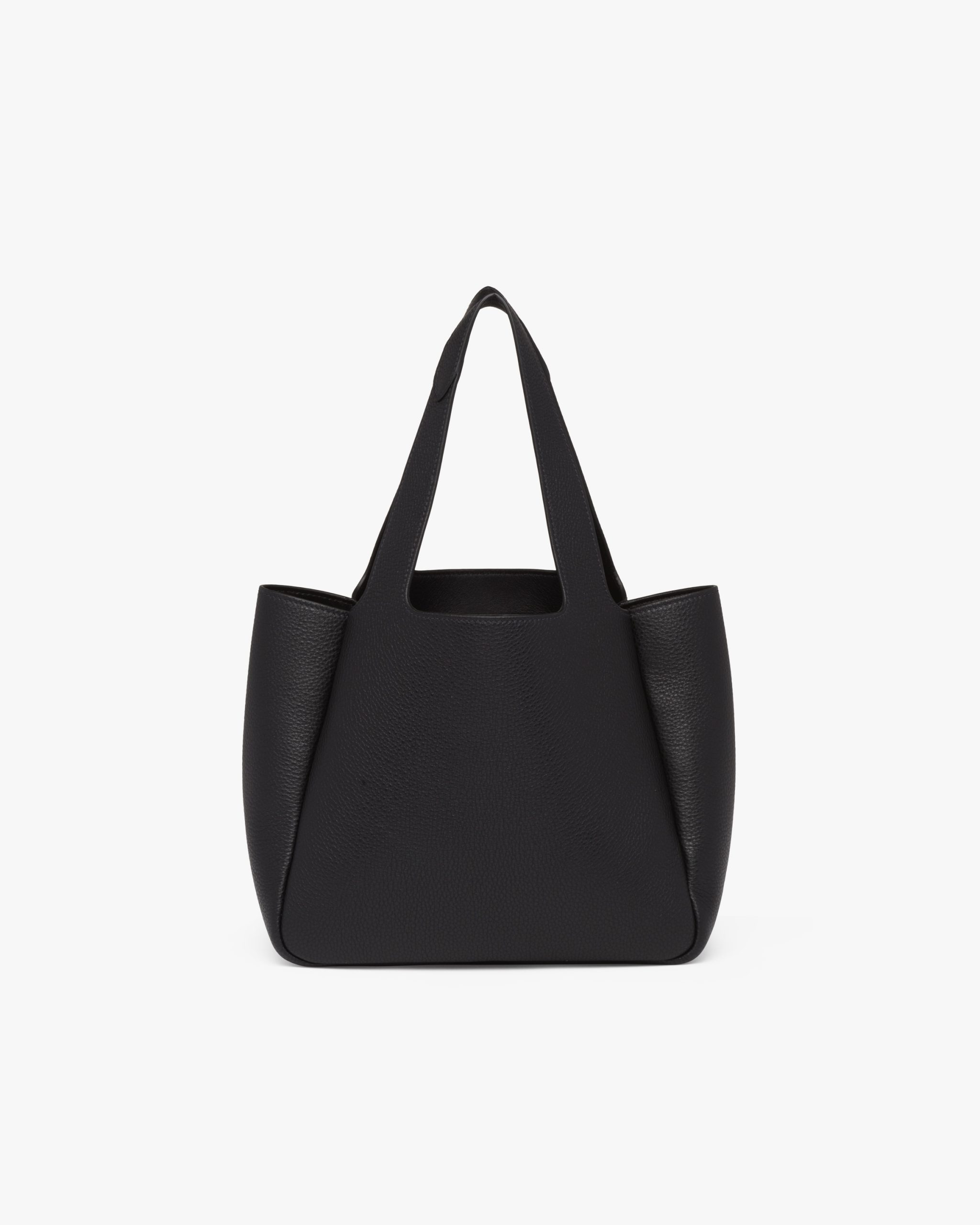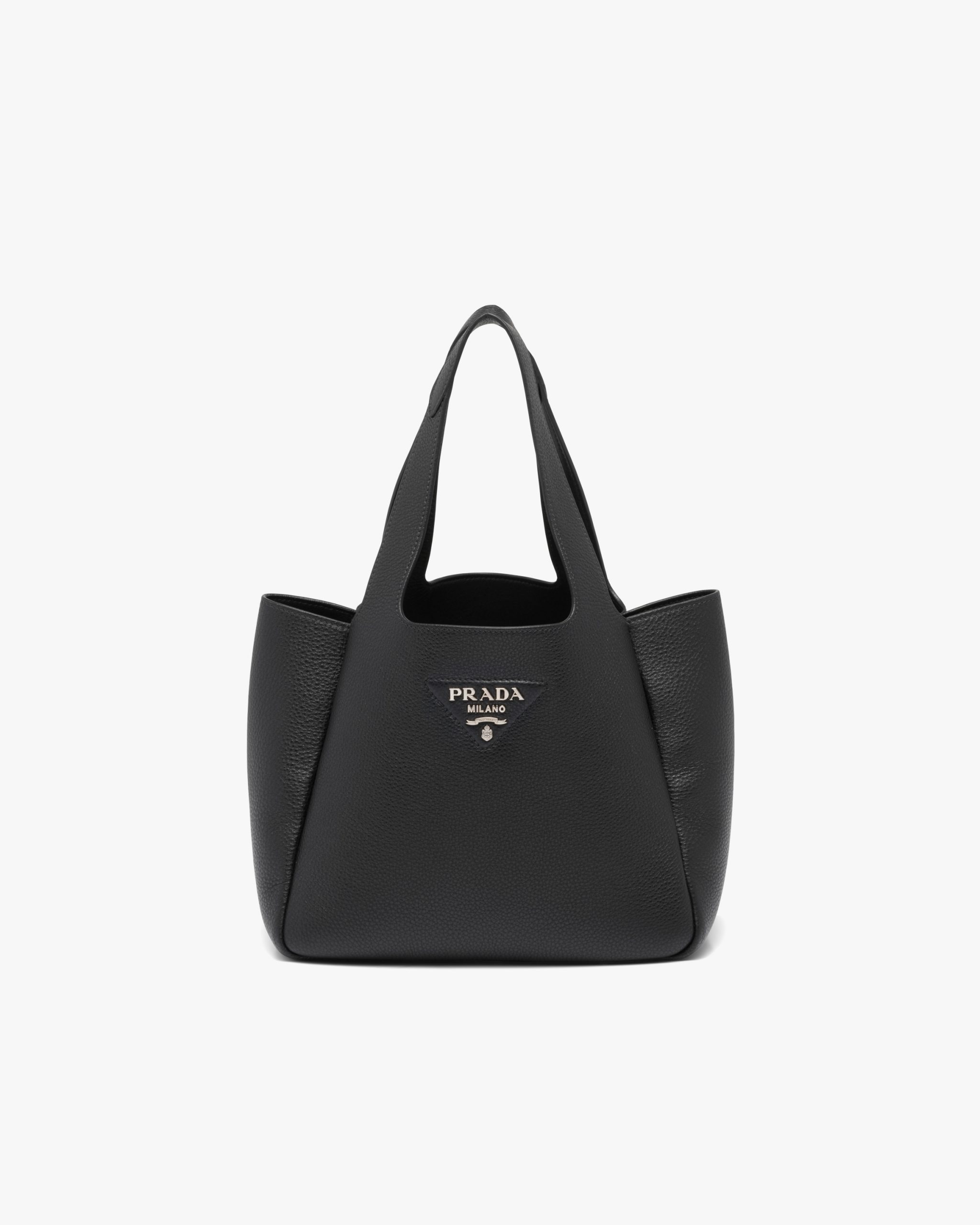 This soft Prada Flou leather tote introduced for the Fall Winter 2020 collectsion presents a new interpretation of the triangle logo2, traced by stitching with the Prada metal lettering logo2 illuminating its center. The reverse stitching emphasizes the soft, rounded silhouette that comes with a double leather handle and magnetic button closure. The nappa interior has three compartments.