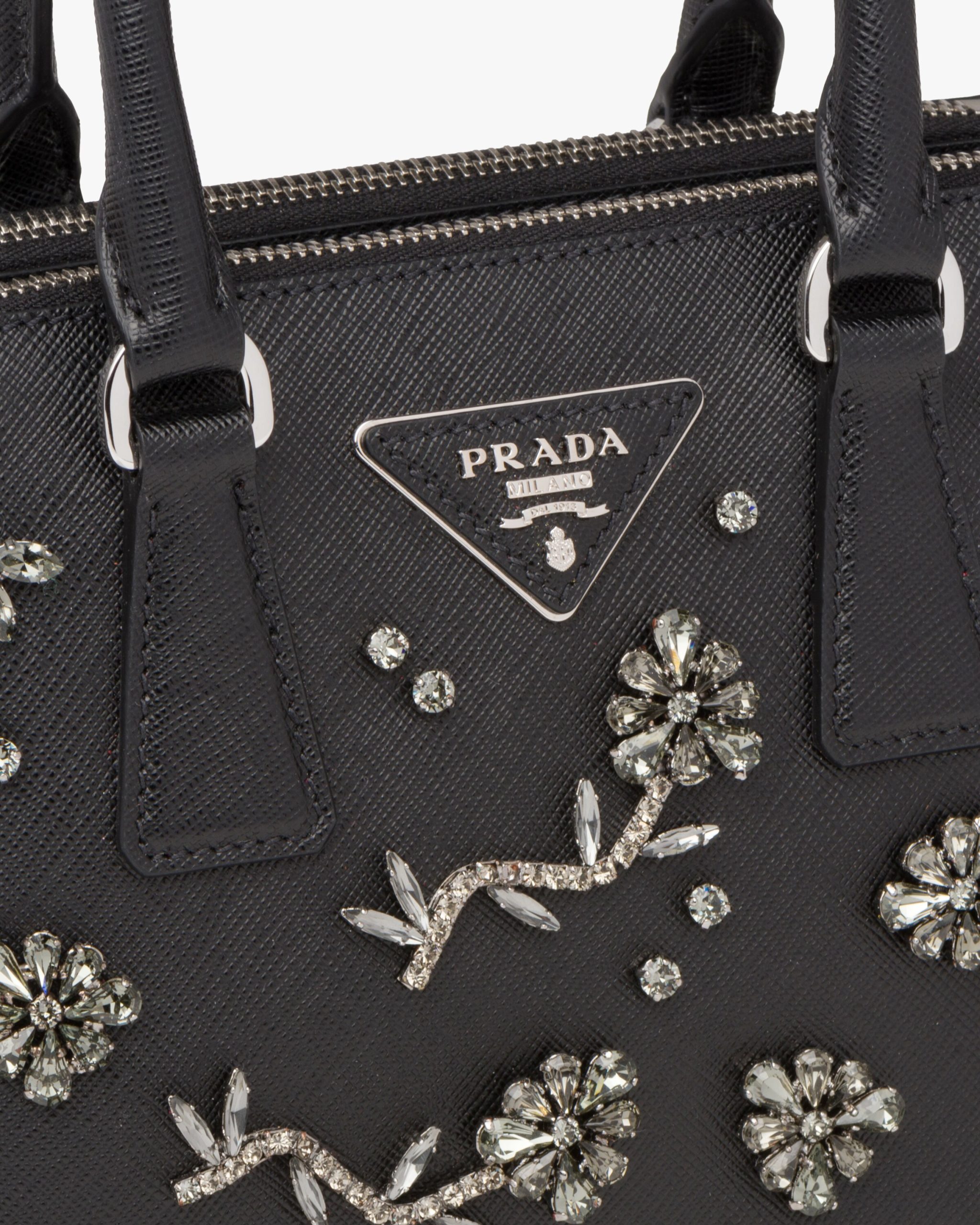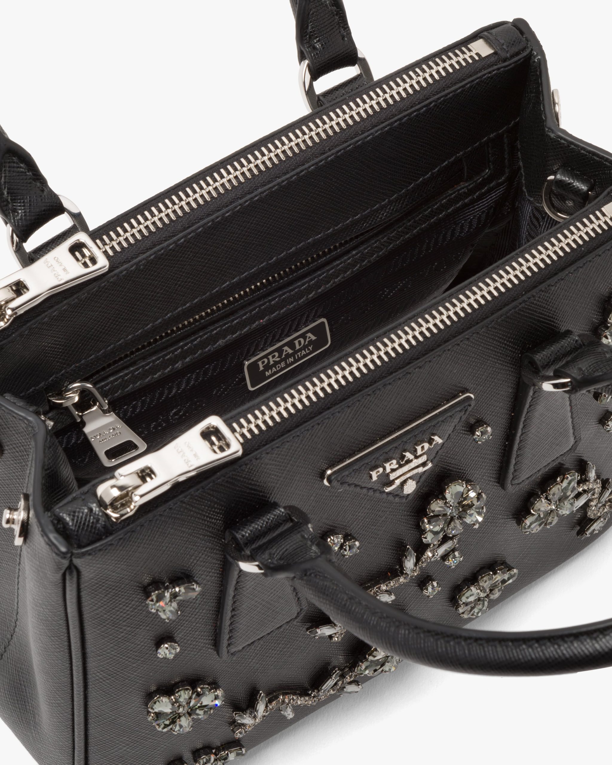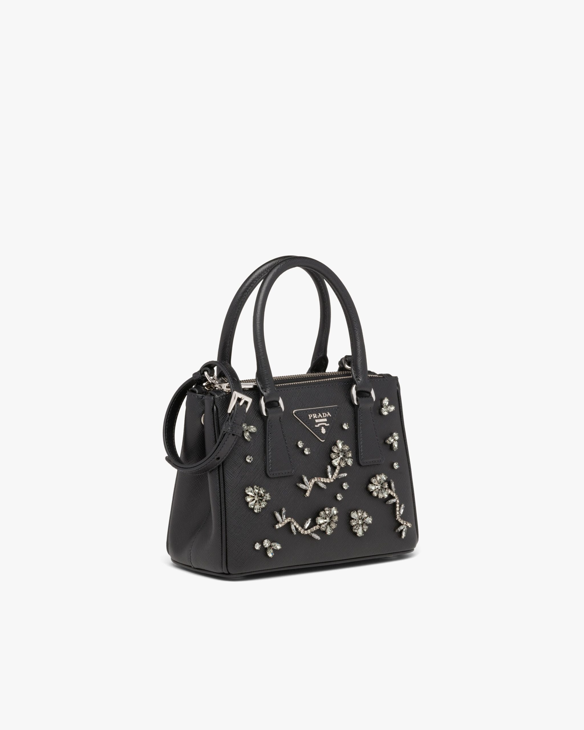 Romantic floral appliqu?s characterize this Prada Galleria bag, the quintessence of timeless elegance, that owes its name to the historic Prada store that Mario Prada opened back in 1913 in Galleria Vittorio Emanuele II in Milan. The accessory, made of iconic Saffiano leather with a crosshatch texture, is decorated with the leather triangle logo2 and gold-tone hardware.