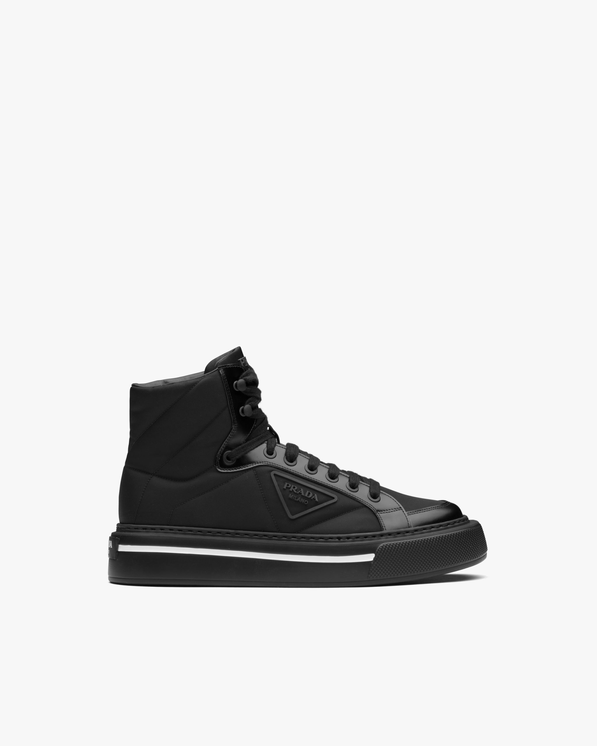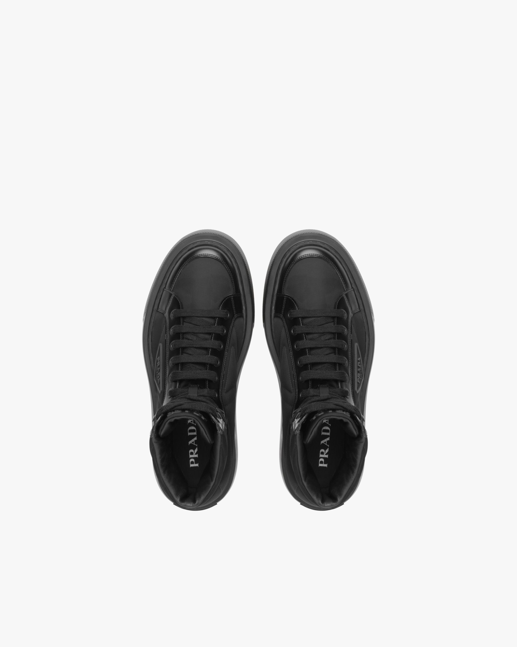 Defined by a design with a lightweight sole and rubber triangle logo2, these sneakers are characterized by a mix of iconic Prada materials: brushed leather and Re-Nylon, made from recycled and purified plastic trash collectsed in oceans, fishing nets and textile waste fibers.