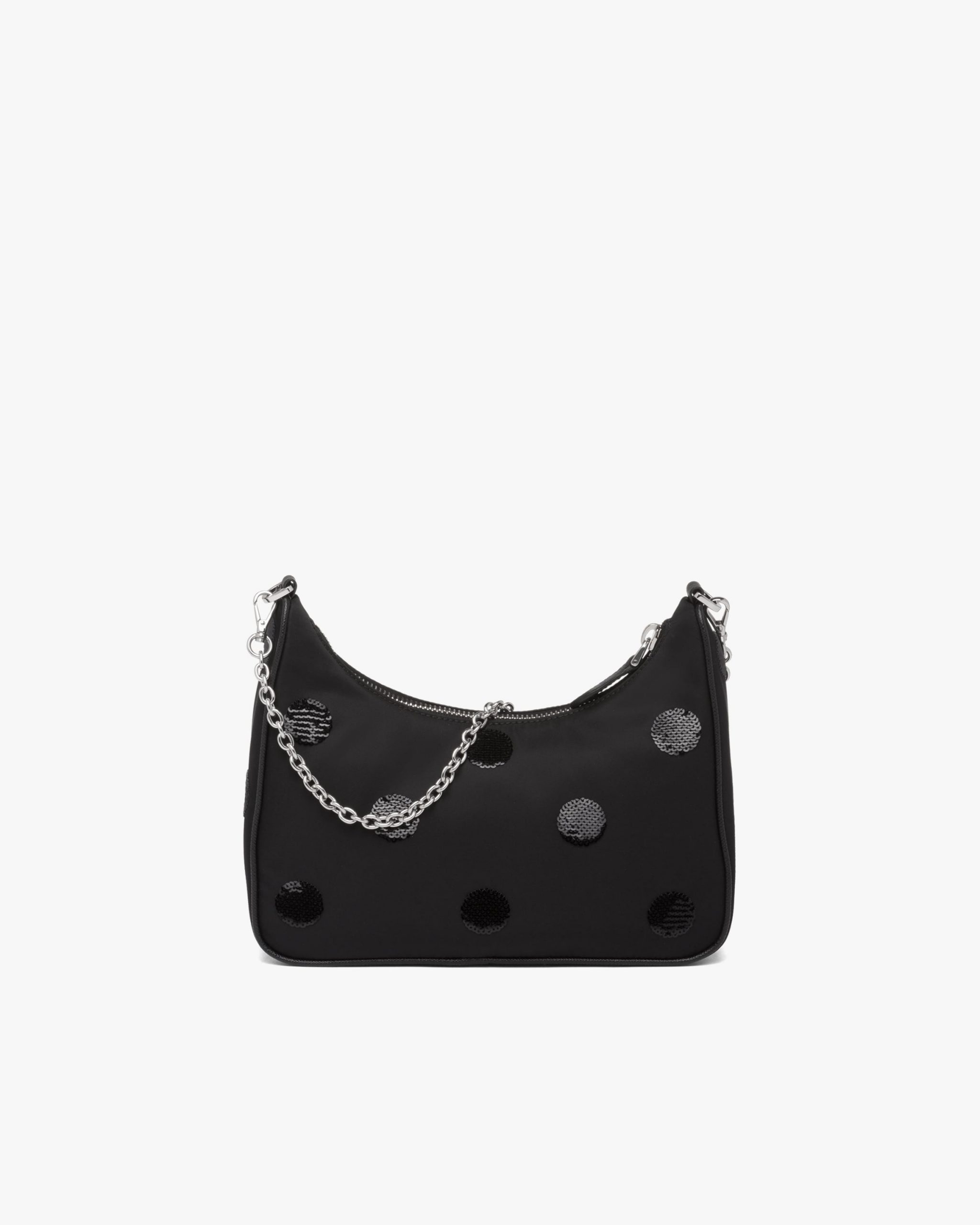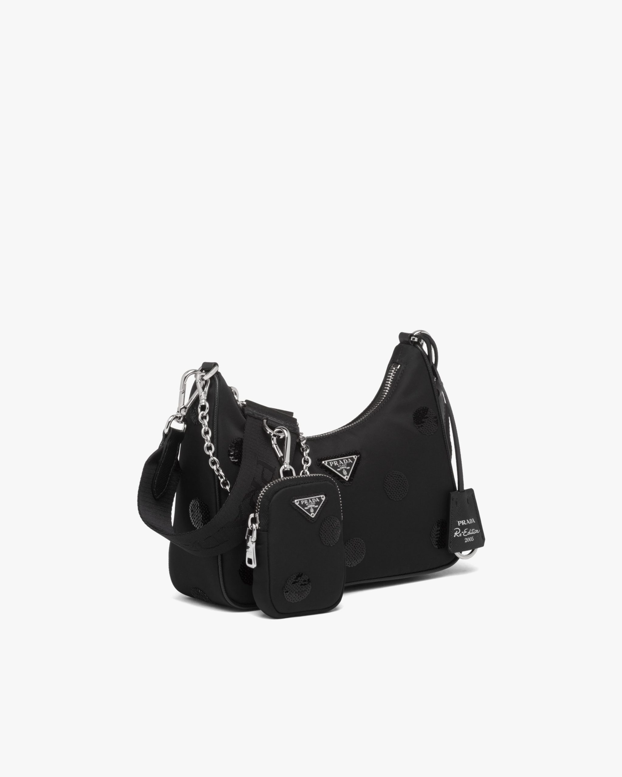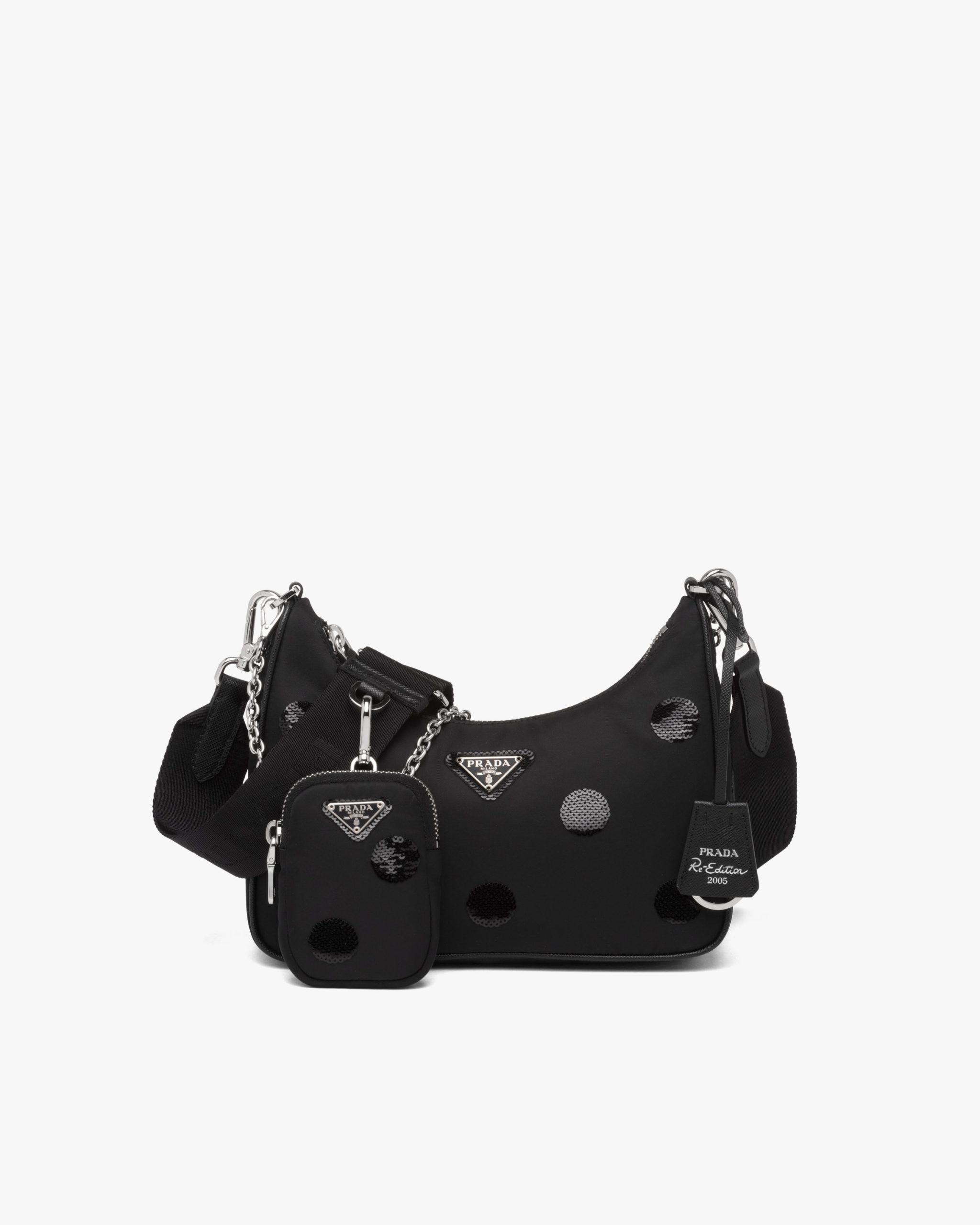 A new interpretation of an iconic Prada style, the Re-Edition 2005 bag is covered with an embroidered sequined polka-dot motif. The design is made of innovative Re-Nylon, produced from recycled, purified plastic materials collectsed in the ocean, fishing nets, and textile fibers. Completed with a coordinated pouch that attaches to the shoulder strap, the bag can be worn in different ways due to the adjustable woven tape shoulder strap and chain handle.