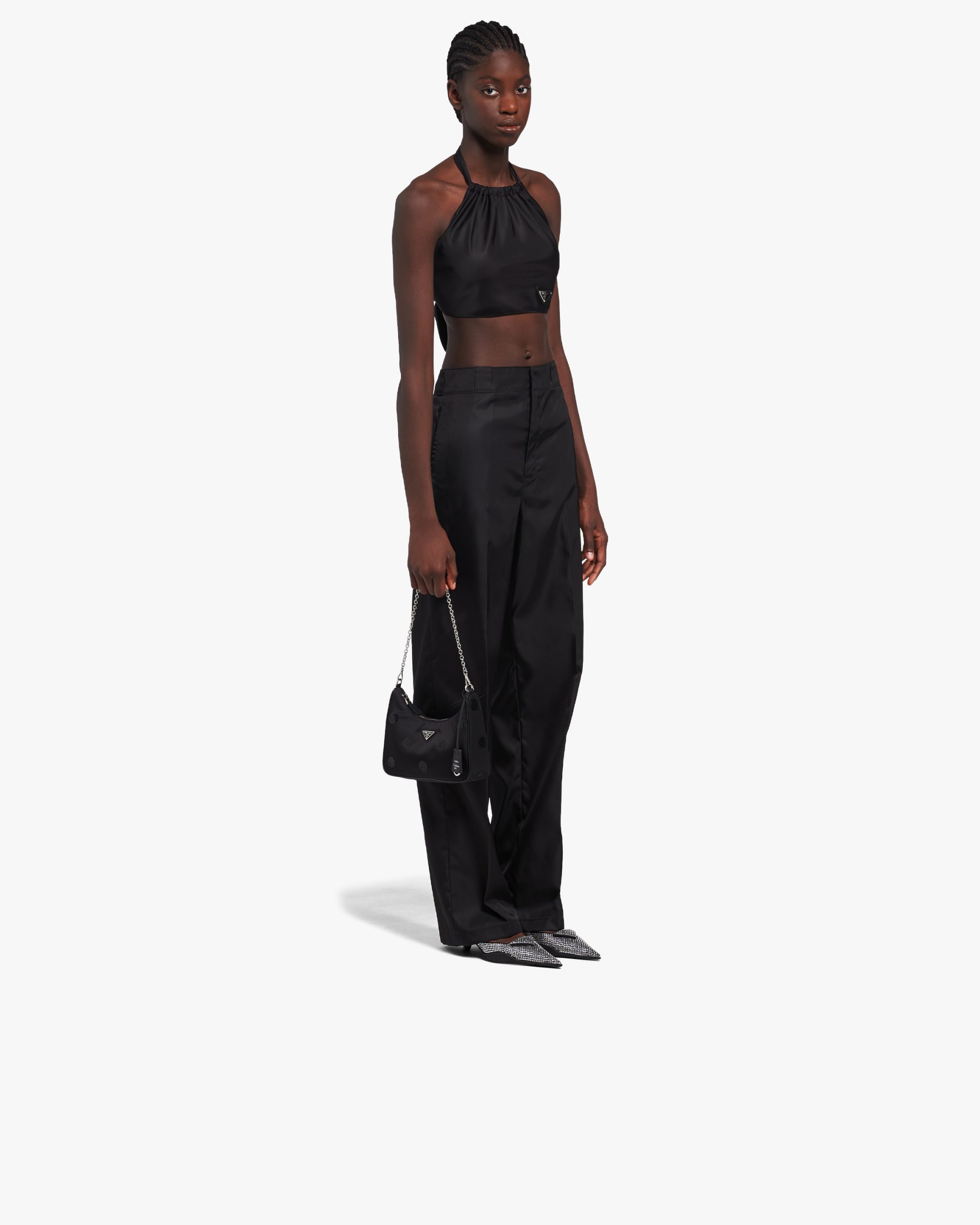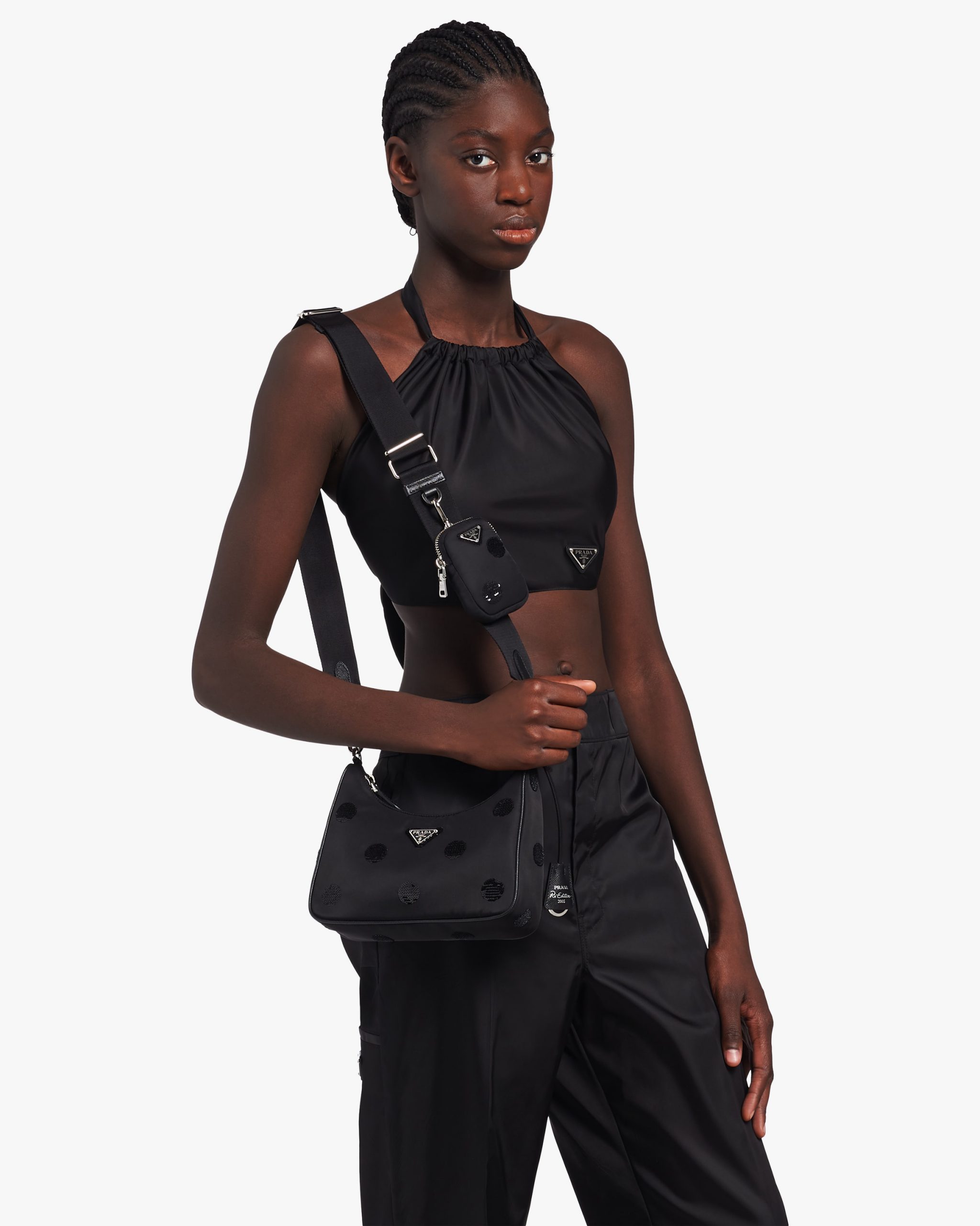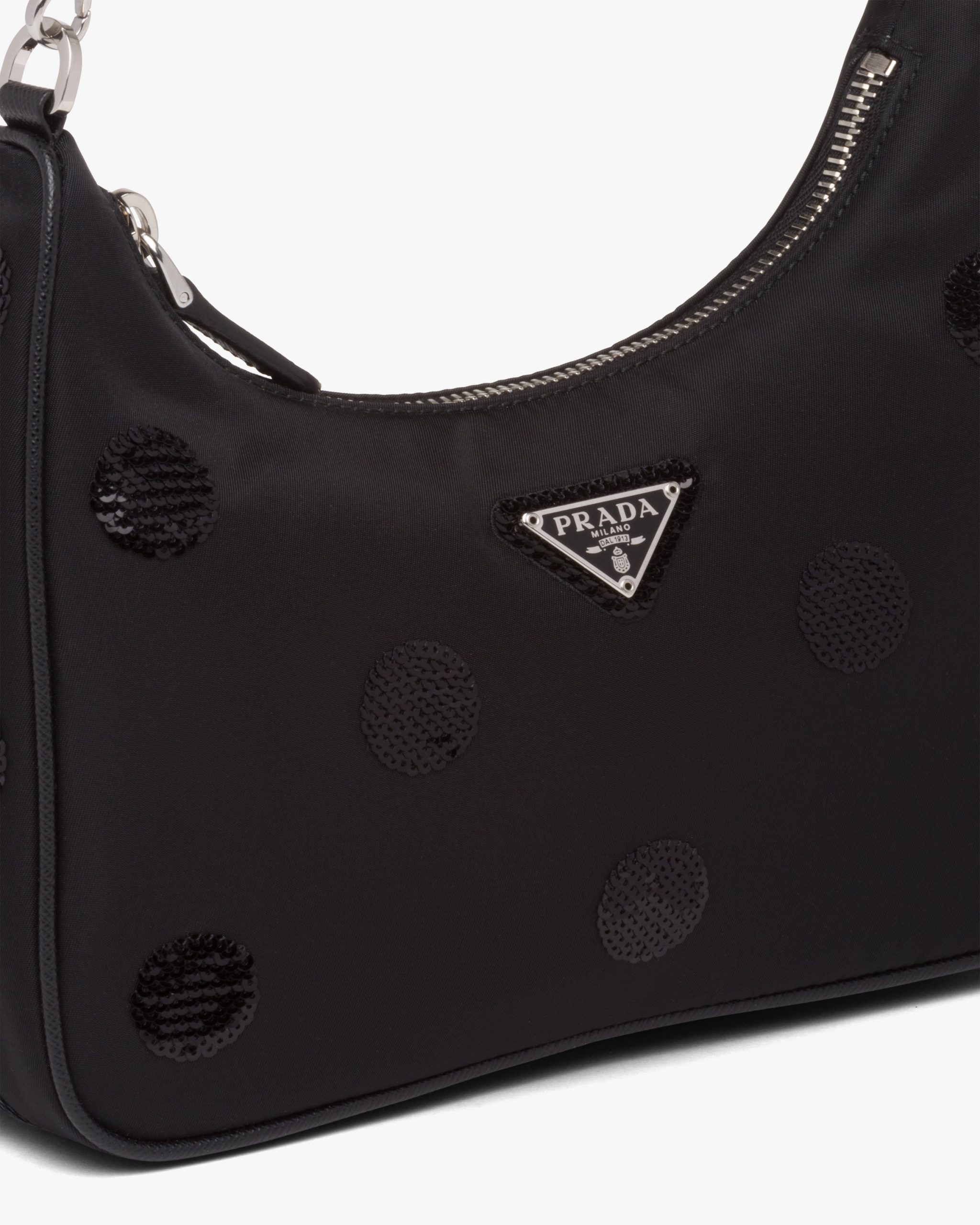 A new interpretation of an iconic Prada style, the Re-Edition 2005 bag is covered with an embroidered sequined polka-dot motif. The design is made of innovative Re-Nylon, produced from recycled, purified plastic materials collectsed in the ocean, fishing nets, and textile fibers. Completed with a coordinated pouch that attaches to the shoulder strap, the bag can be worn in different ways due to the adjustable woven tape shoulder strap and chain handle.