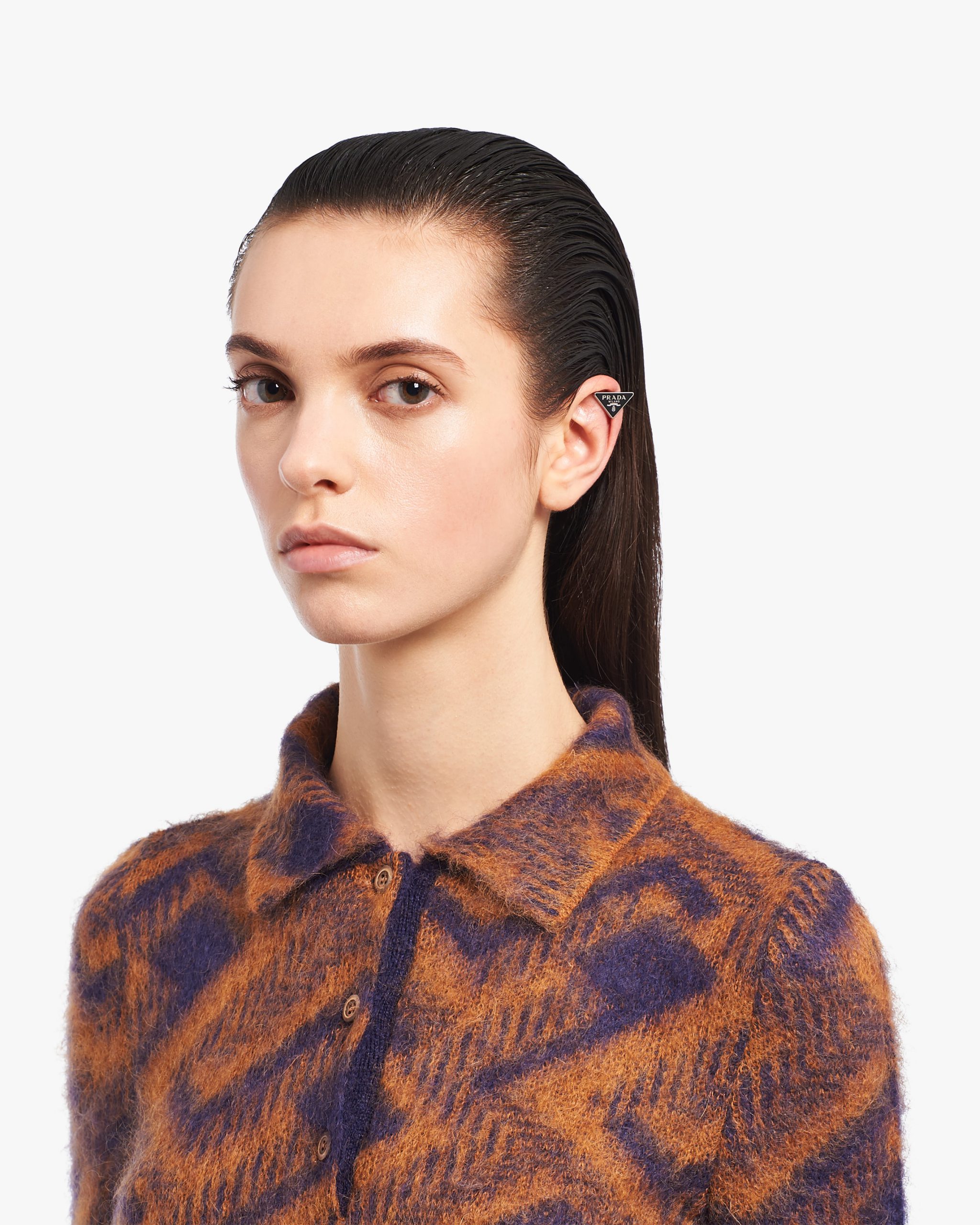 The sleek, iconic triangle logo2 is the protagonist of a new jewelry line made of 925 sterling silver that reinterprets punk influences in a modern way. Prada’s historic code with an enamel finish defines this single clip earring.