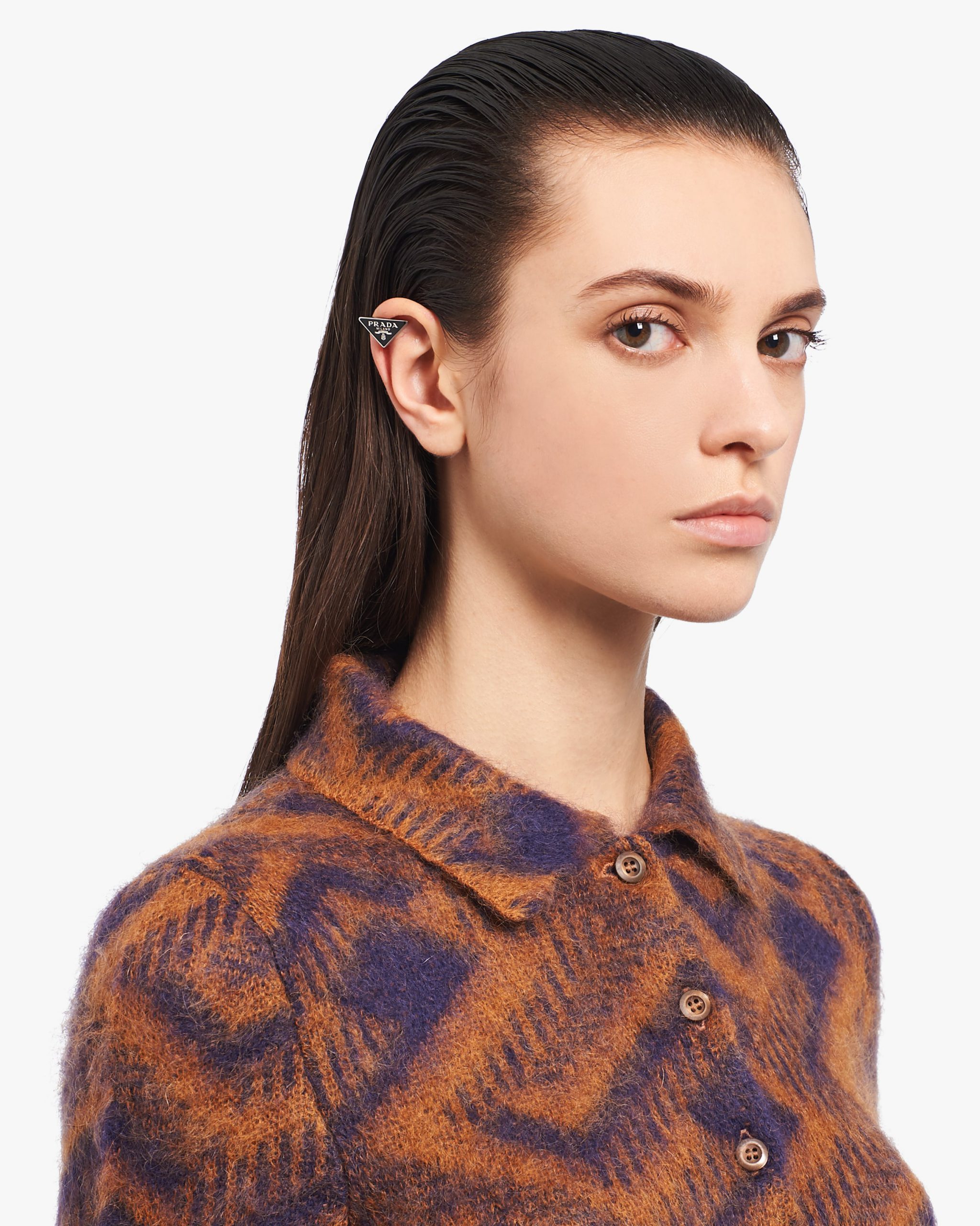 The sleek, iconic triangle logo2 is the protagonist of a new jewelry line made of 925 sterling silver that reinterprets punk influences in a modern way. Prada’s historic code with an enamel finish defines this single clip earring.