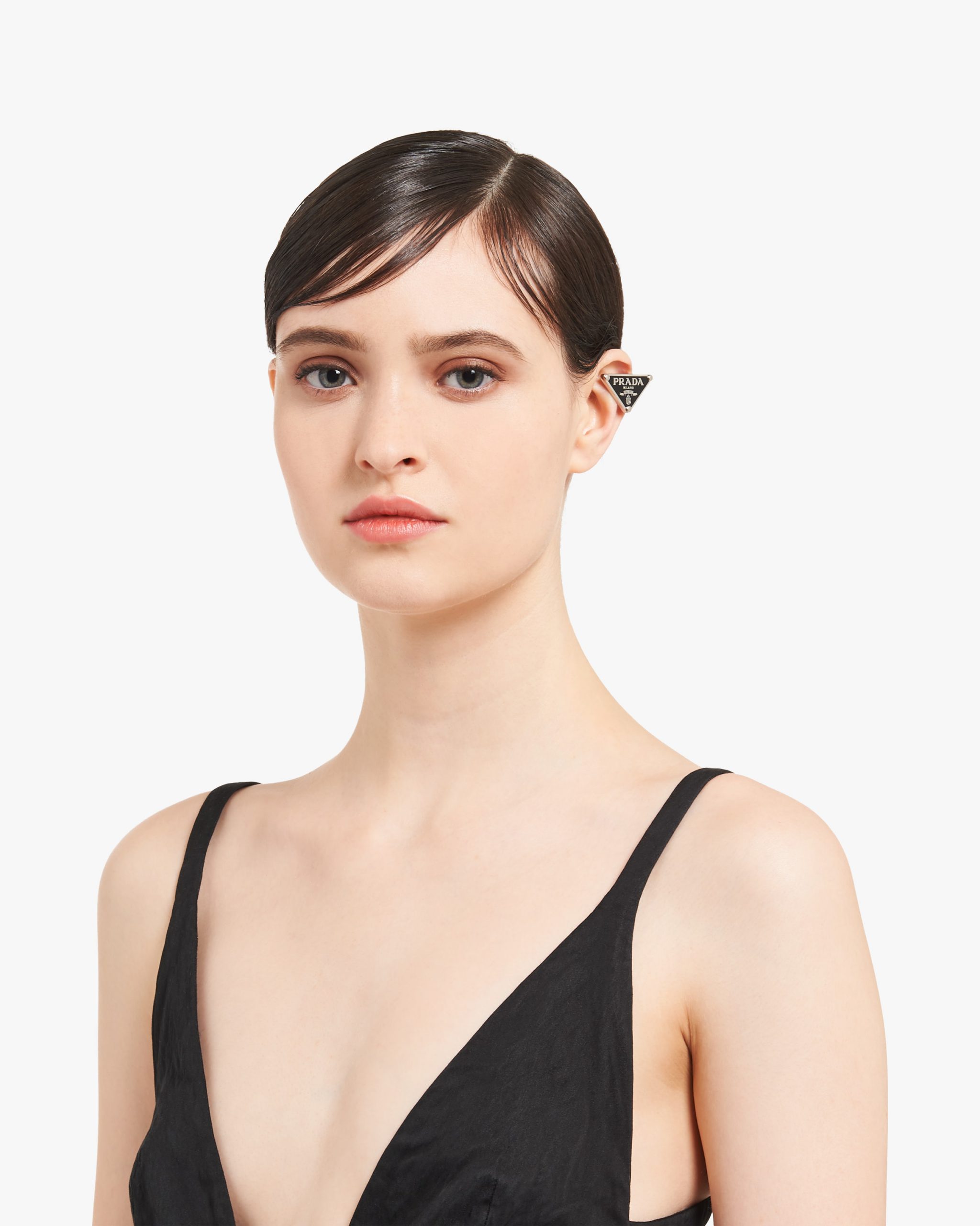Prada’s historic symbol decorated with enamel defines this single earring worn on the left. Iconic and sleek, the triangle logo2 is the protagonist of a new line of jewelry made of 925 sterling silver that reinterprets punk influences in a modern way.