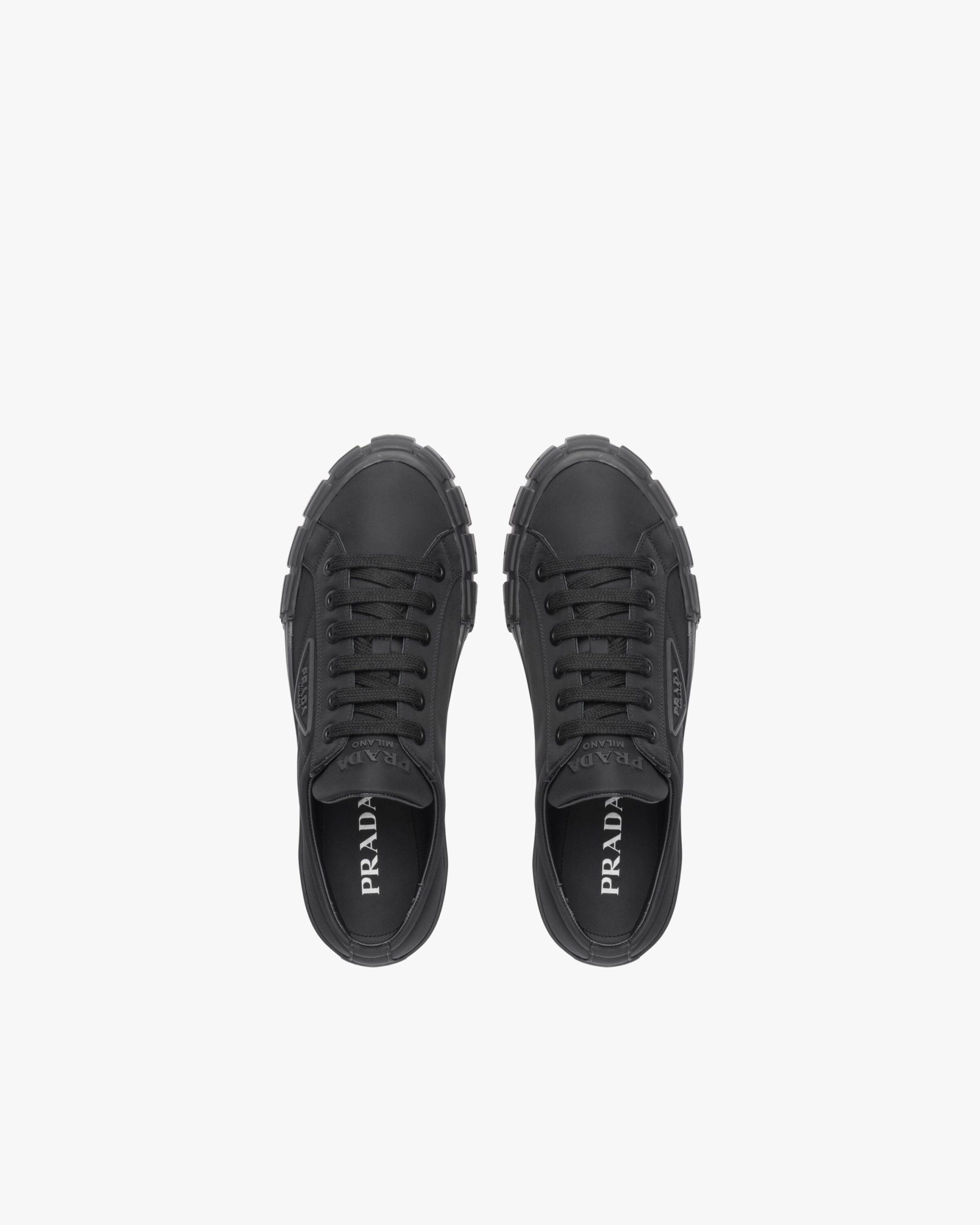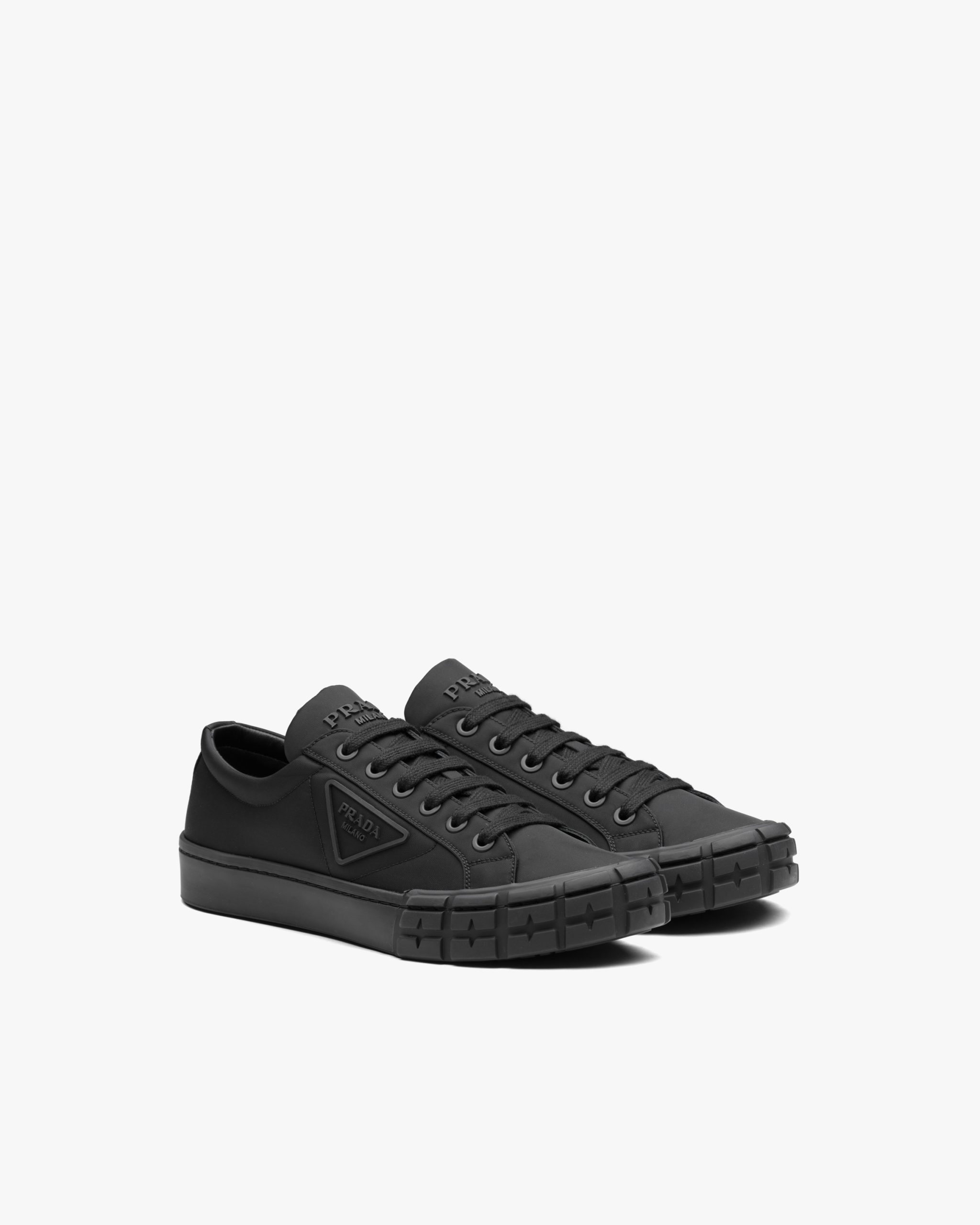 The Prada Wheel Cassetta sneakers in Re-Nylon Gabardine fabric have cotton laces and a distinctive tread sole with herringbone pattern. The shoes are decorated with the iconic rubber triangle logo2 on the upper and the lettering logo2 on the tongue.