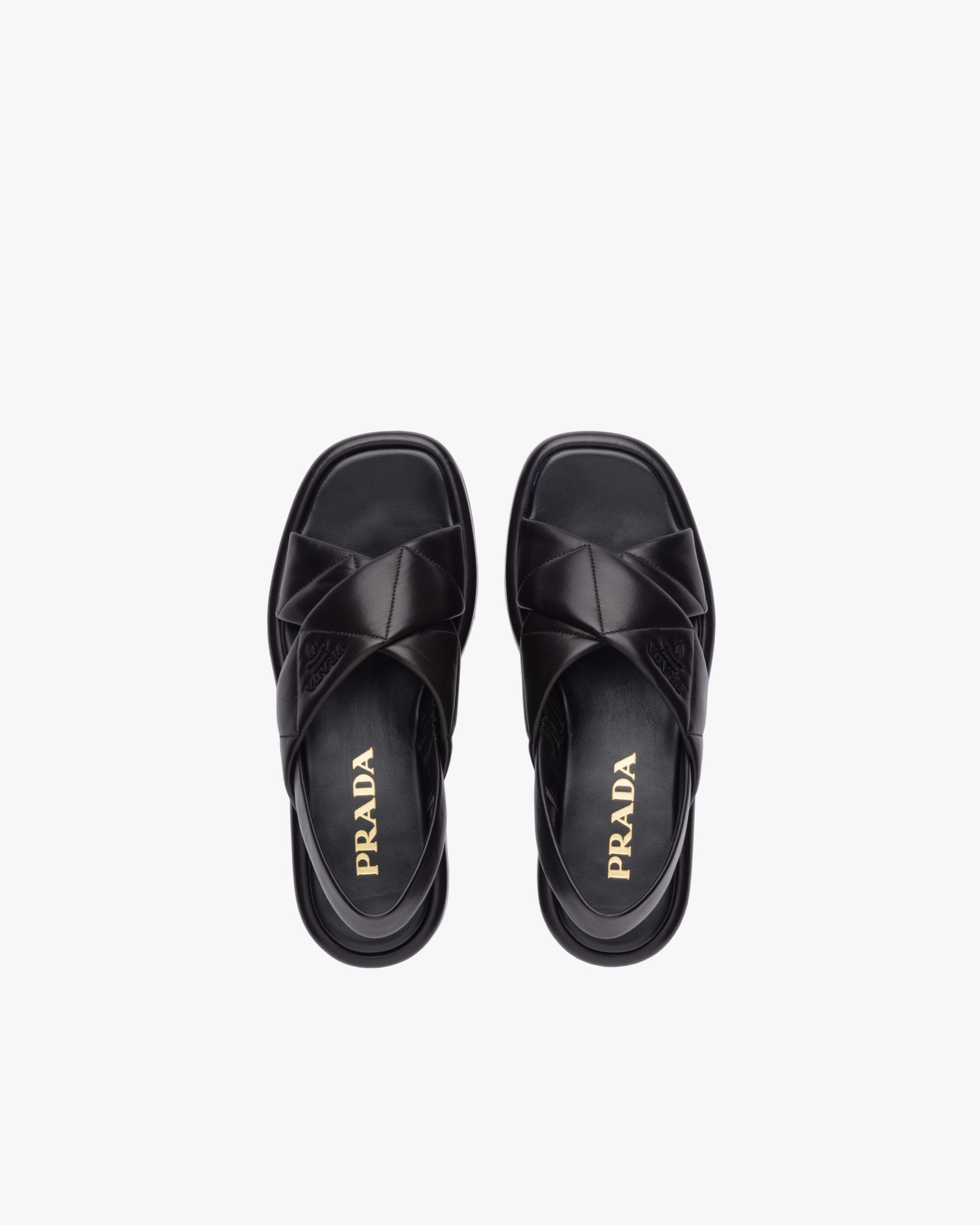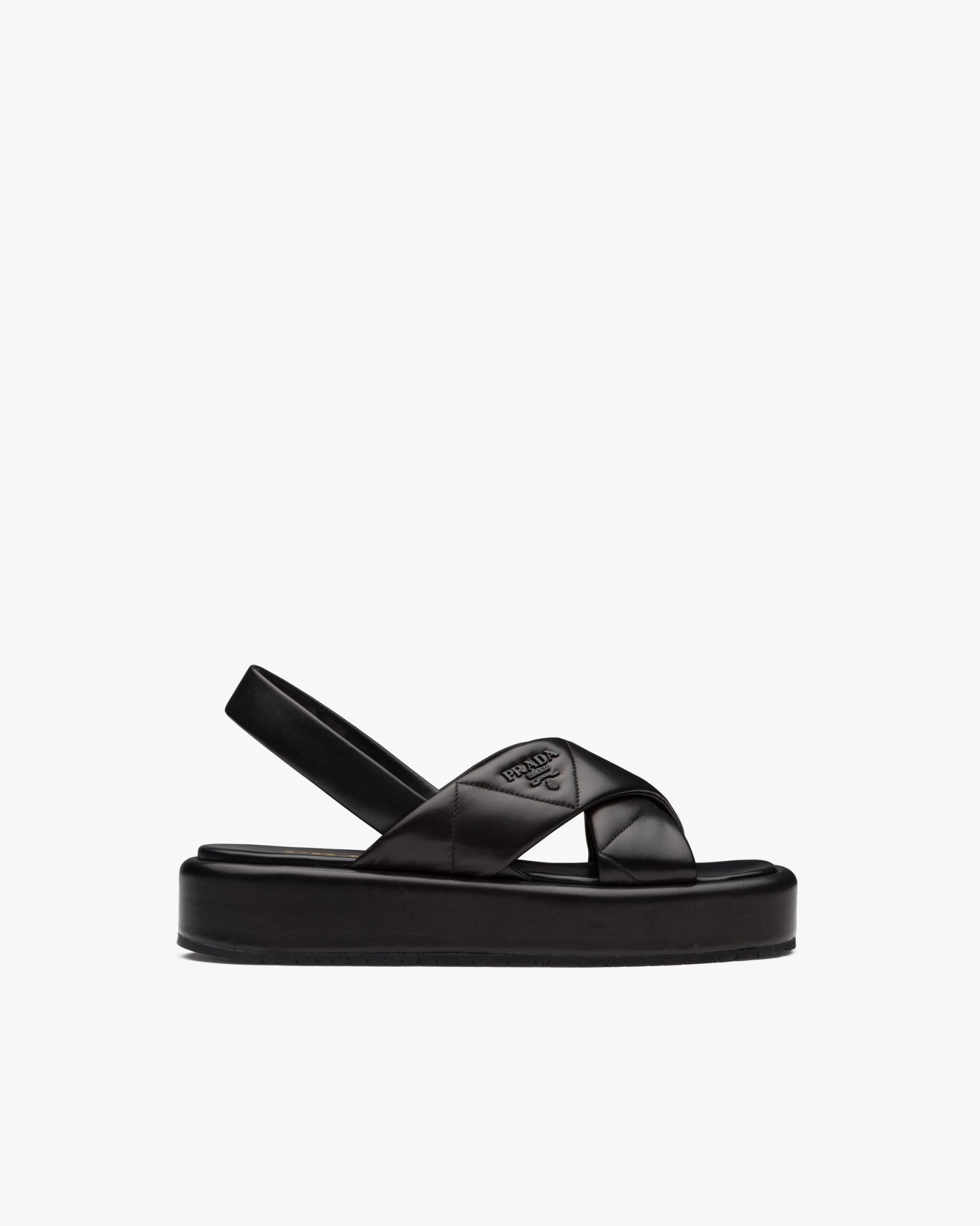 Volume, soft lines and references to the 90s define these sandals on a leather-covered flatform sole. The iconic Prada triangle is echoed in the quilted motif of the soft nappa leather of these sandals accented by the lettering logo2.