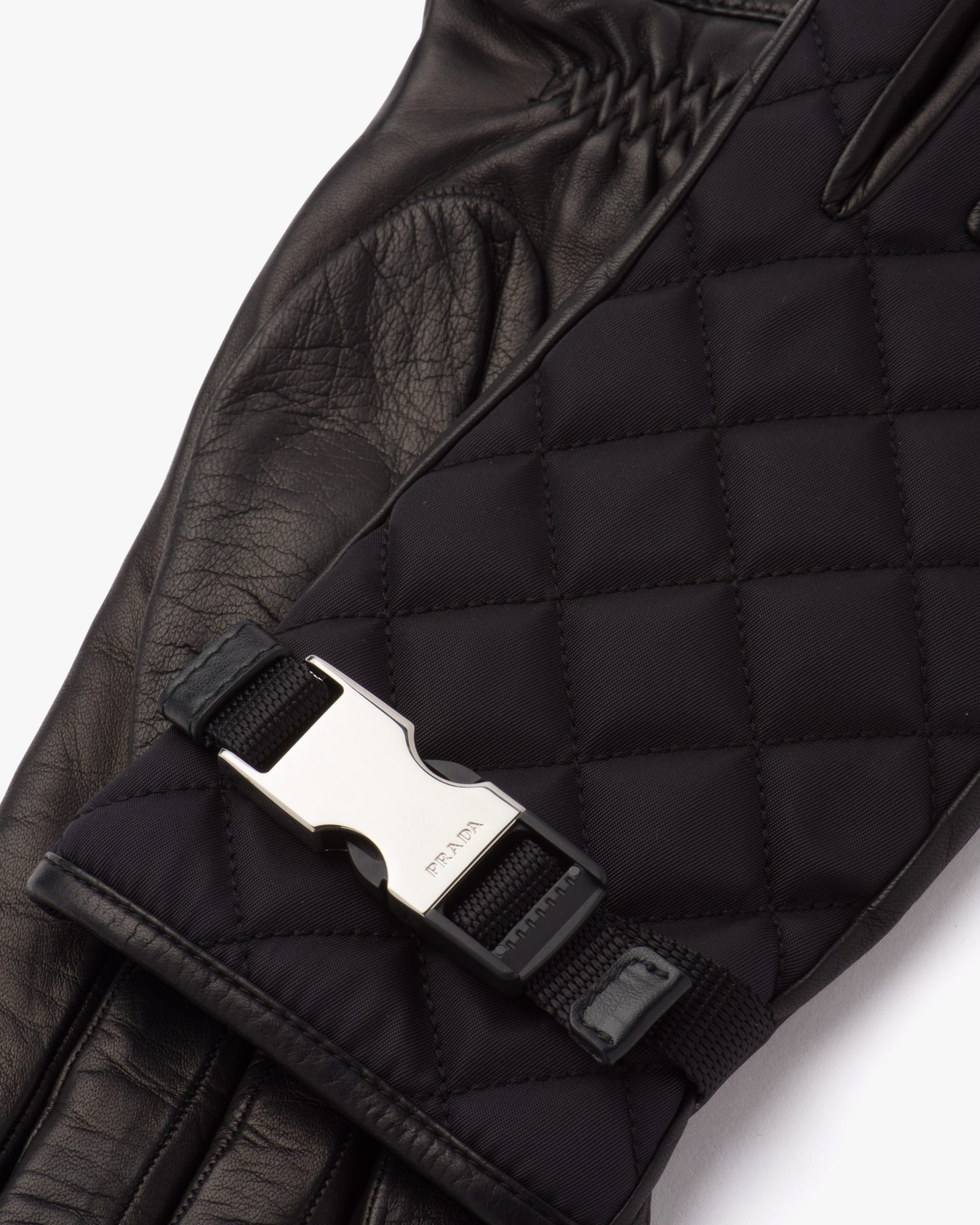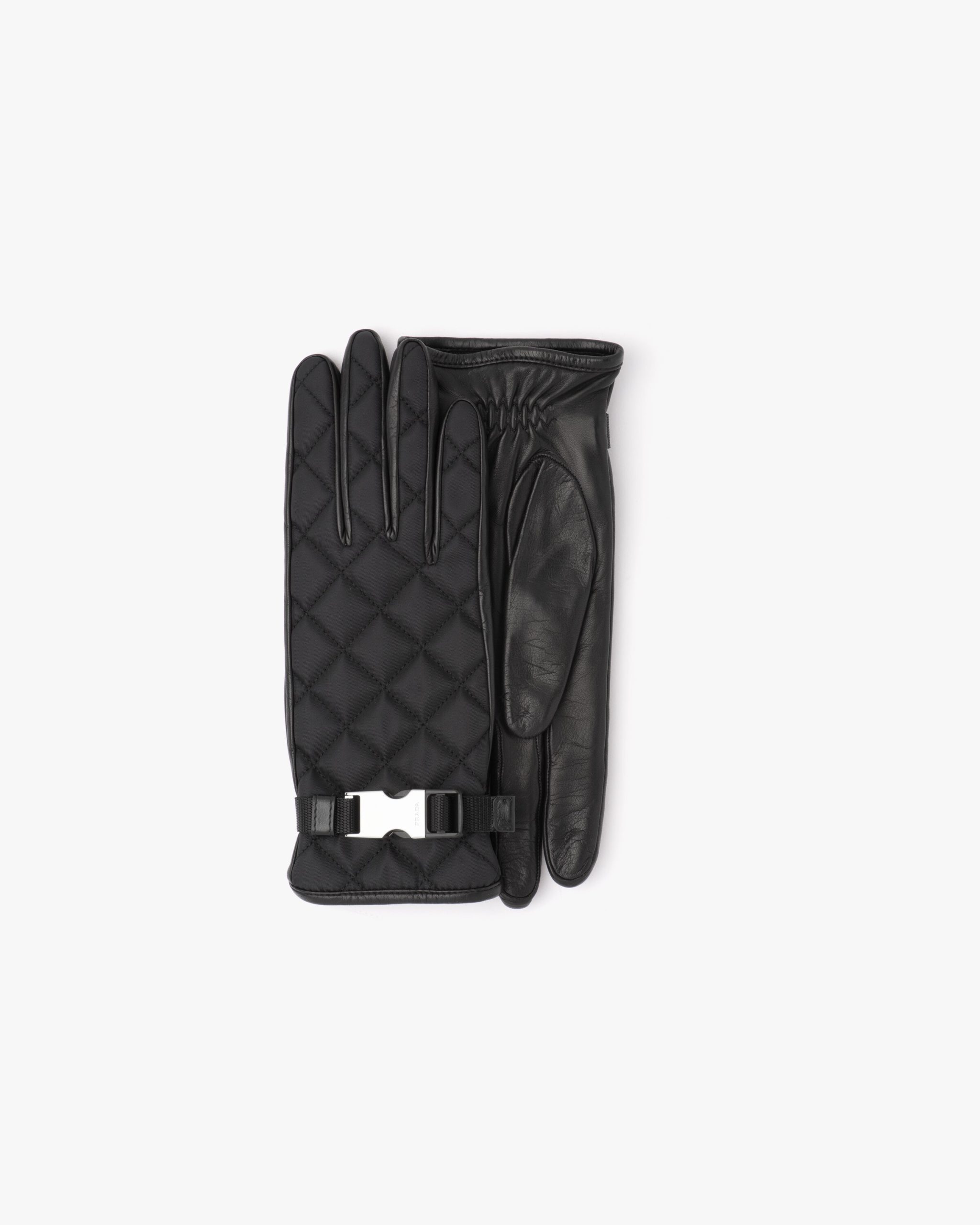 The quilted motif defines the refined design of these nylon and nappa leather gloves characterized by the metal side-release buckle on the wrist. Cashmere lining.