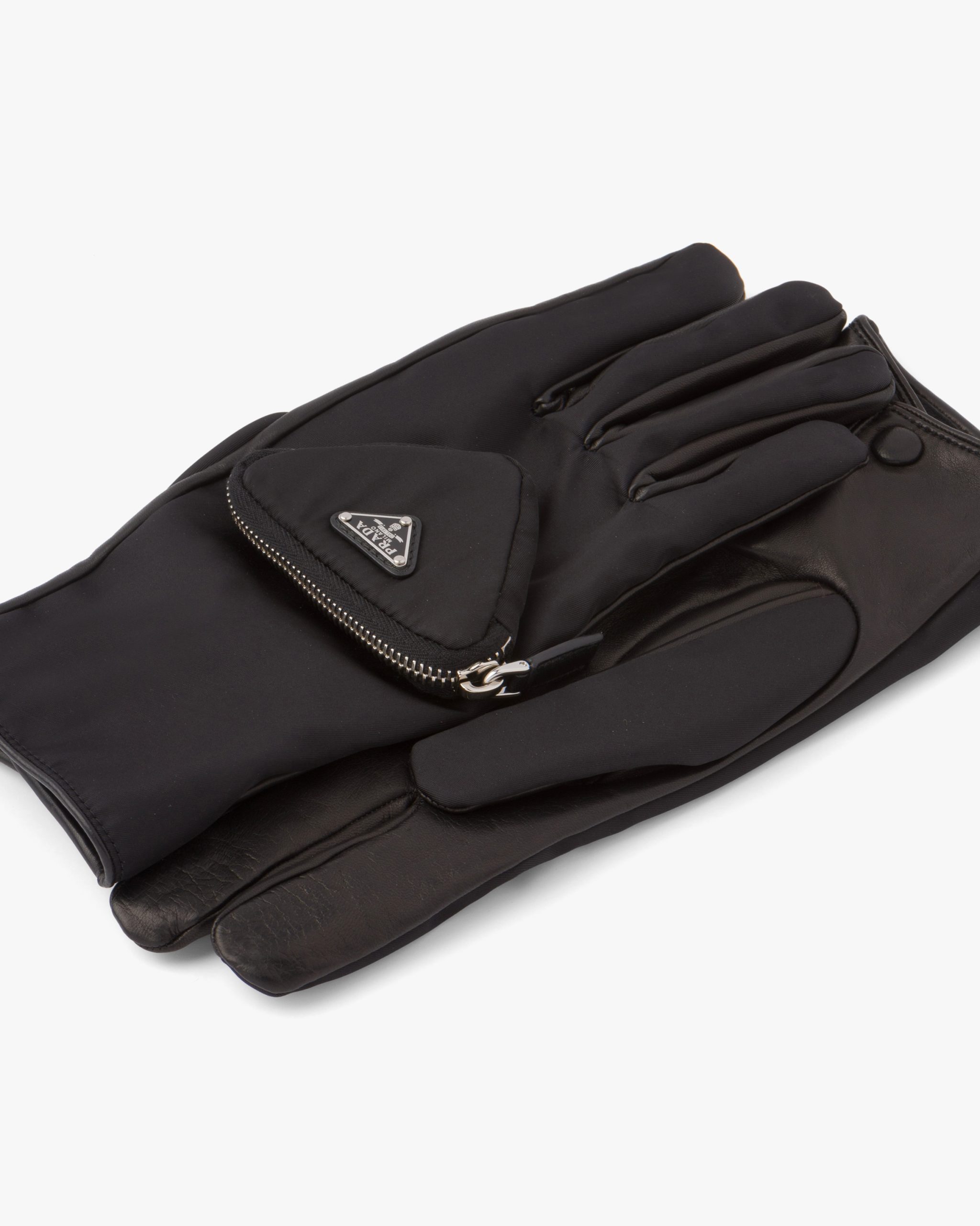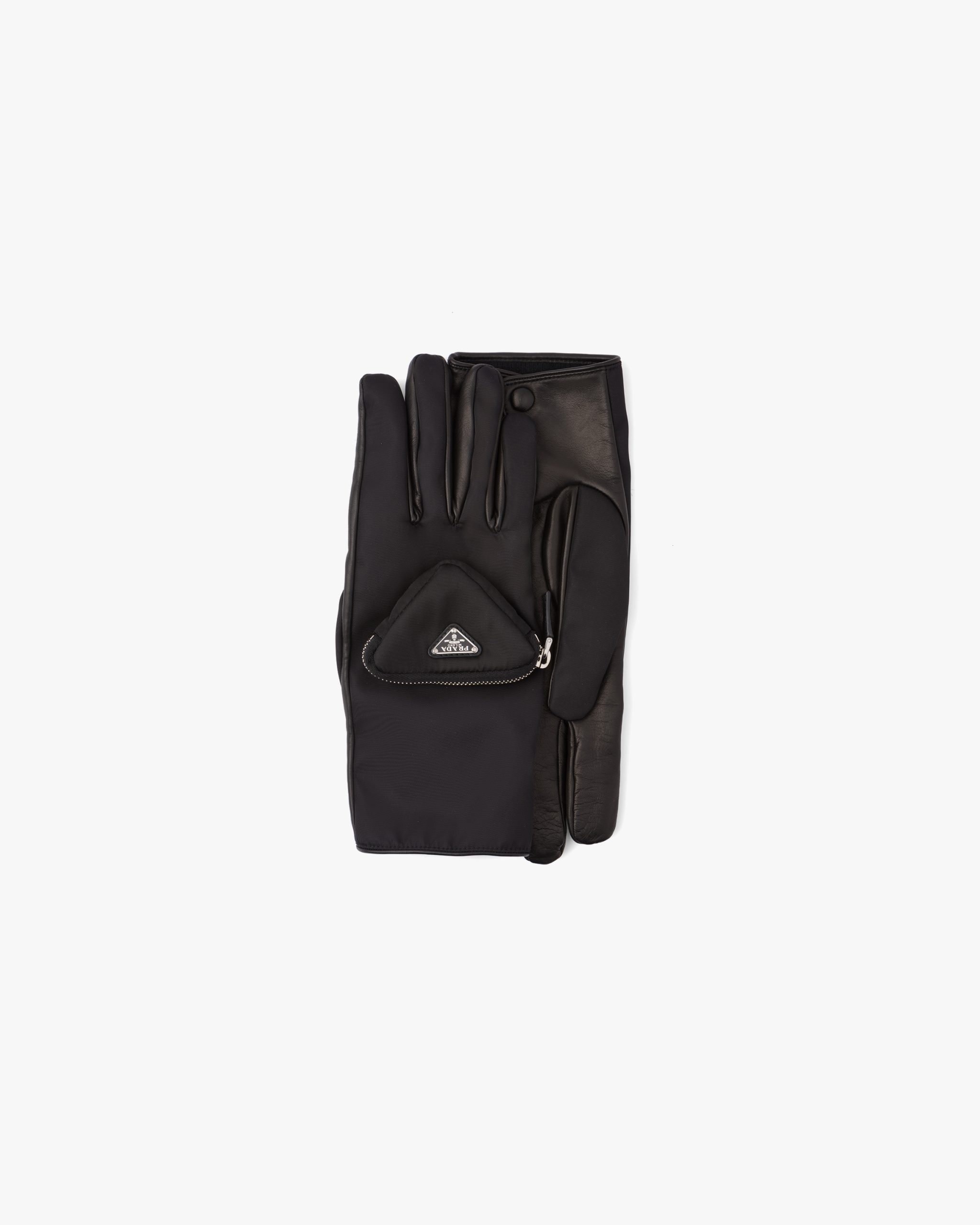 Made of nappa leather and Re-Nylon with a slightly irregular surface similar to the leather used in the seventies, these gloves are characterized by their modern design thanks to the small zipper pocket and enamel triangle logo2 that decorates one of the two gloves, a recurrent element in garments and accessories of the Men’s Fall Winter 2021 collectsion.
