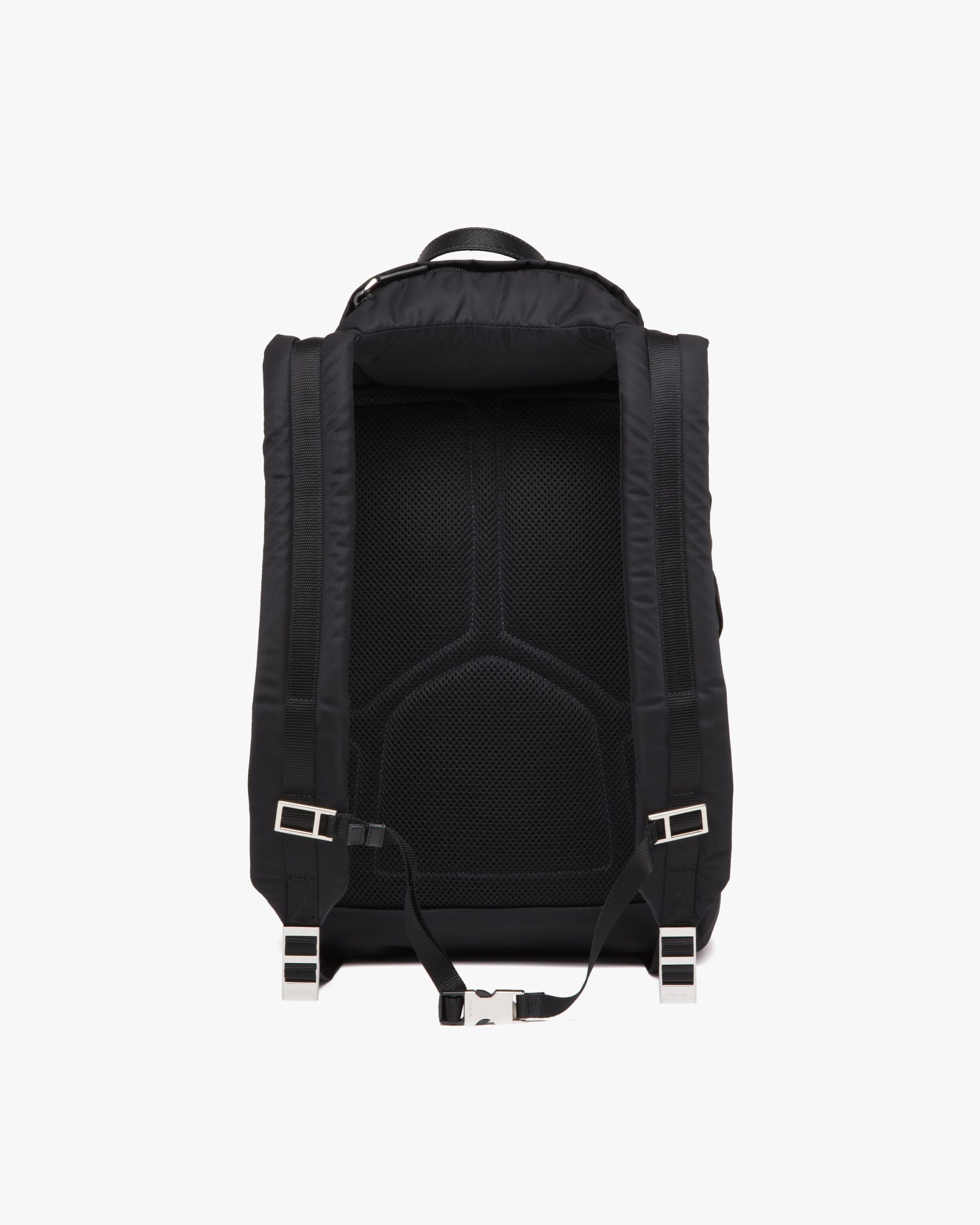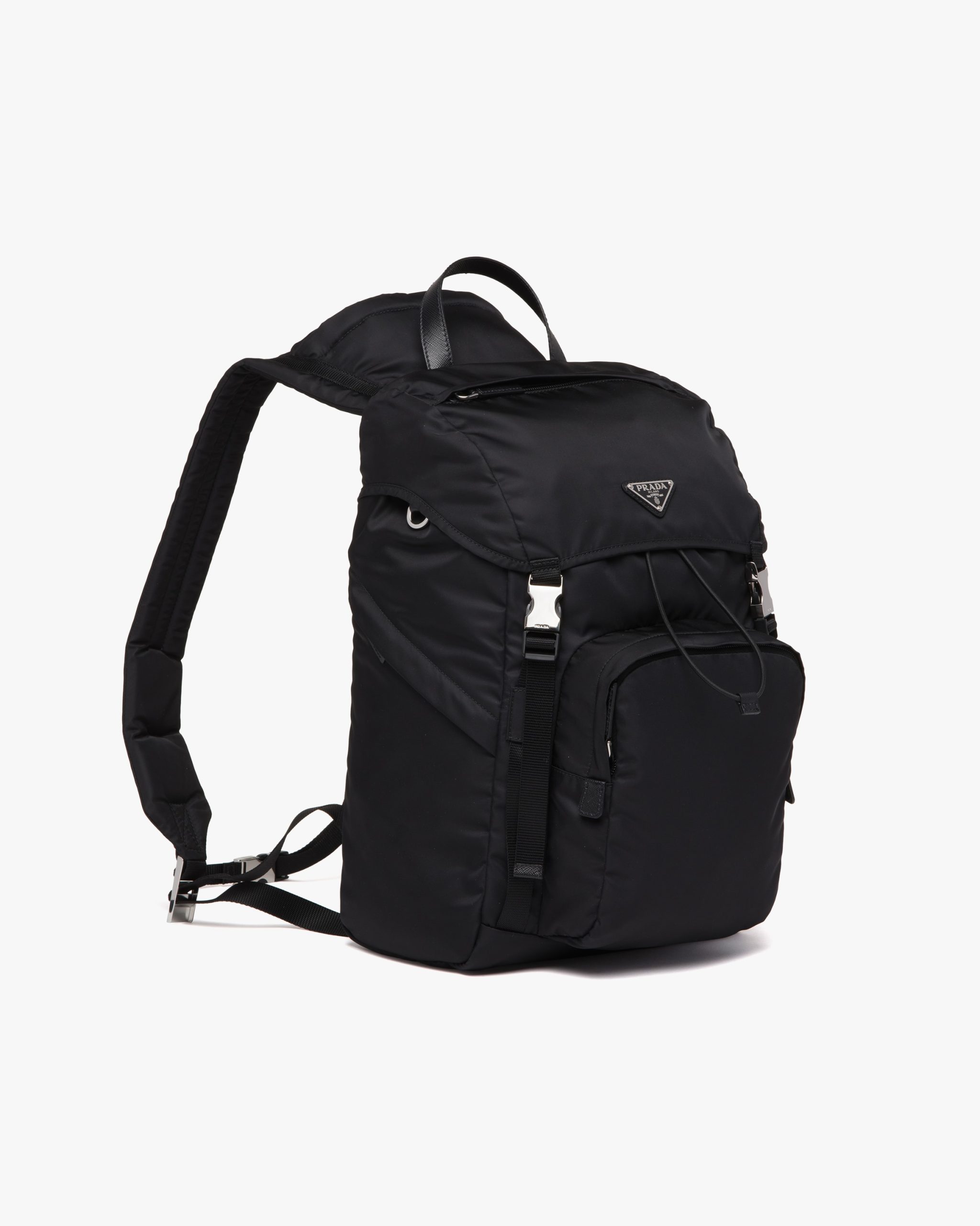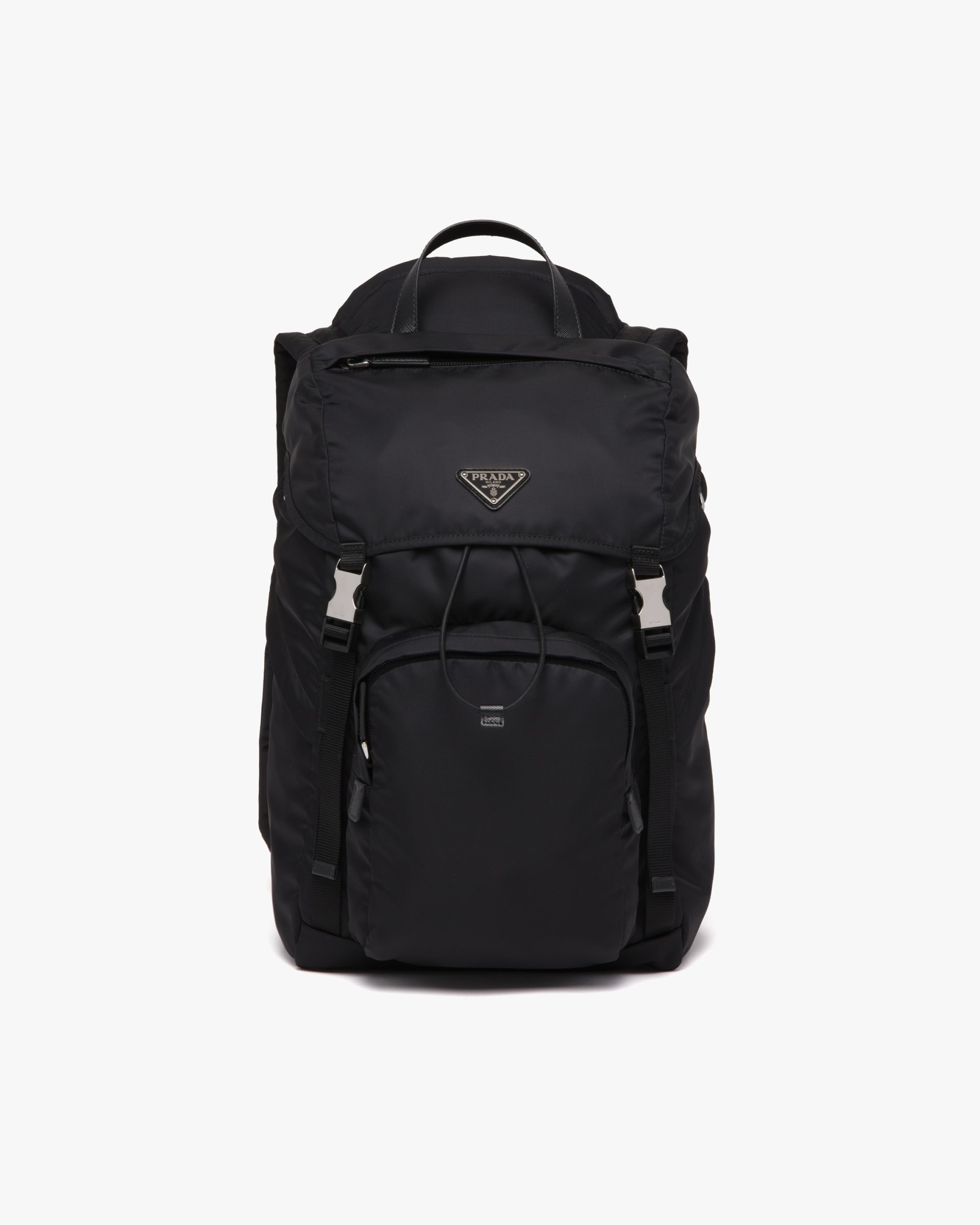 The evolution of an iconic Prada style since the eighties, this nylon backpack is made of Re-Nylon, a regenerated yarn produced from recycled, purified plastic trash collectsed in the ocean, fishing nets, and textile waste fibers. This technologically innovative fabric is paired with Saffiano leather, an historic material of Prada tradition defined by its crosshatch pattern and waxed finish. The enameled metal triangle logo2 accents the compact design with flap and oversized front pocket.