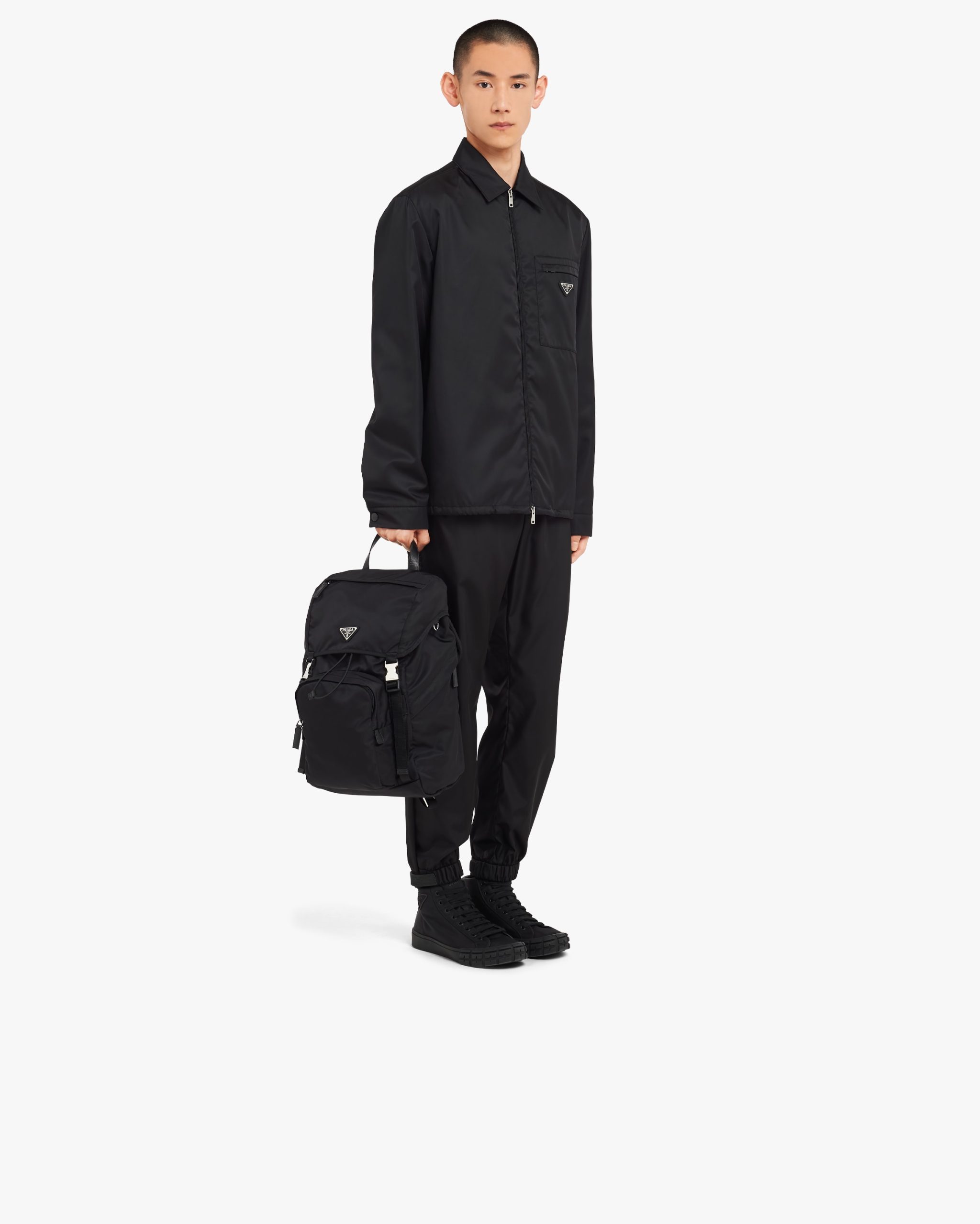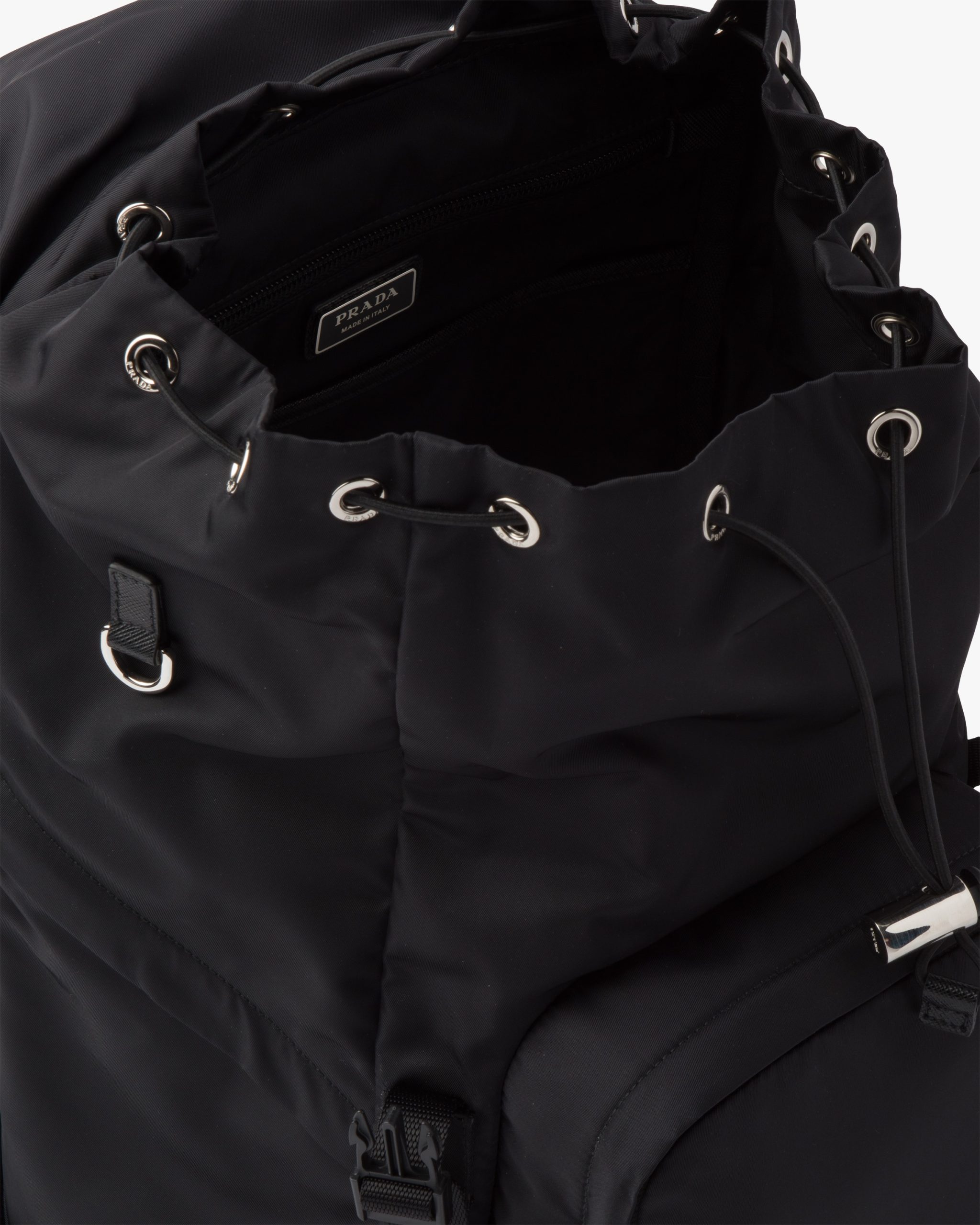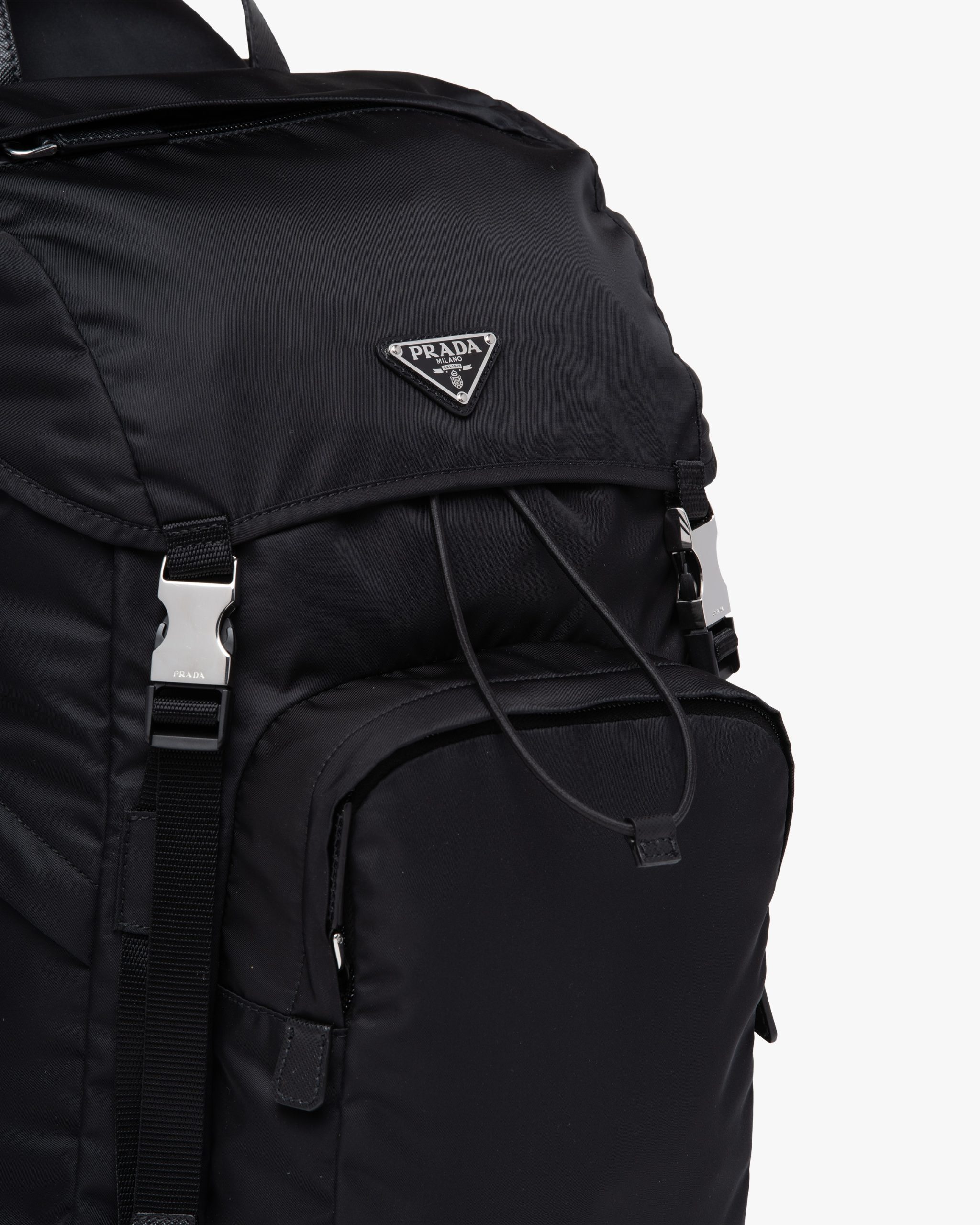 The evolution of an iconic Prada style since the eighties, this nylon backpack is made of Re-Nylon, a regenerated yarn produced from recycled, purified plastic trash collectsed in the ocean, fishing nets, and textile waste fibers. This technologically innovative fabric is paired with Saffiano leather, an historic material of Prada tradition defined by its crosshatch pattern and waxed finish. The enameled metal triangle logo2 accents the compact design with flap and oversized front pocket.