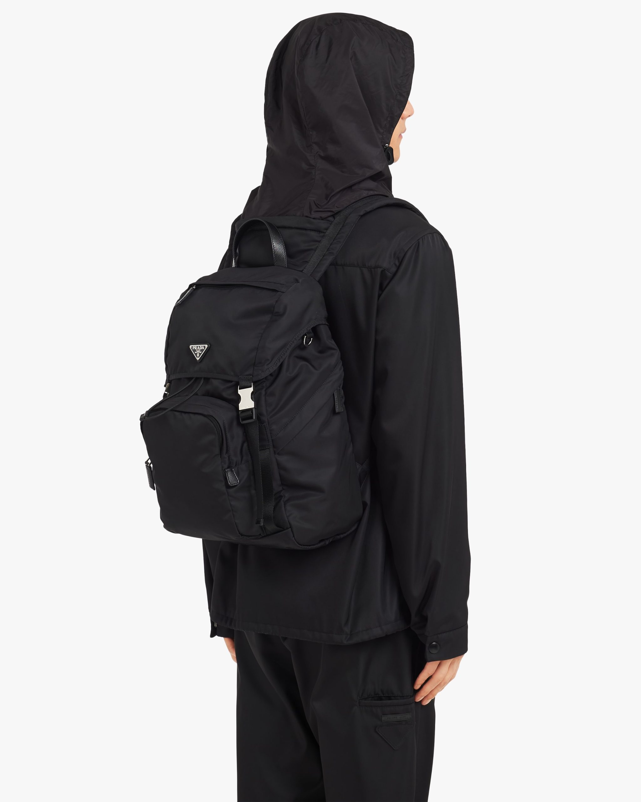 Black Re-Nylon and Saffiano leather backpack with hood