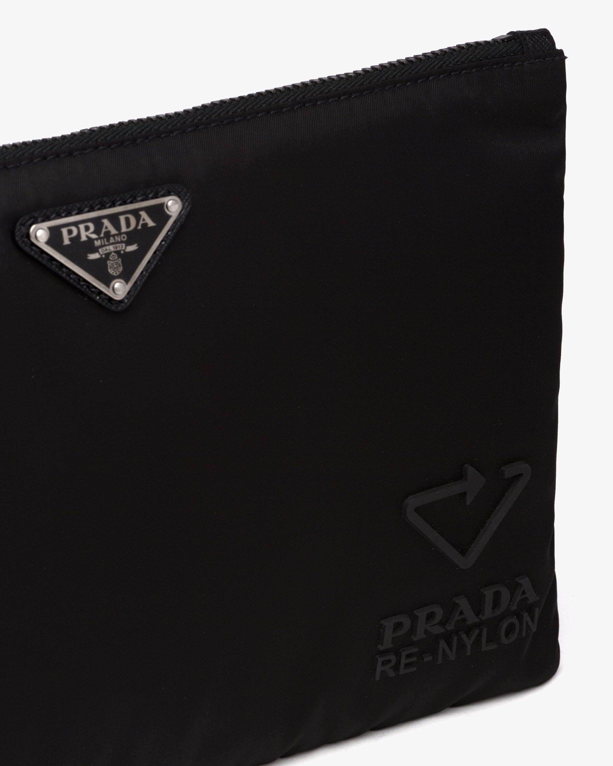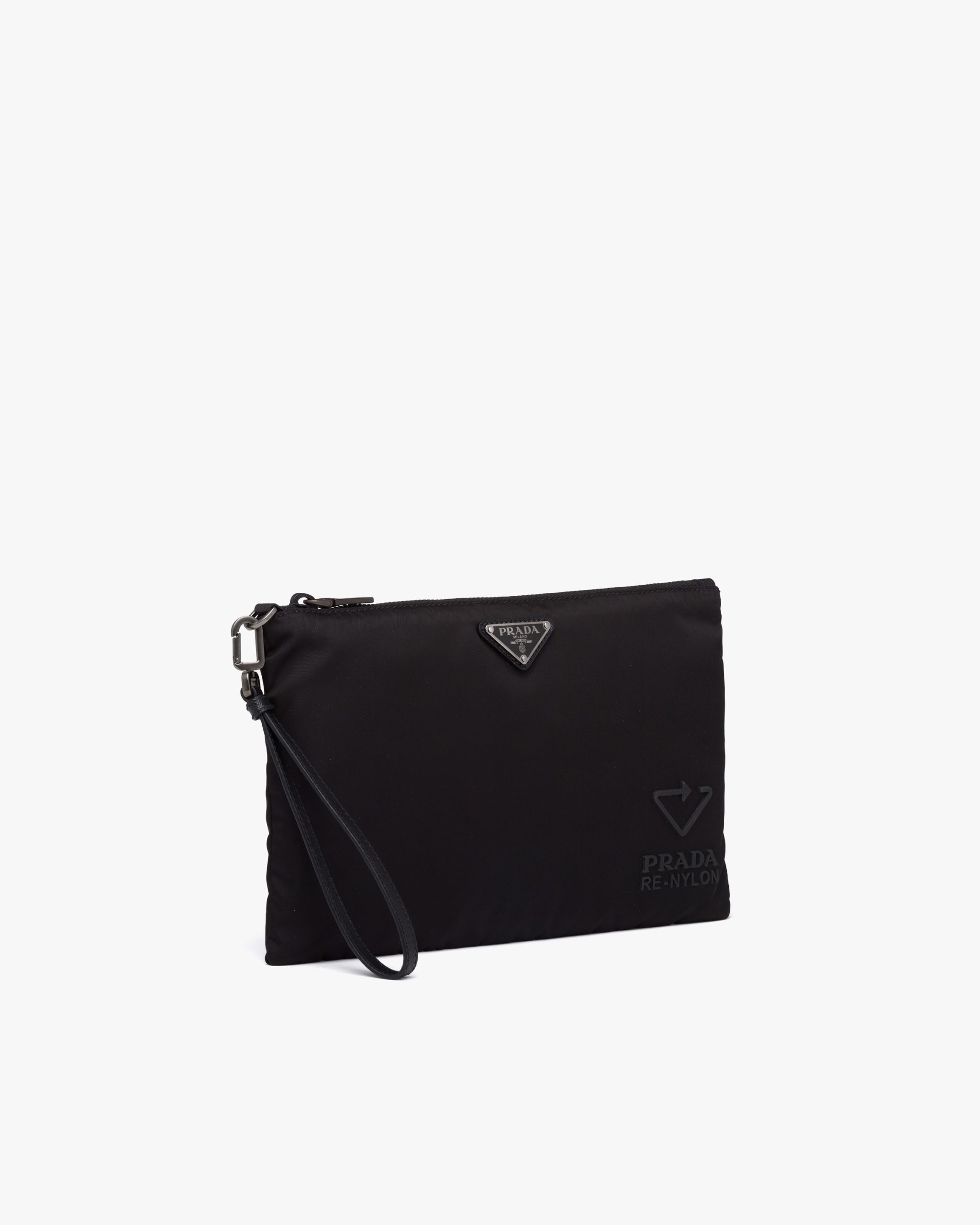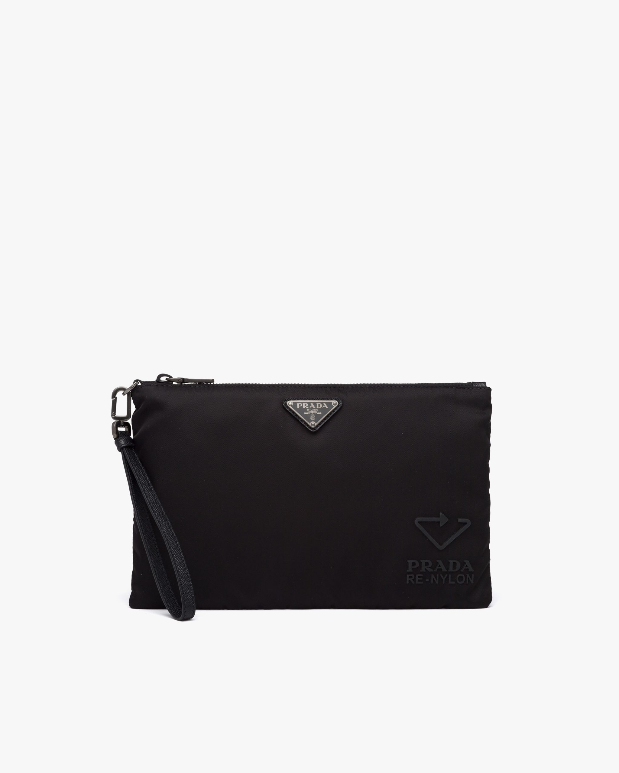 This rectangular pouch made of Re-Nylon Gabardine with Saffiano leather details has a wristlet and metal hardware.