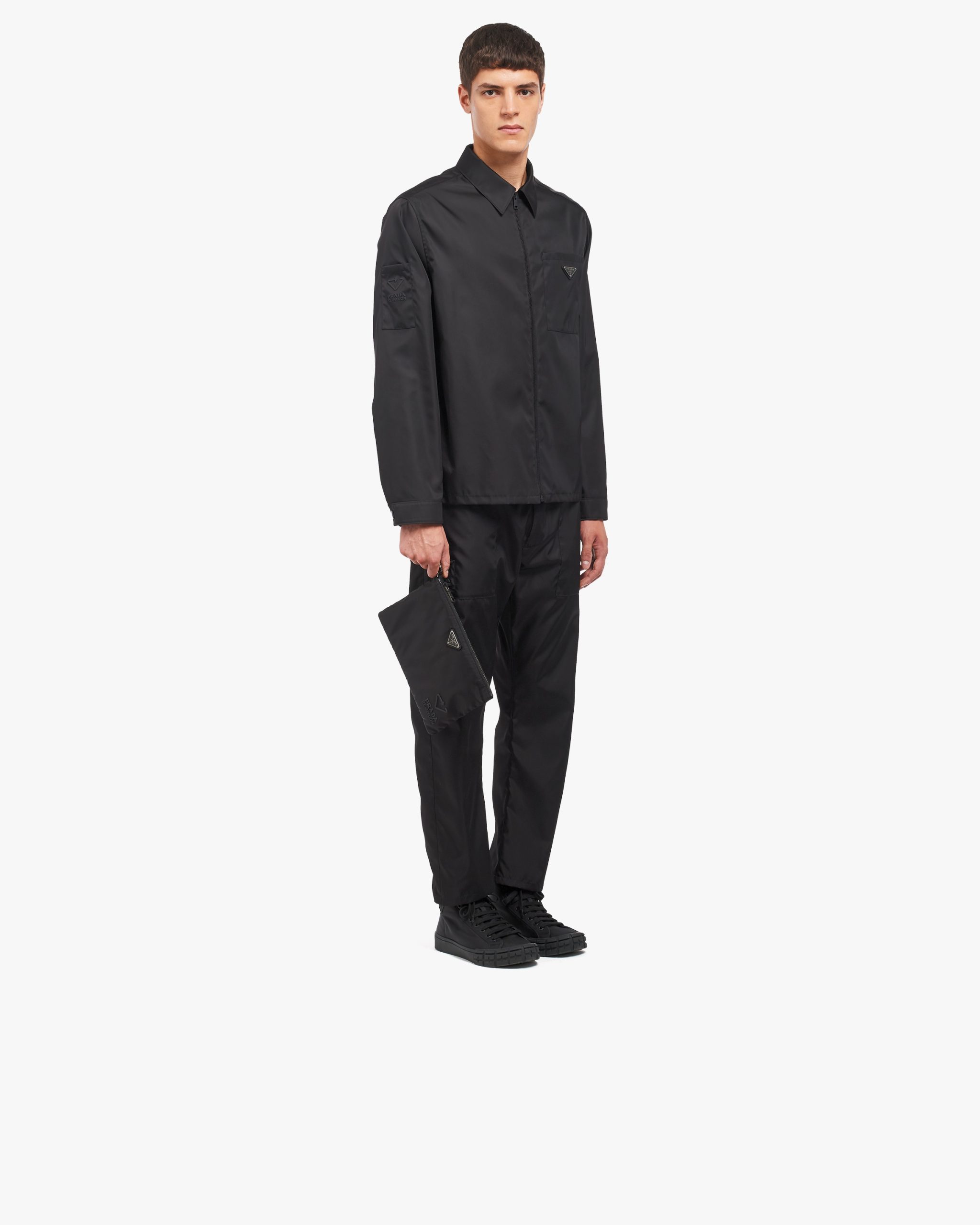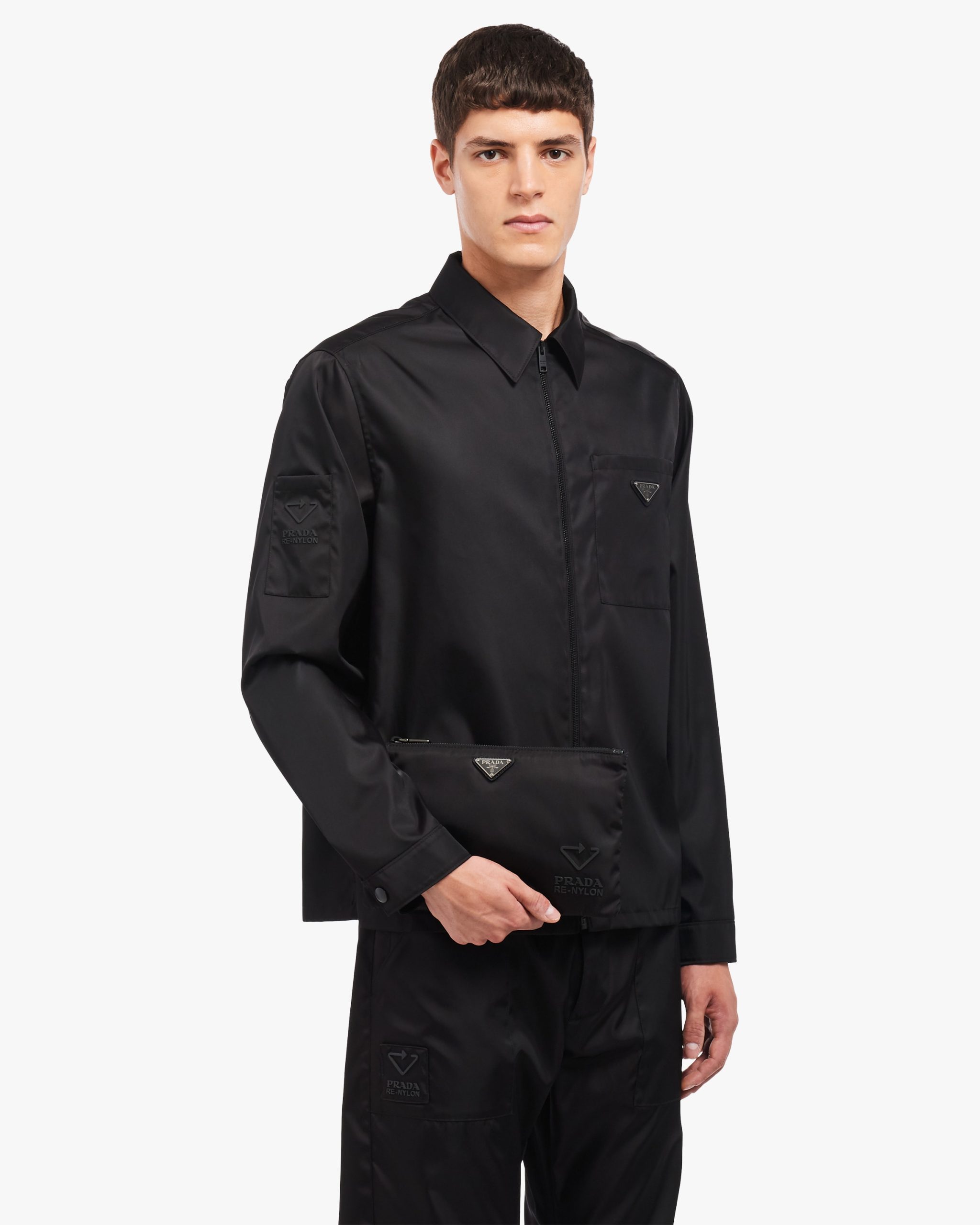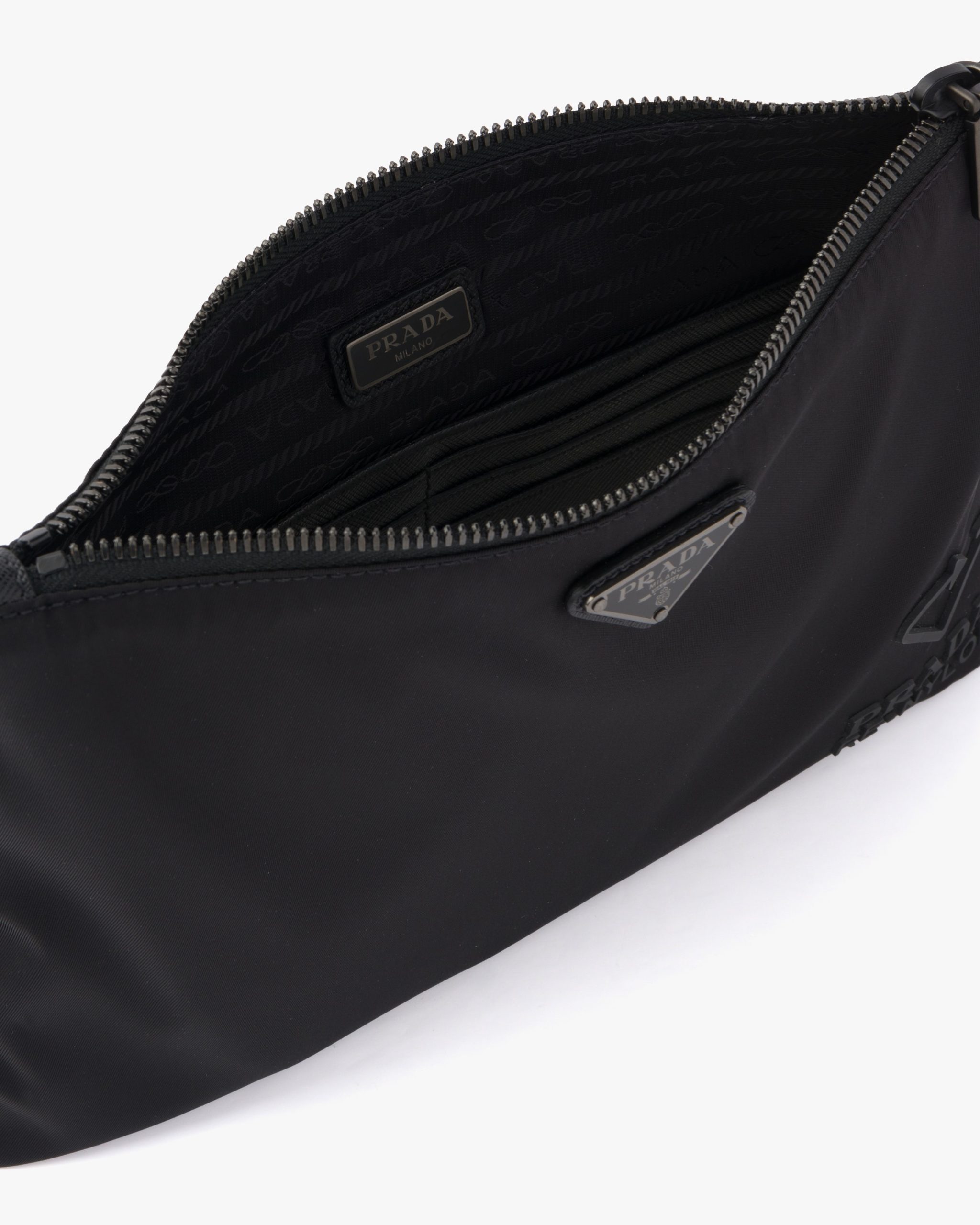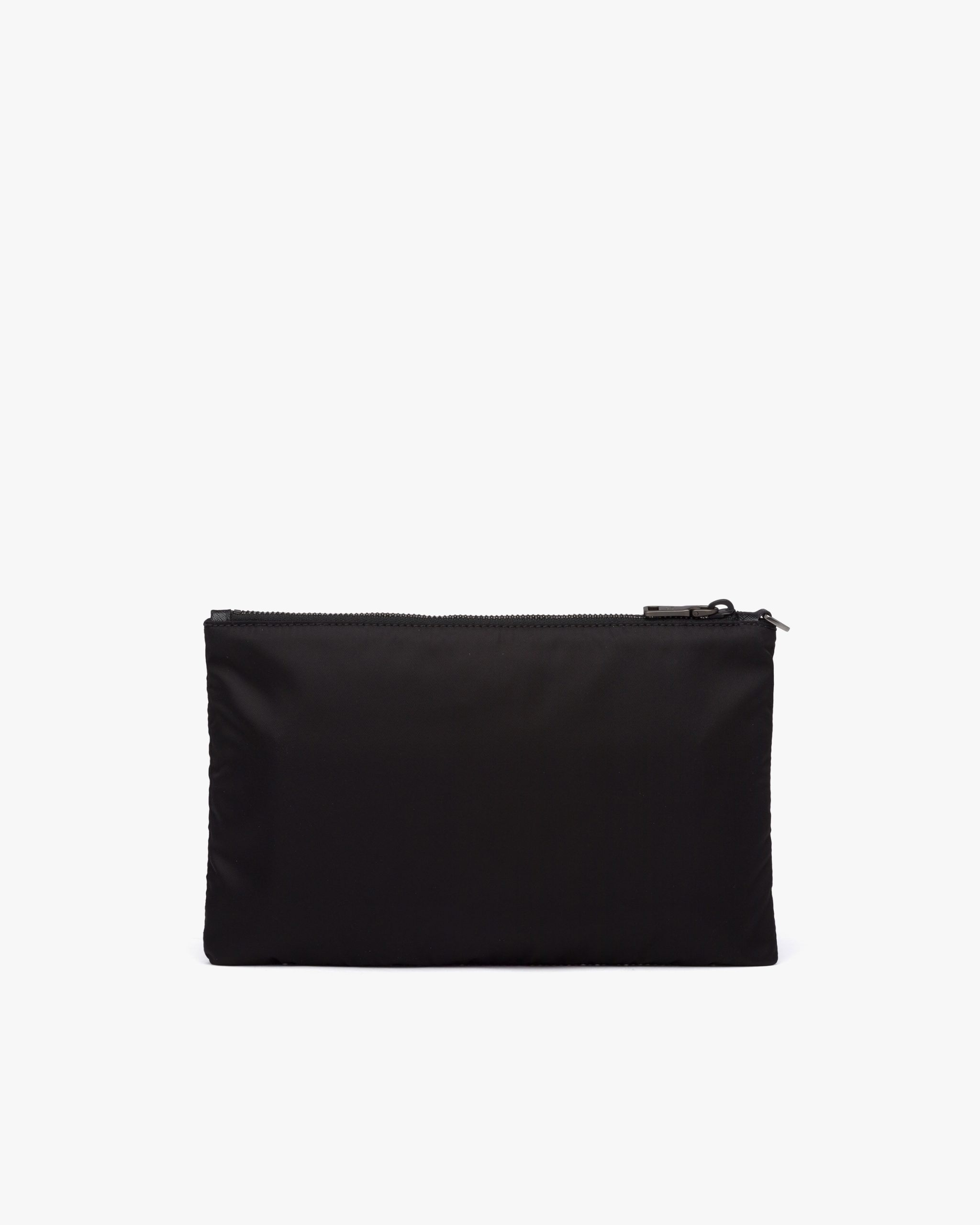 This rectangular pouch made of Re-Nylon Gabardine with Saffiano leather details has a wristlet and metal hardware.