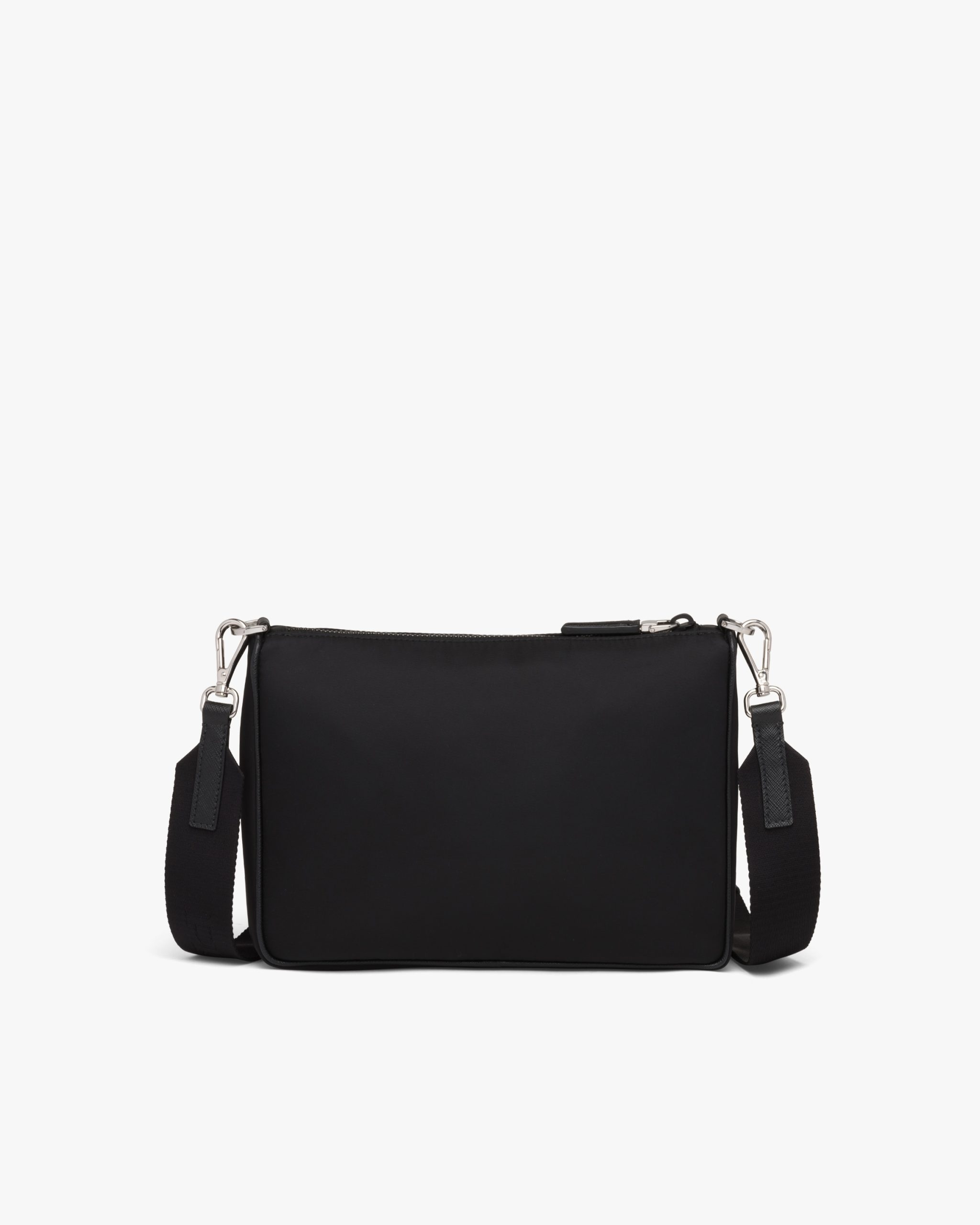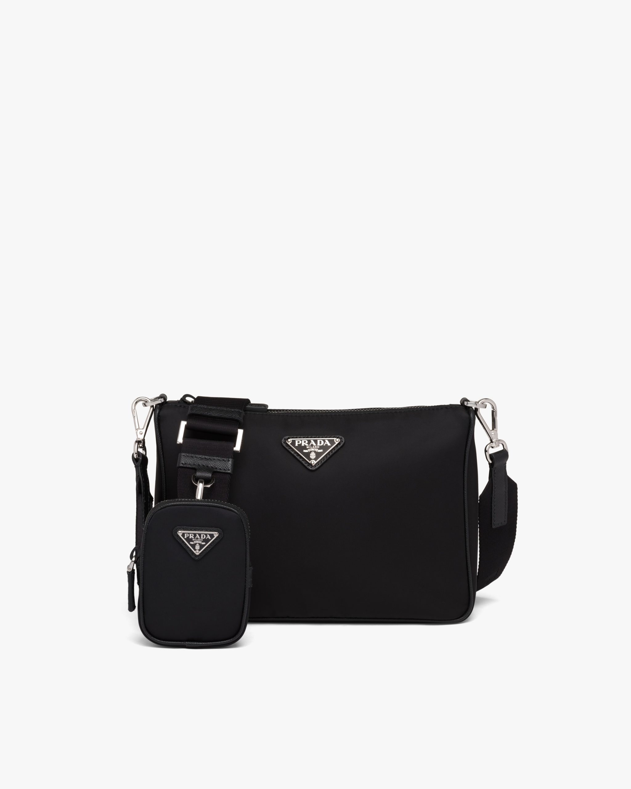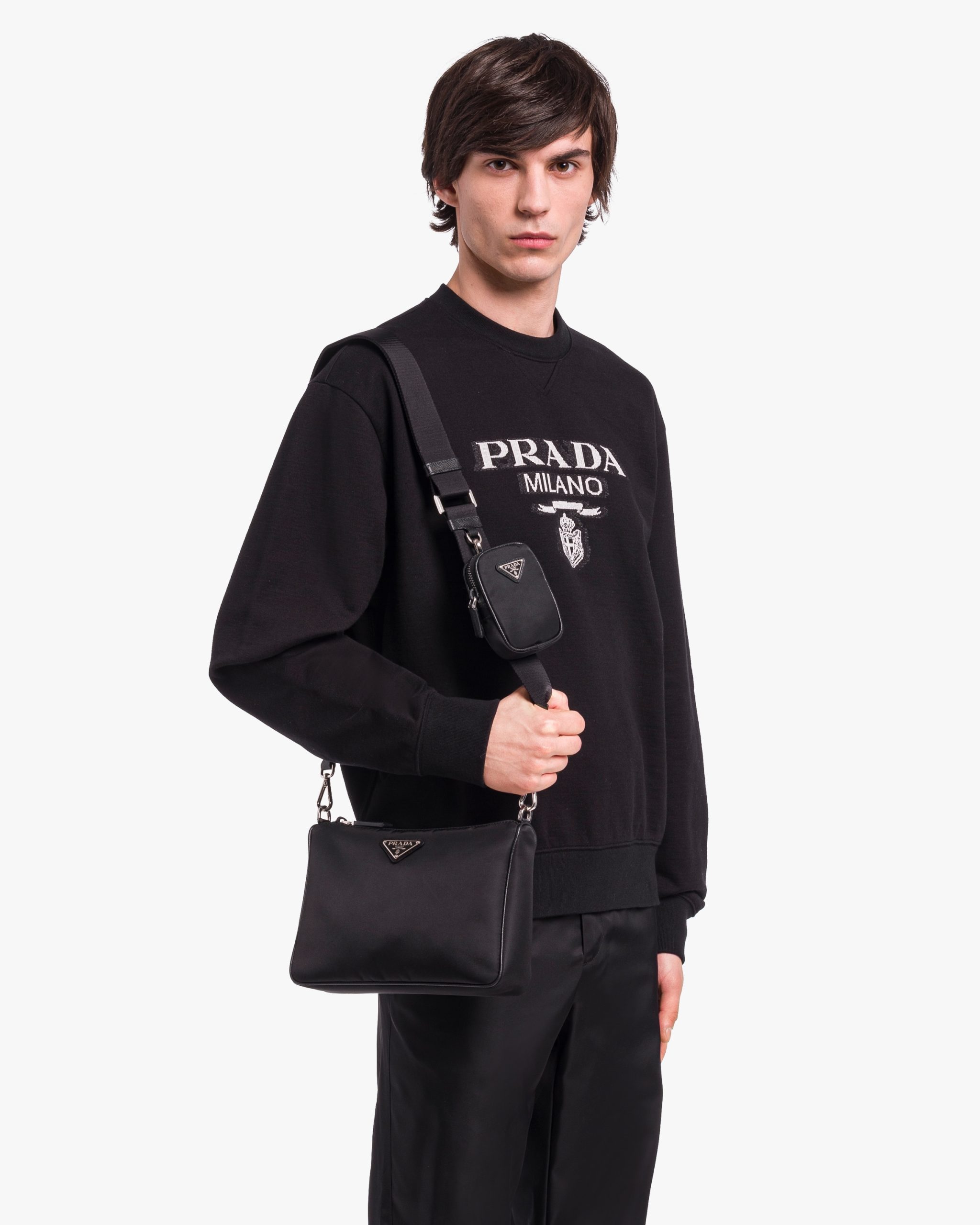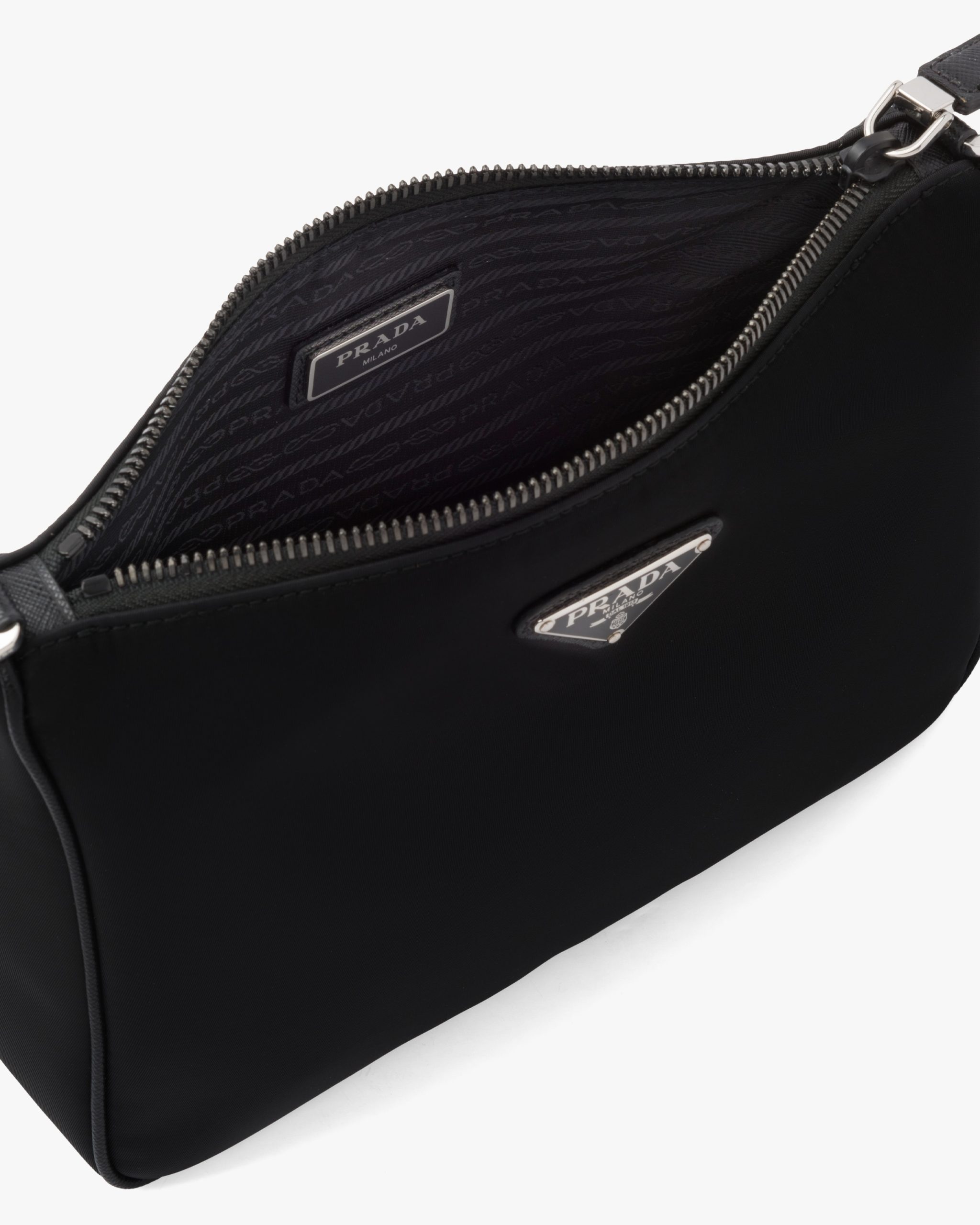 A sporty soul characterizes the shoulder bag made of innovative Re-Nylon, a regenerated nylon yarn produced from recycled, purified plastic trash collectsed in the ocean, fishing nets, and textile waste fibers. The accessory, accented with fine Saffiano leather trim, is characterized by the removable pouch that adds a contemporary touch. The enameled metal triangle logo2 stands out on the front.