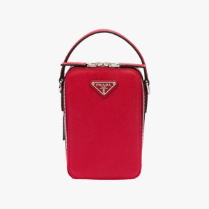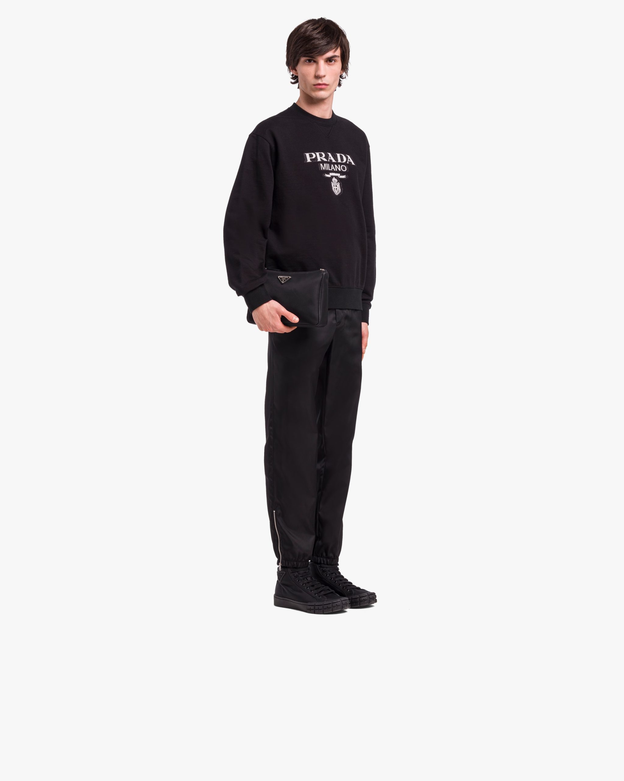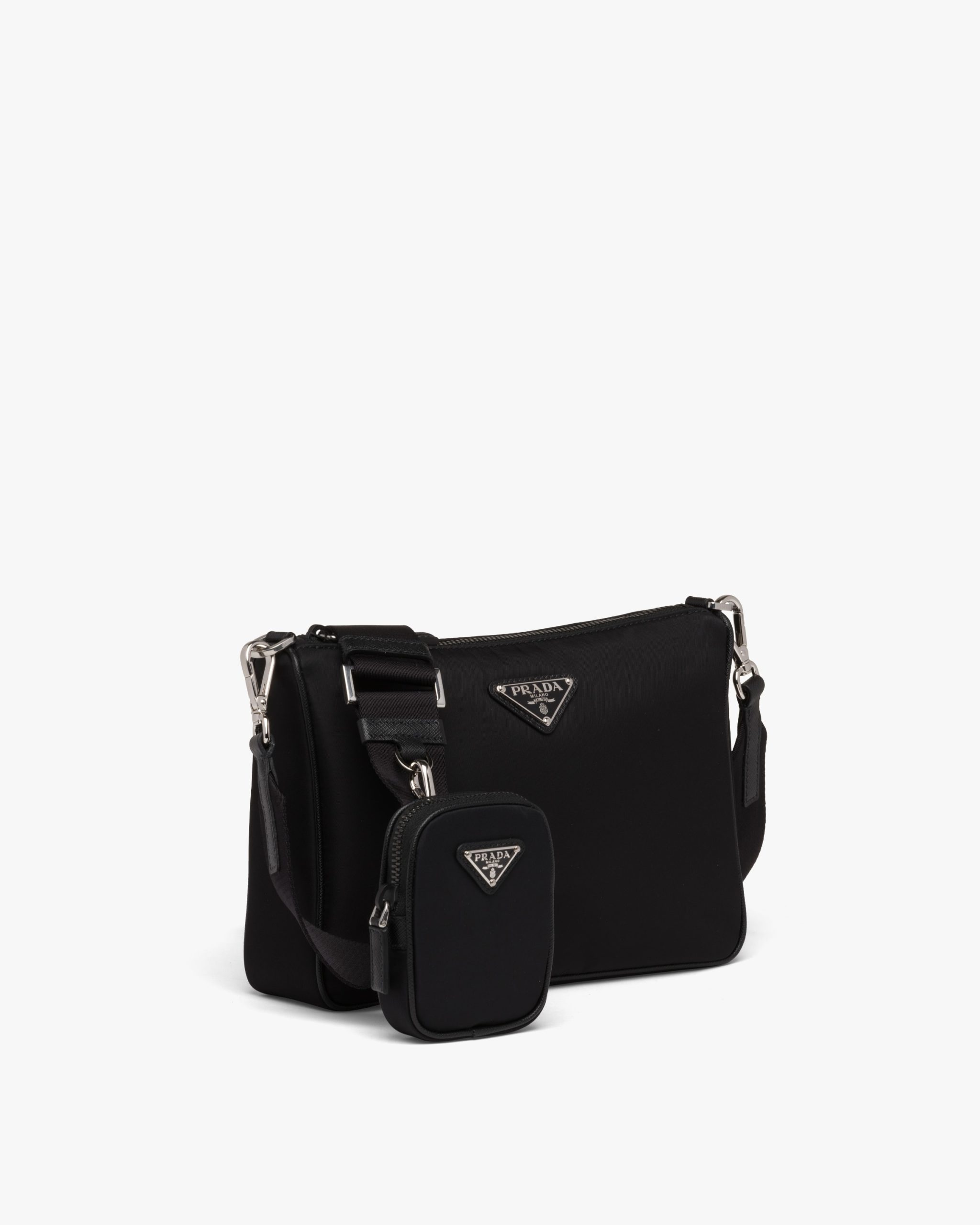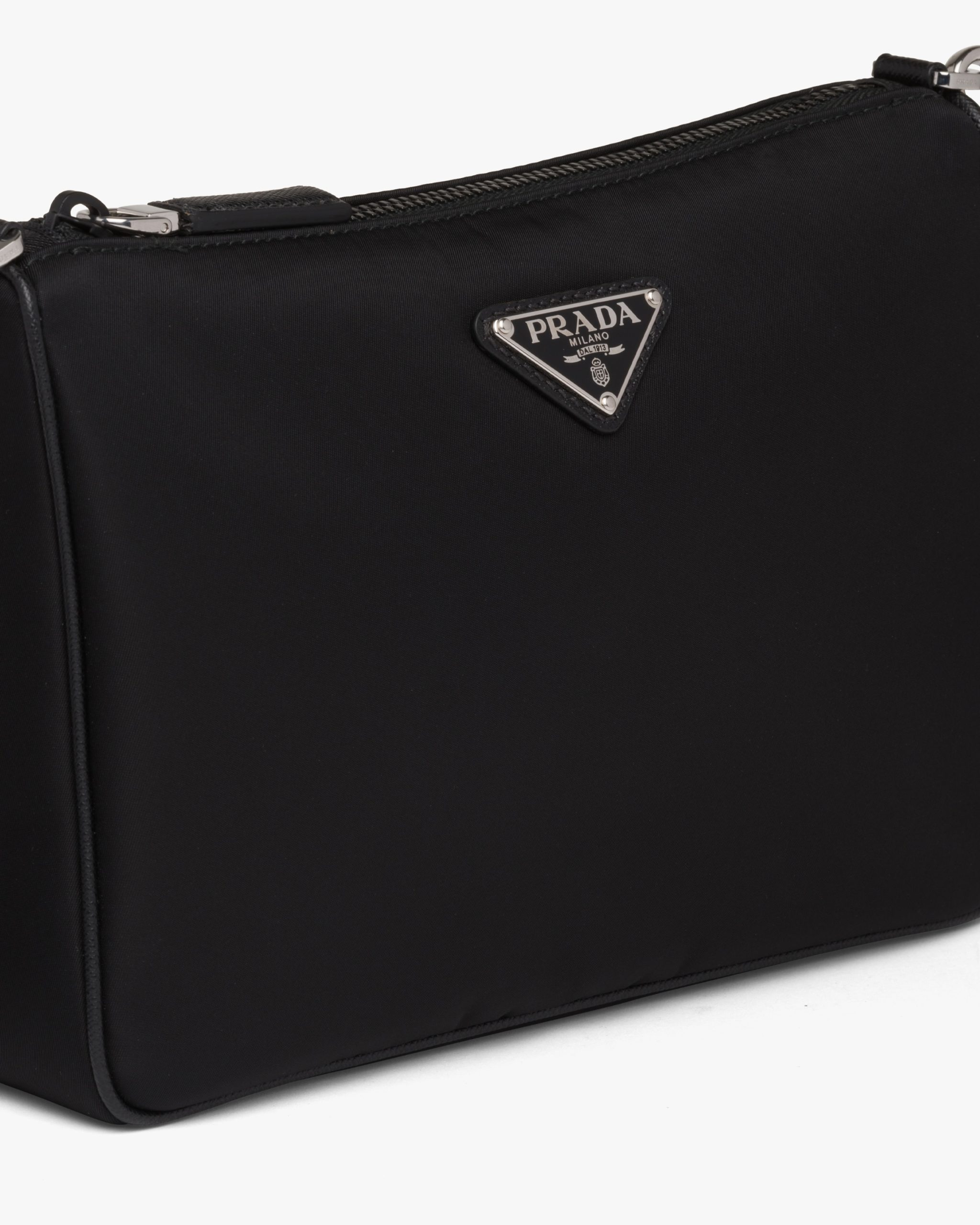 A sporty soul characterizes the shoulder bag made of innovative Re-Nylon, a regenerated nylon yarn produced from recycled, purified plastic trash collectsed in the ocean, fishing nets, and textile waste fibers. The accessory, accented with fine Saffiano leather trim, is characterized by the removable pouch that adds a contemporary touch. The enameled metal triangle logo2 stands out on the front.