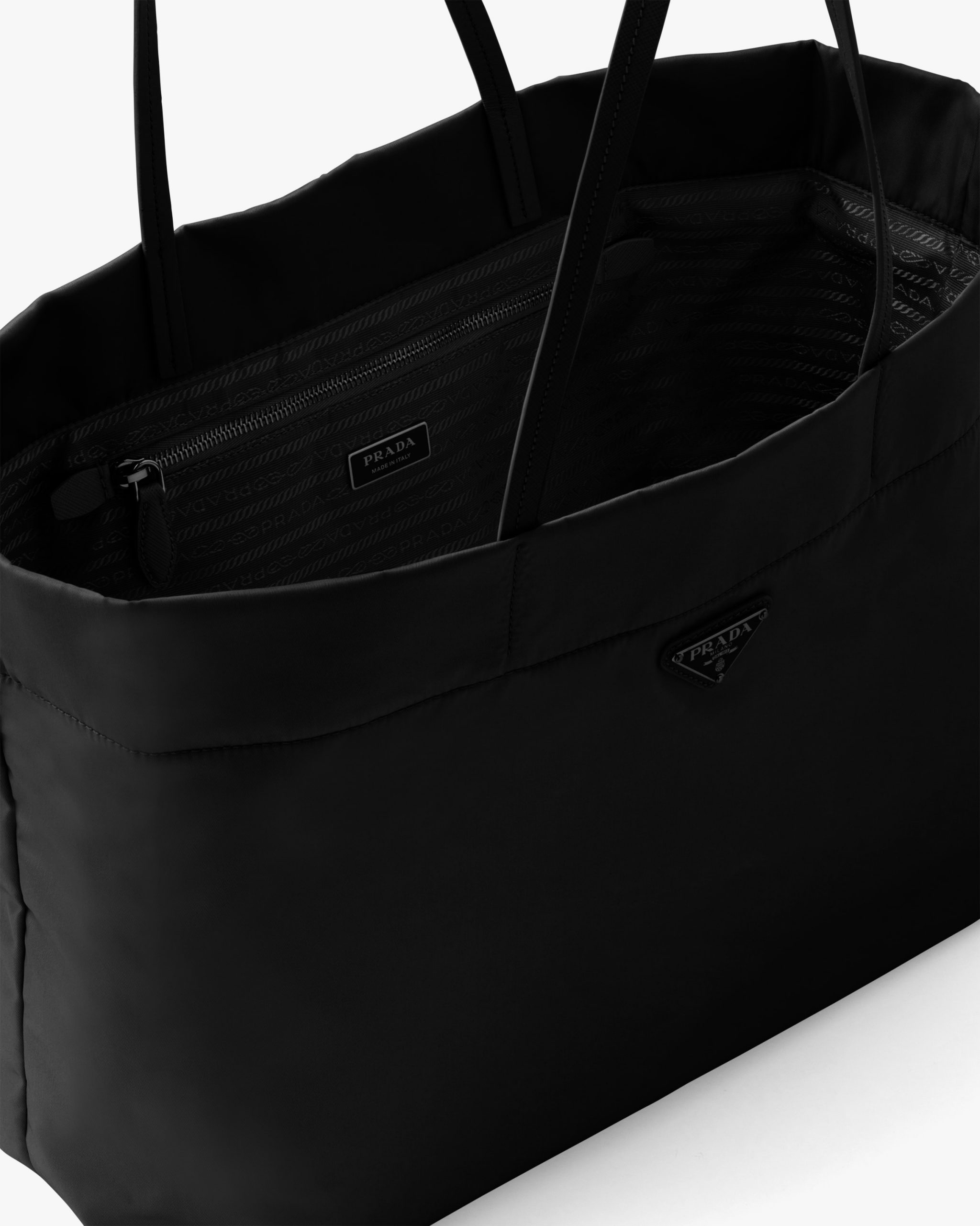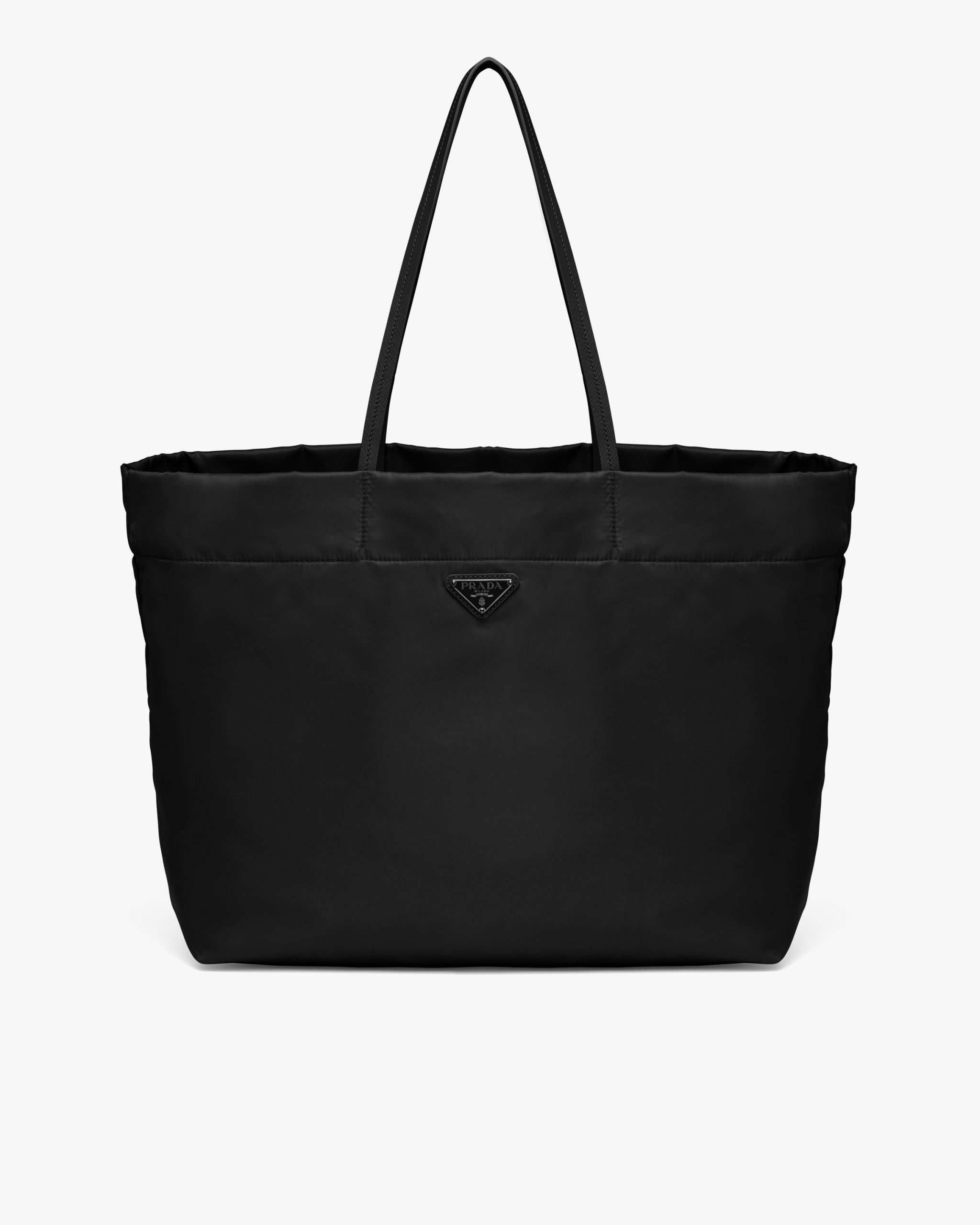 This tote bag characterized by the sleek lines of its design is made of Re-Nylon, the innovative regenerated nylon fabric by Prada produced from recycled, purified plastic trash collectsed in the ocean, fishing nets, and textile waste fibers. Completed with handles made of fine Saffiano leather, the bag is accented by the enameled metal triangle logo2.