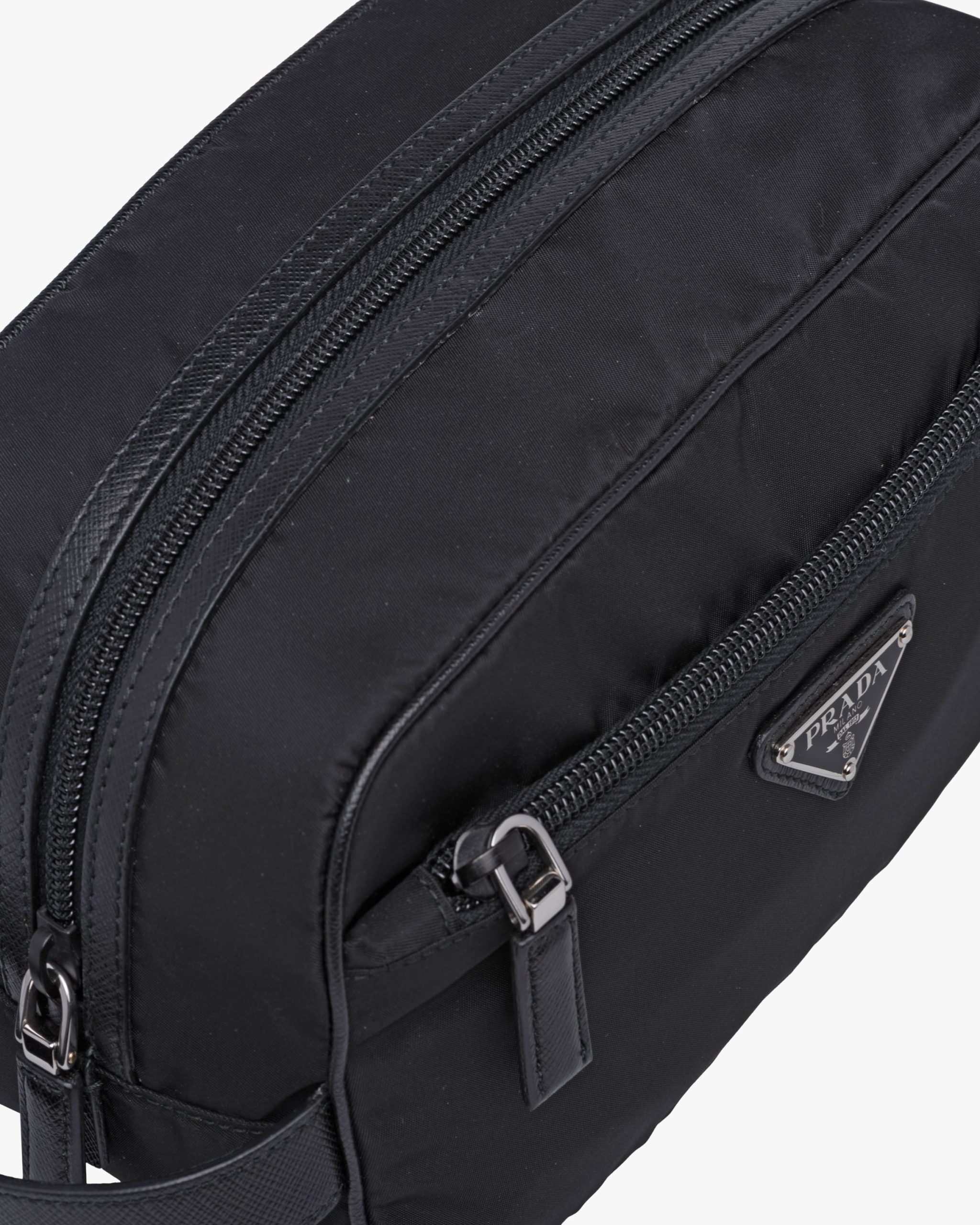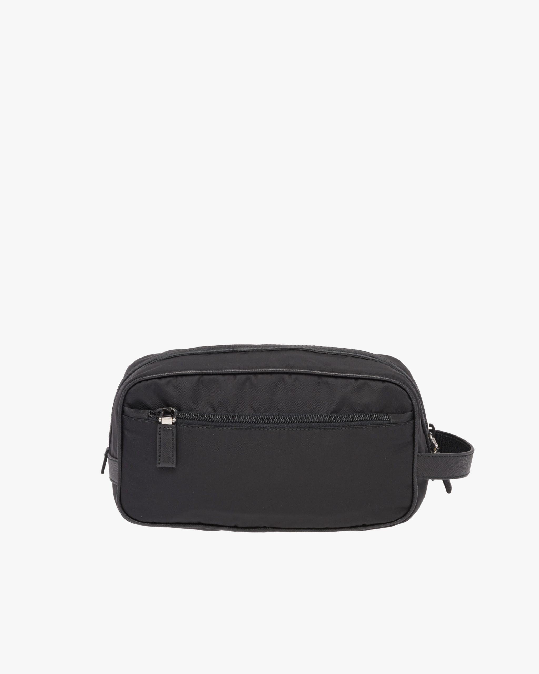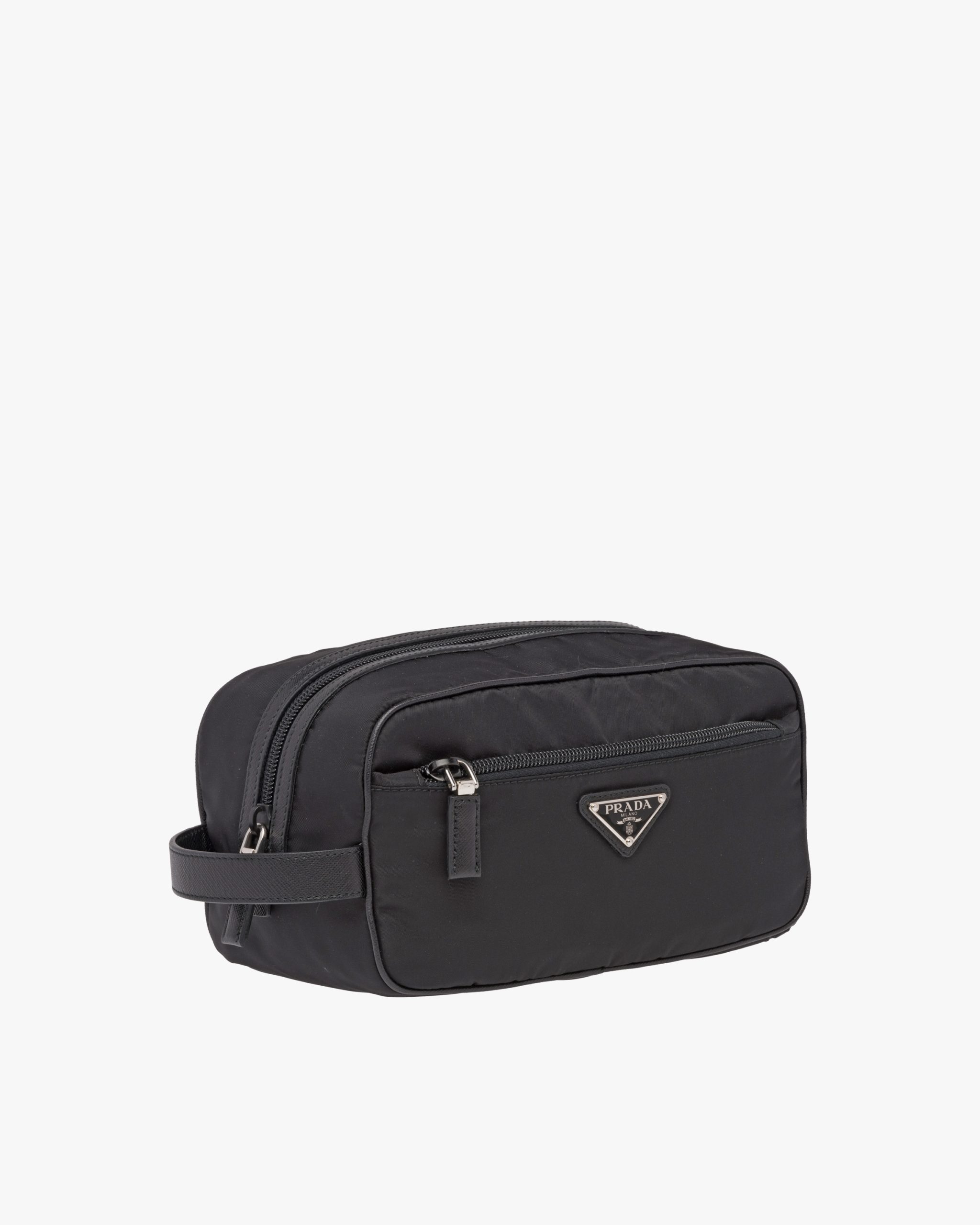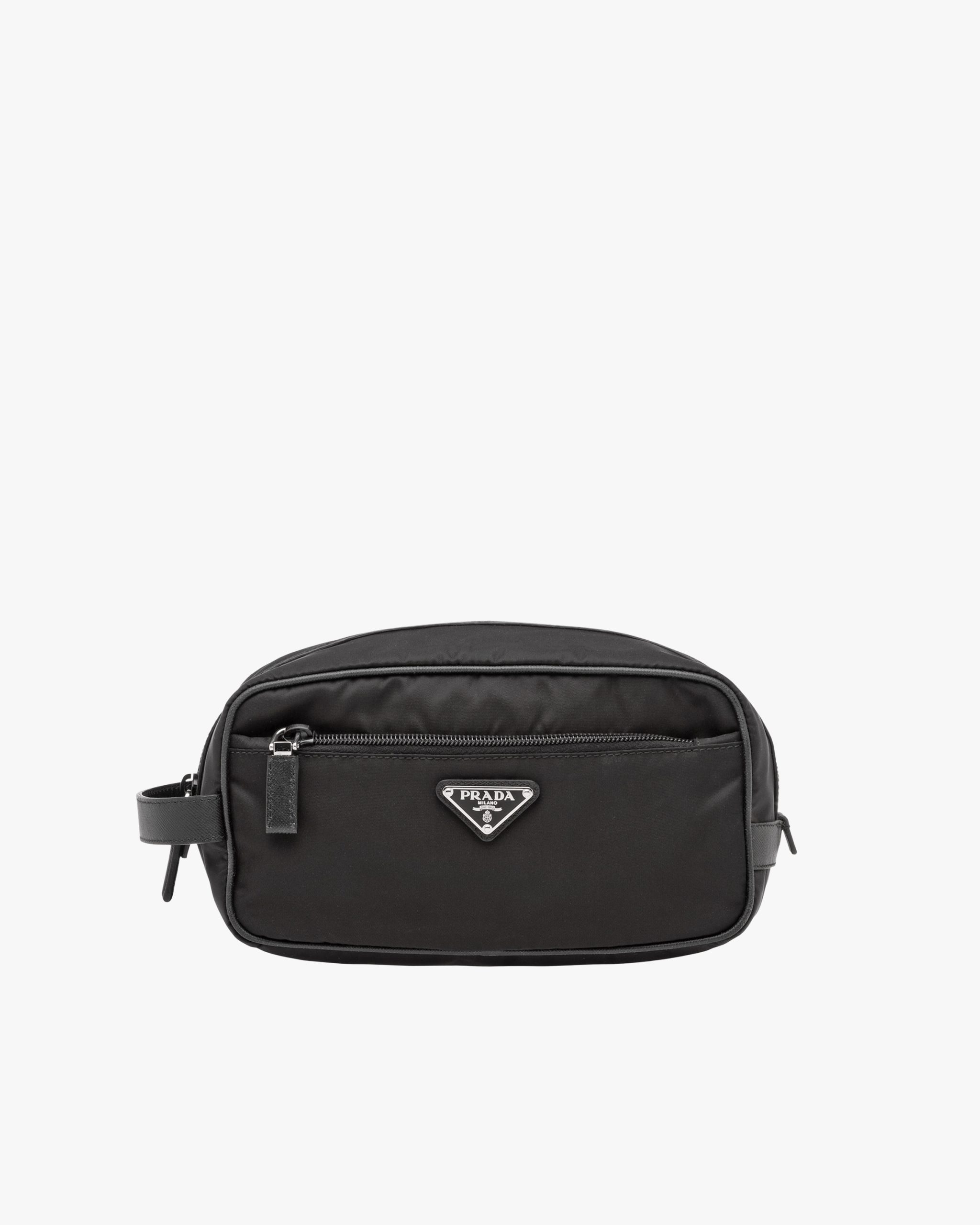 This travel pouch with a sleek, functional design is made of Re-Nylon, a functional material and vehicle of experimentation produced from recycled and purified plastic trash collectsed in the oceans, fishing nets, and textile fiber waste. The accessory with enameled triangle logo2 and top zipper closure is decorated with Saffiano leather details, calf leather of the highest quality defined by a crosshatch texture and wax finish that identifies with traditional Italian leather goods production.