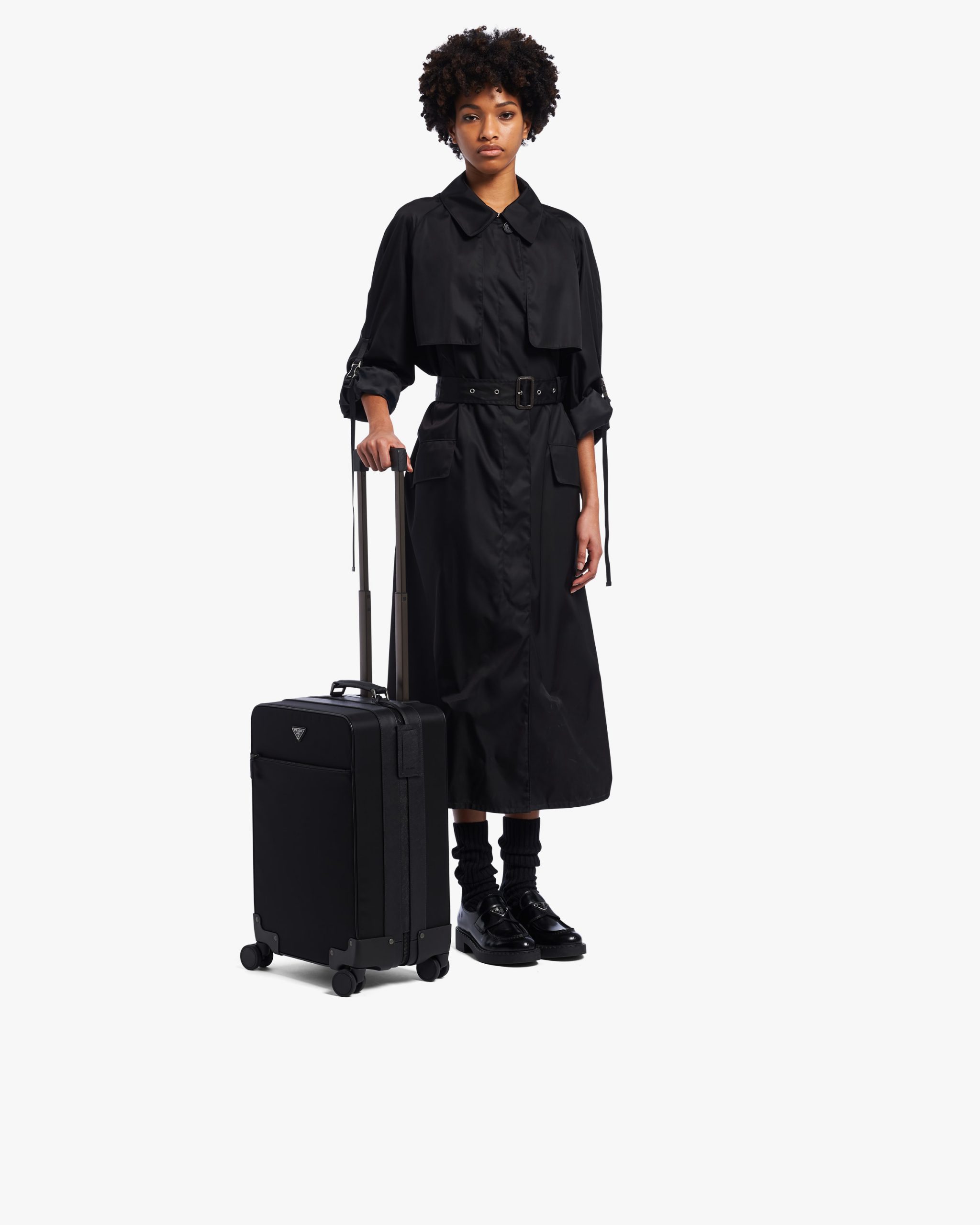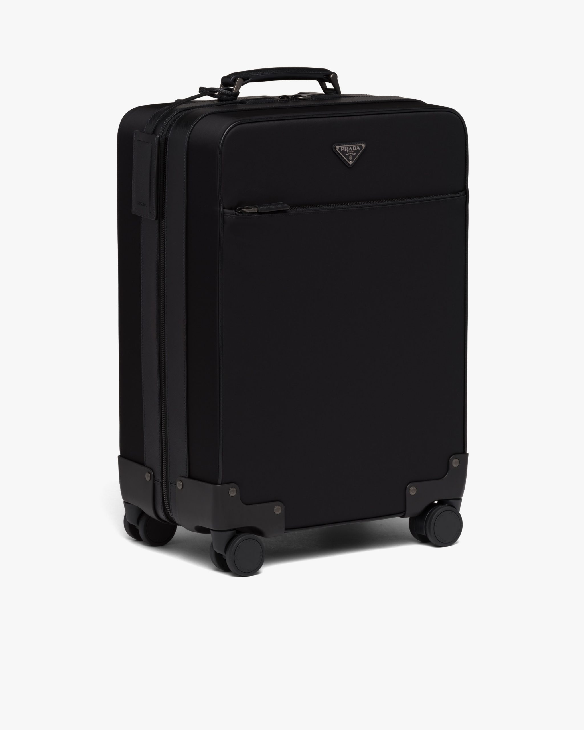 This trolley, with a combination of traditional materials and technologically innovative fibers, is made of Re-Nylon gabardine fabric and Saffiano leather. A functional material and vehicle of experimentation, Re-Nylon is a regenerated nylon yarn produced from recycled and purified plastic trash recovered in the oceans, fishing nets, and textile fiber waste. It is combined in this trolley with Saffiano leather, calf leather of the highest quality defined by a crosshatch texture and wax finish.