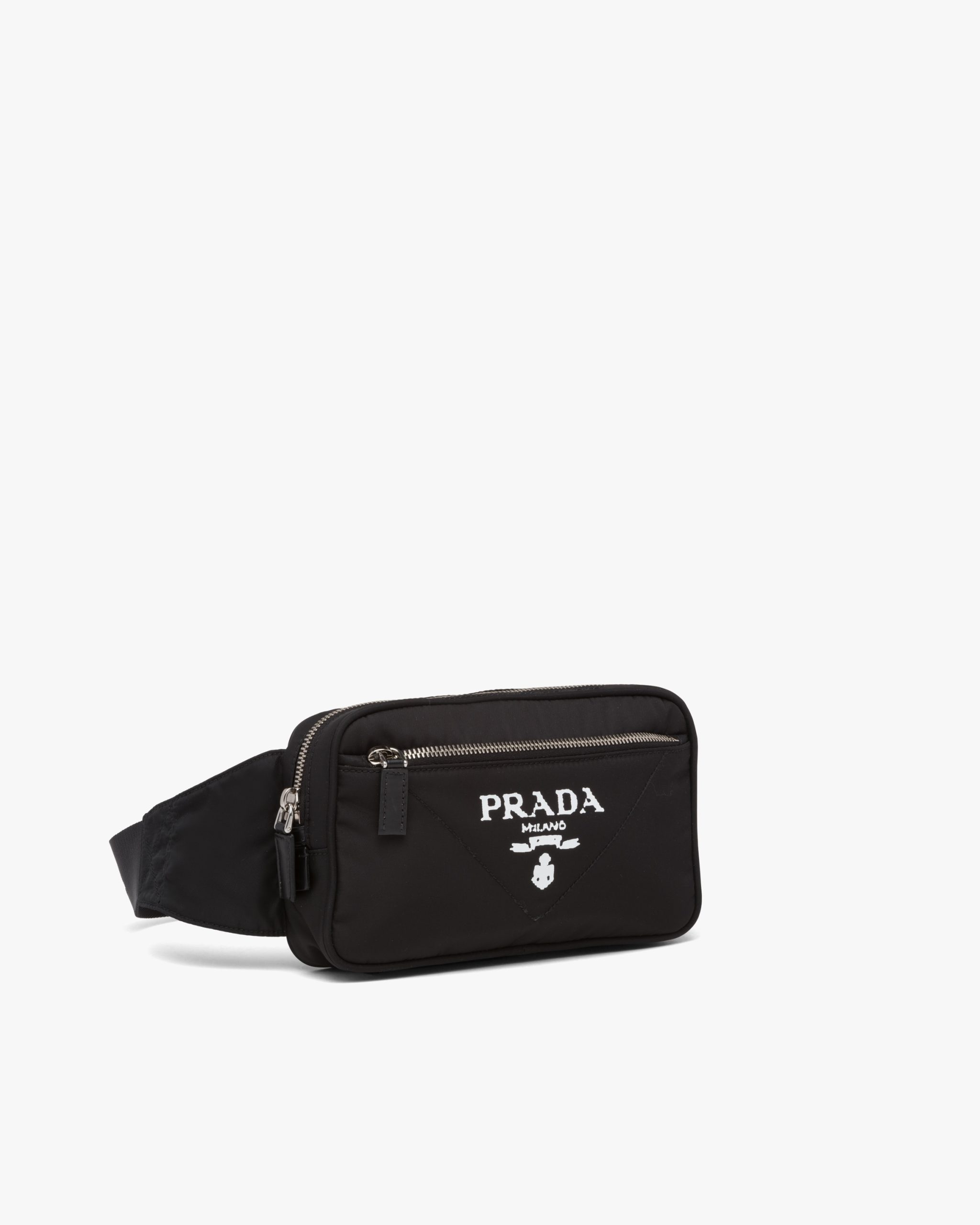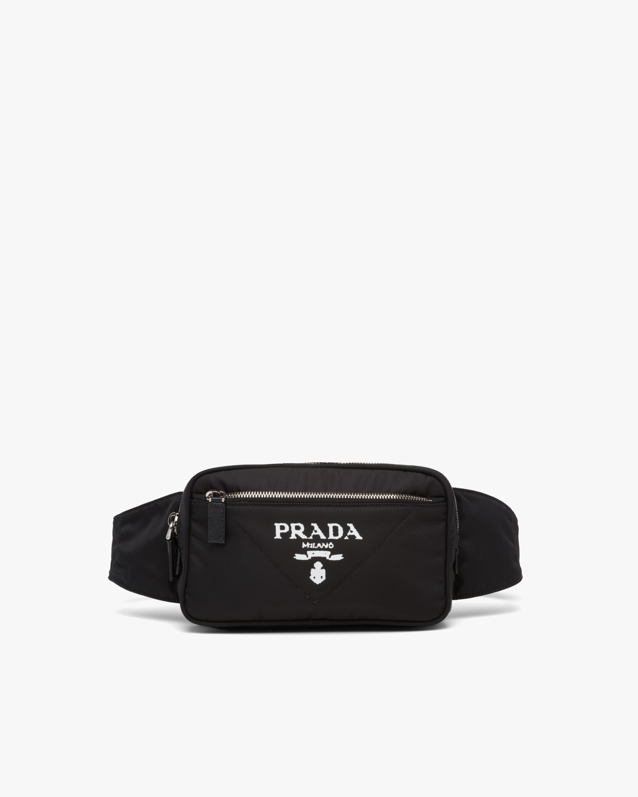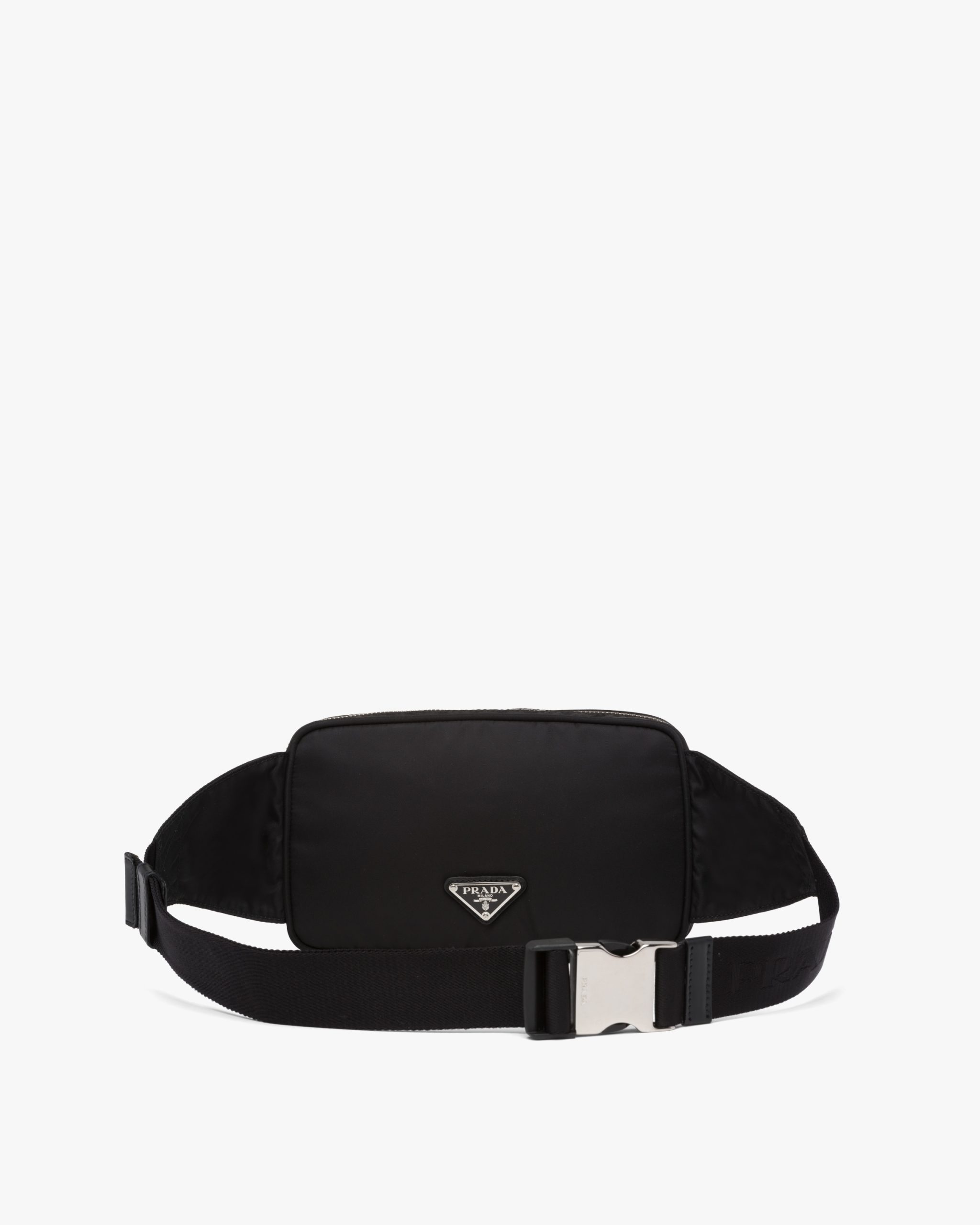 This belt bag with a distinctive square shape is made of Re-Nylon, a functional material and medium of experimentation, produced from recycled, purified plastic materials collectsed in the ocean, fishing nets, and textile fibers. The accessory characterized by the roomy zipper pocket on the front has a classic adjustable belt with buckle.