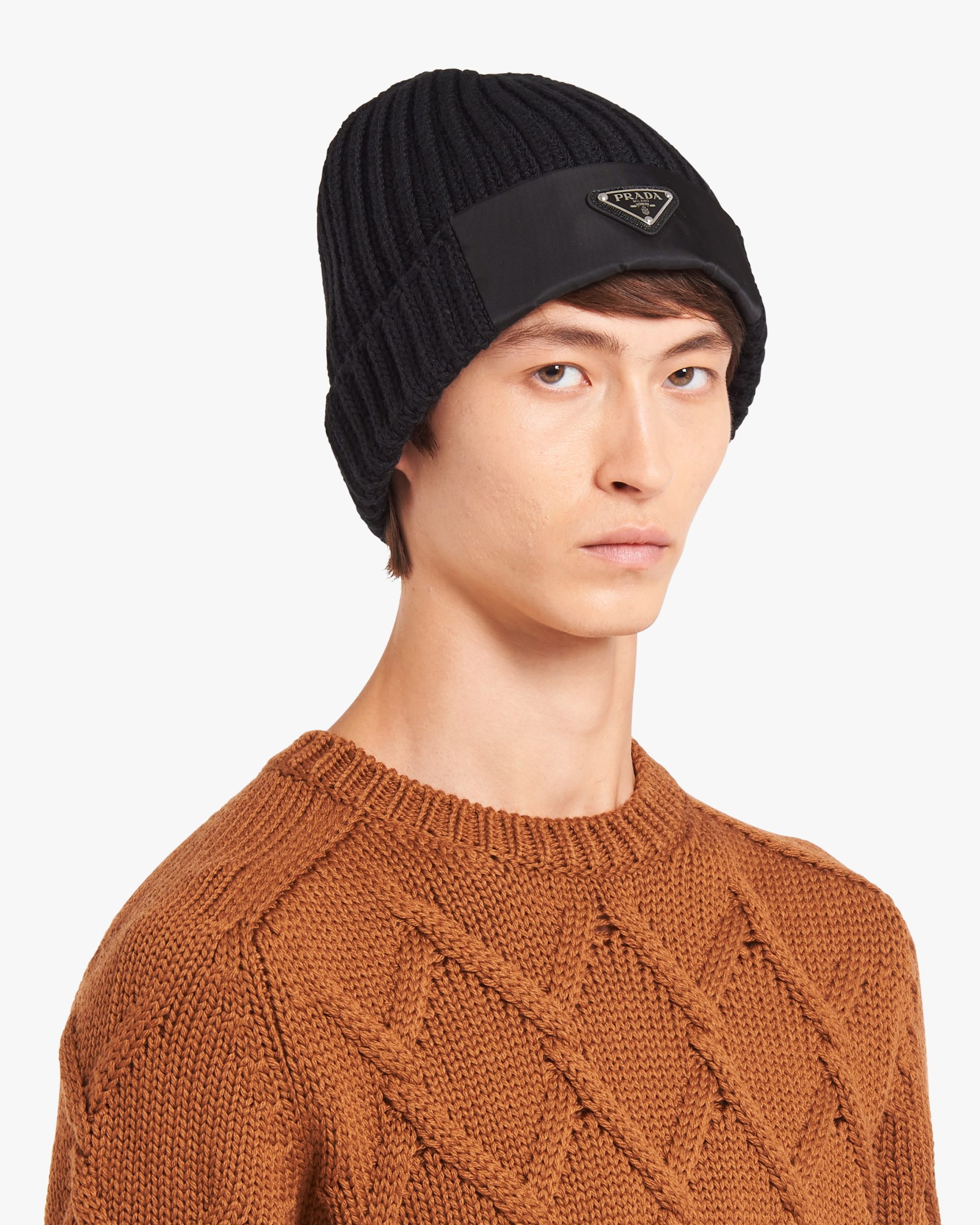 This Shaker knit cap with enameled metal triangle logo2 is made of wool and Re-Nylon gabardine, the distinctive and innovative fabric by Prada.