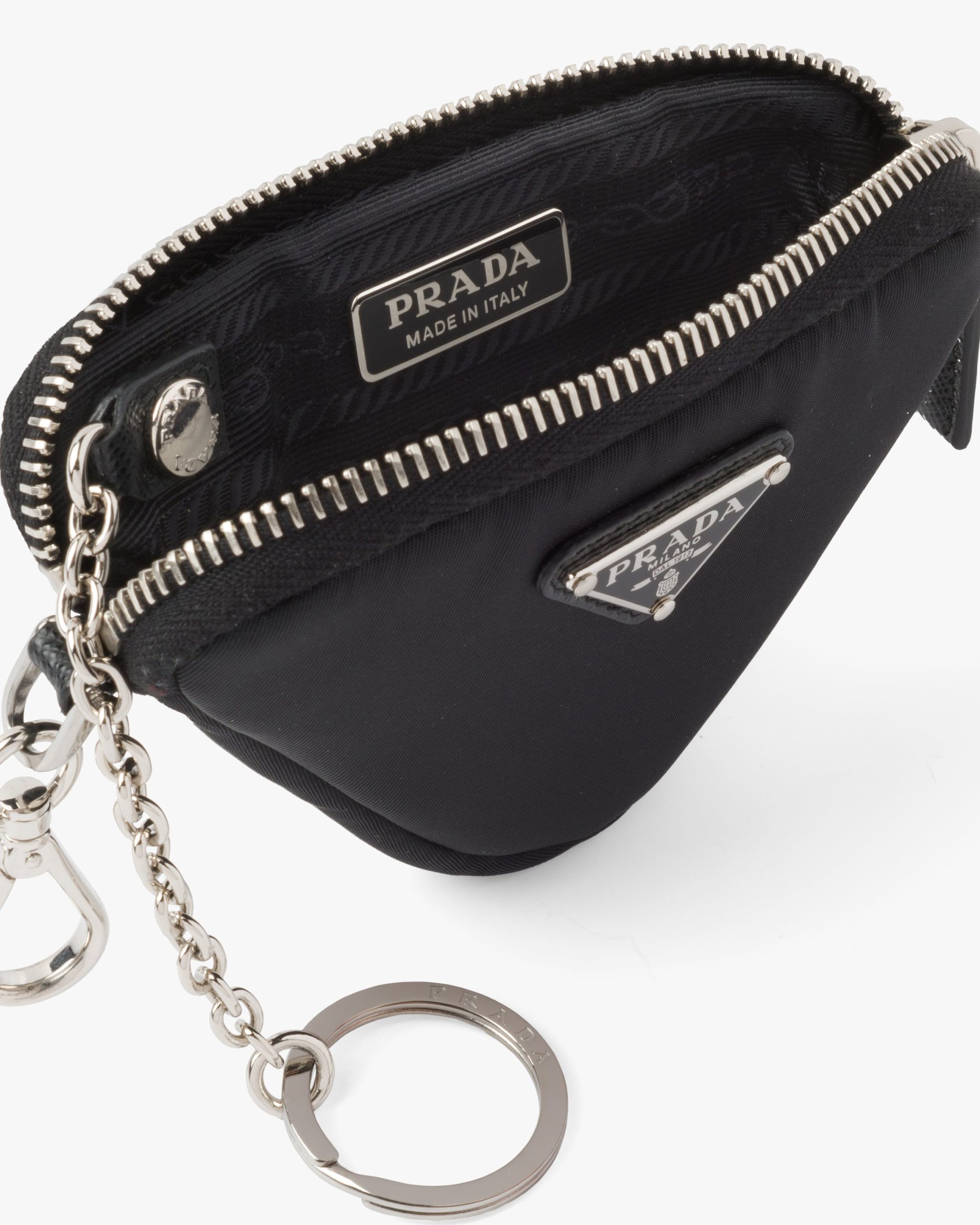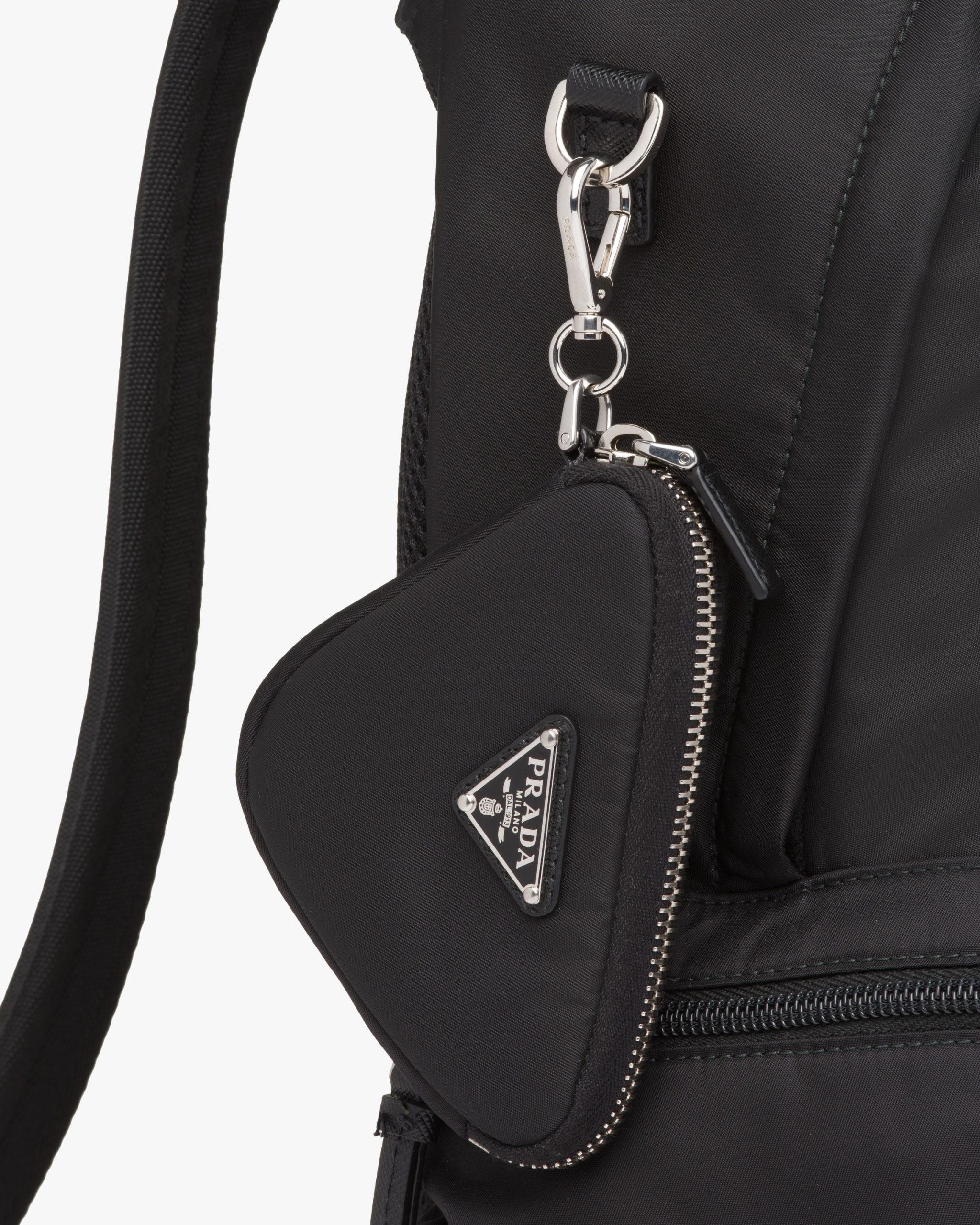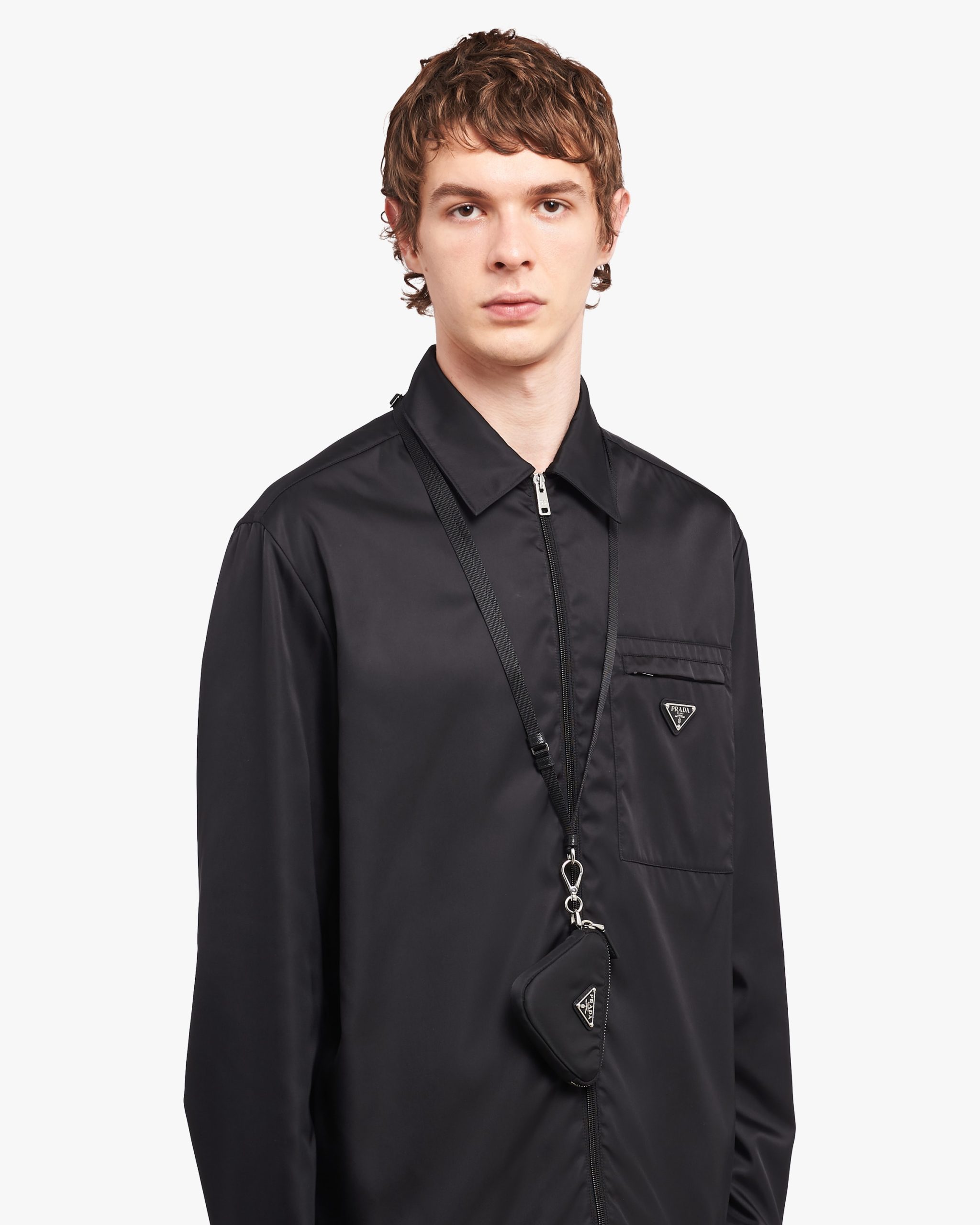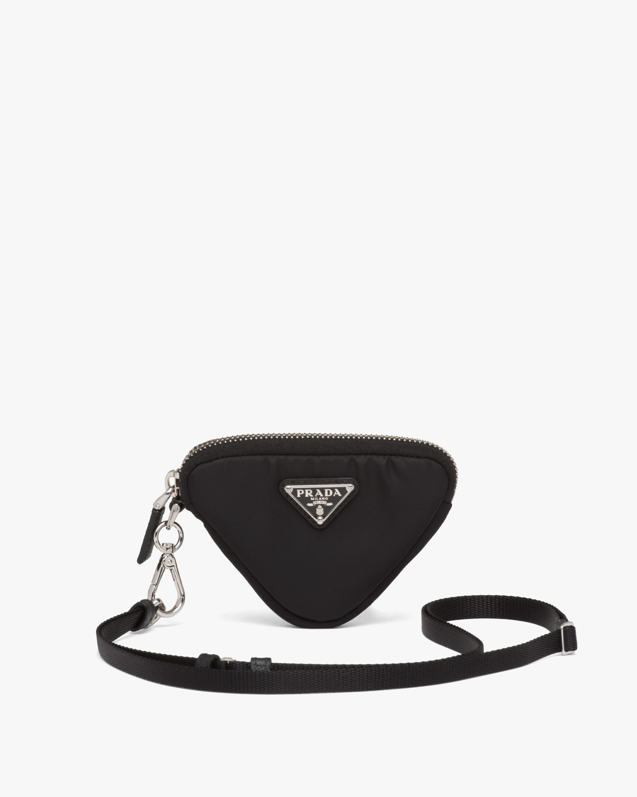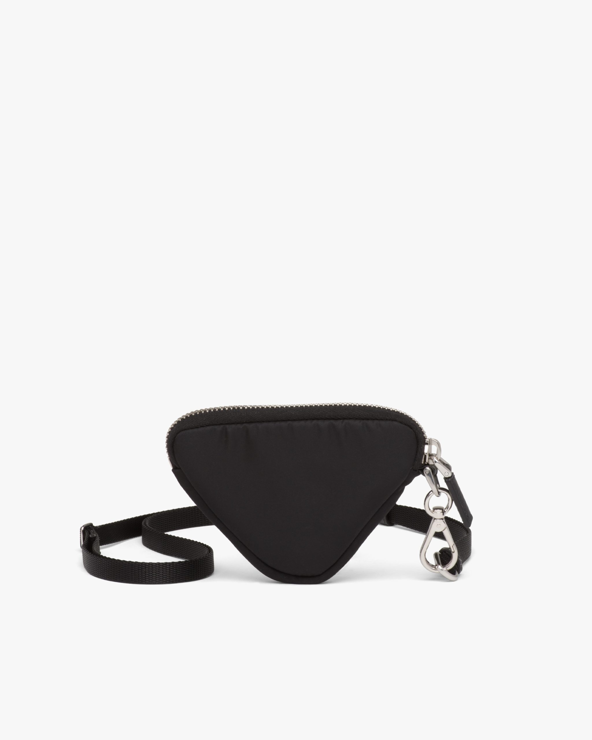 Compact in design, this padded mini pouch is made of innovative Re-Nylon, a regenerated nylon yarn produced from recycled and purified plastic trash collectsed in the ocean, fishing nets, and textile waste fibers. The accessory with zipper stands out for its adjustable neck strap and the enameled metal triangle logo2.