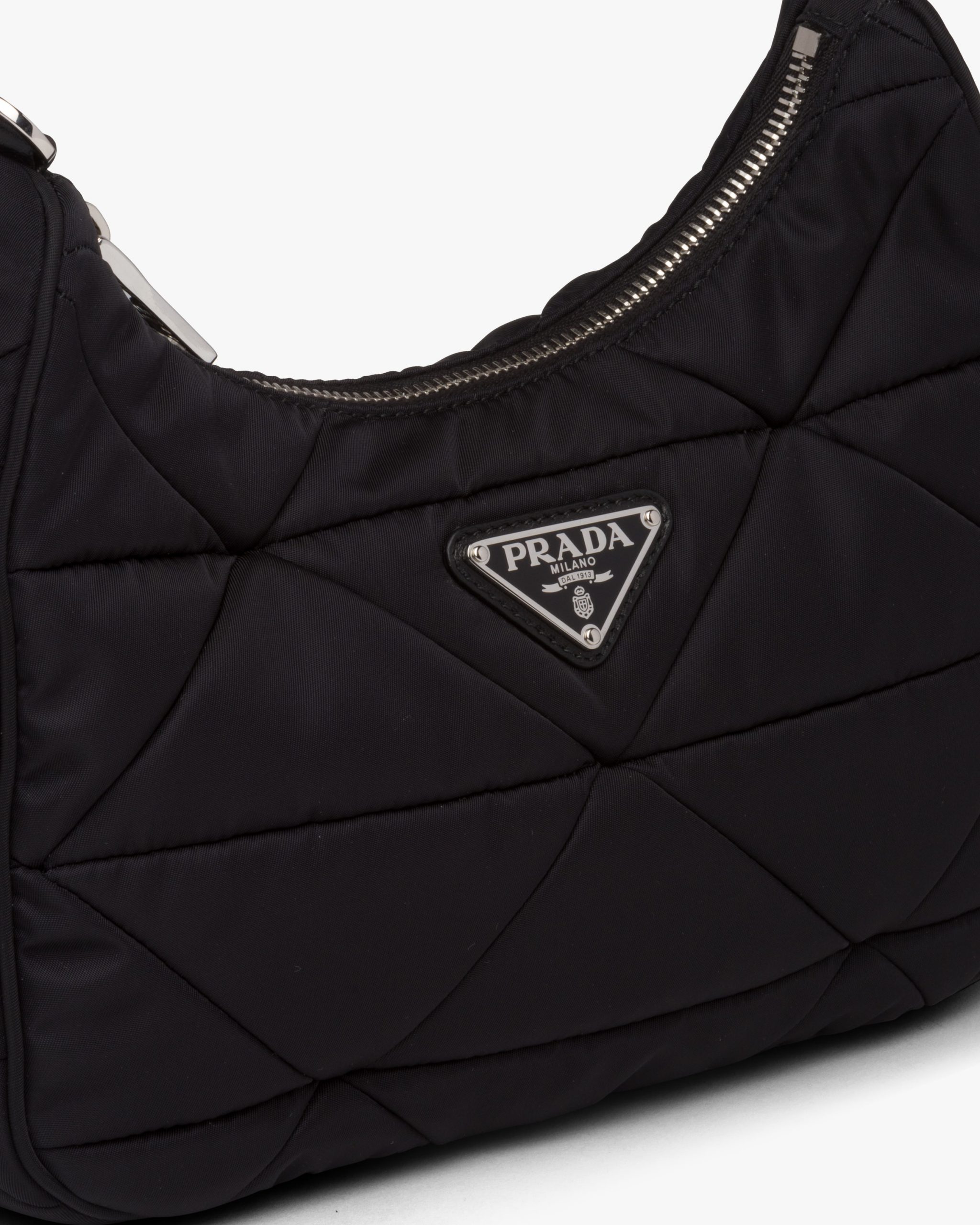 A patchwork effect triangle motif characterizes this padded hobo bag made of Re-Nylon and designed to also be worn as a shoulder bag thanks to the adjustable logo2-print strap. Embellished on the front by the iconic enameled triangle logo2, the multifunctional accessory is completed with a detachable nylon zipper pouch that attaches to the shoulder strap.