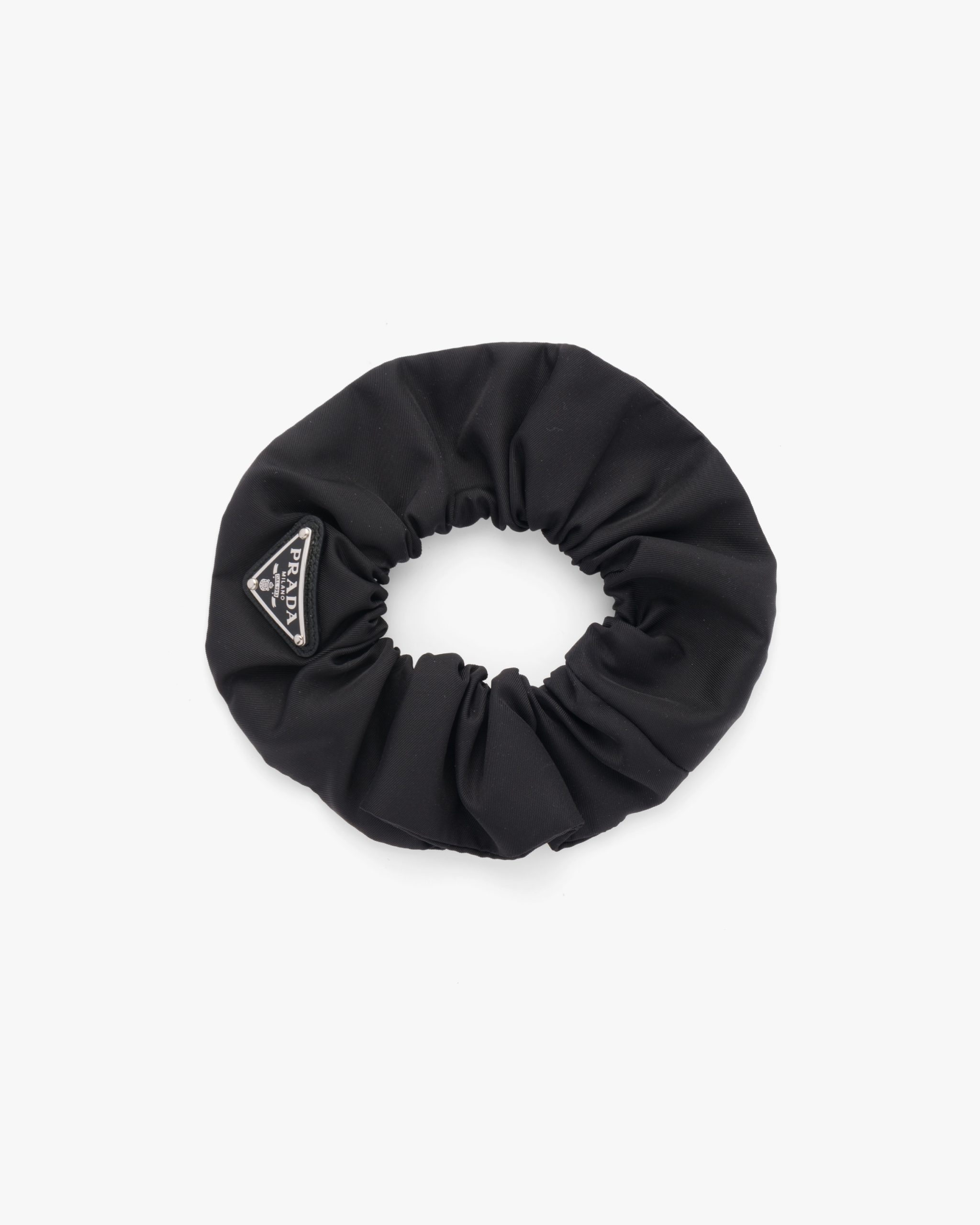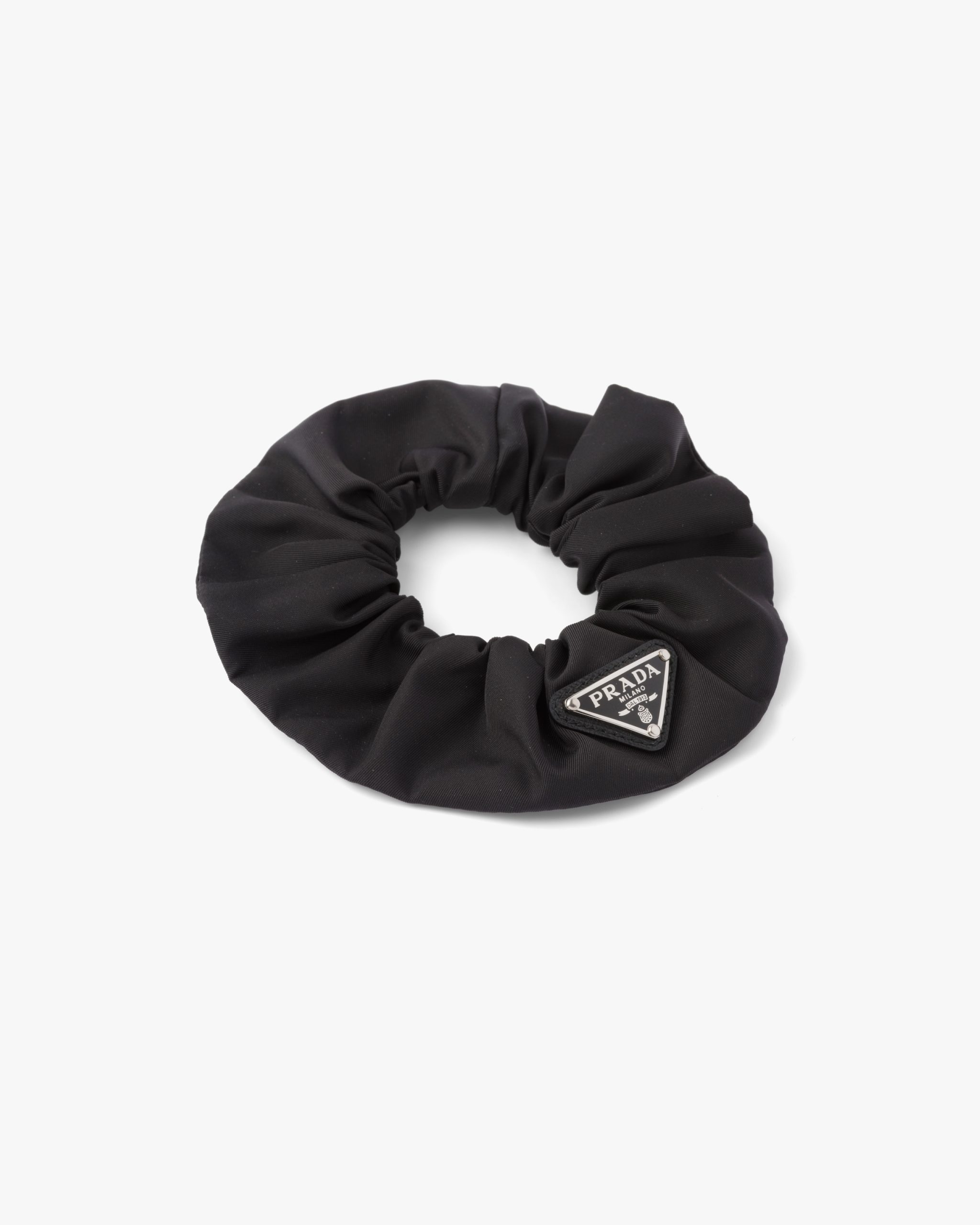 This scrunchie, a sophisticated accessory reimagined with technical charm, is made of Re-Nylon: regenerated nylon yarn (ECONYL?)produced from recycled, purified plastic trash collectsed in the ocean, fishing nets and textile waste fibers.