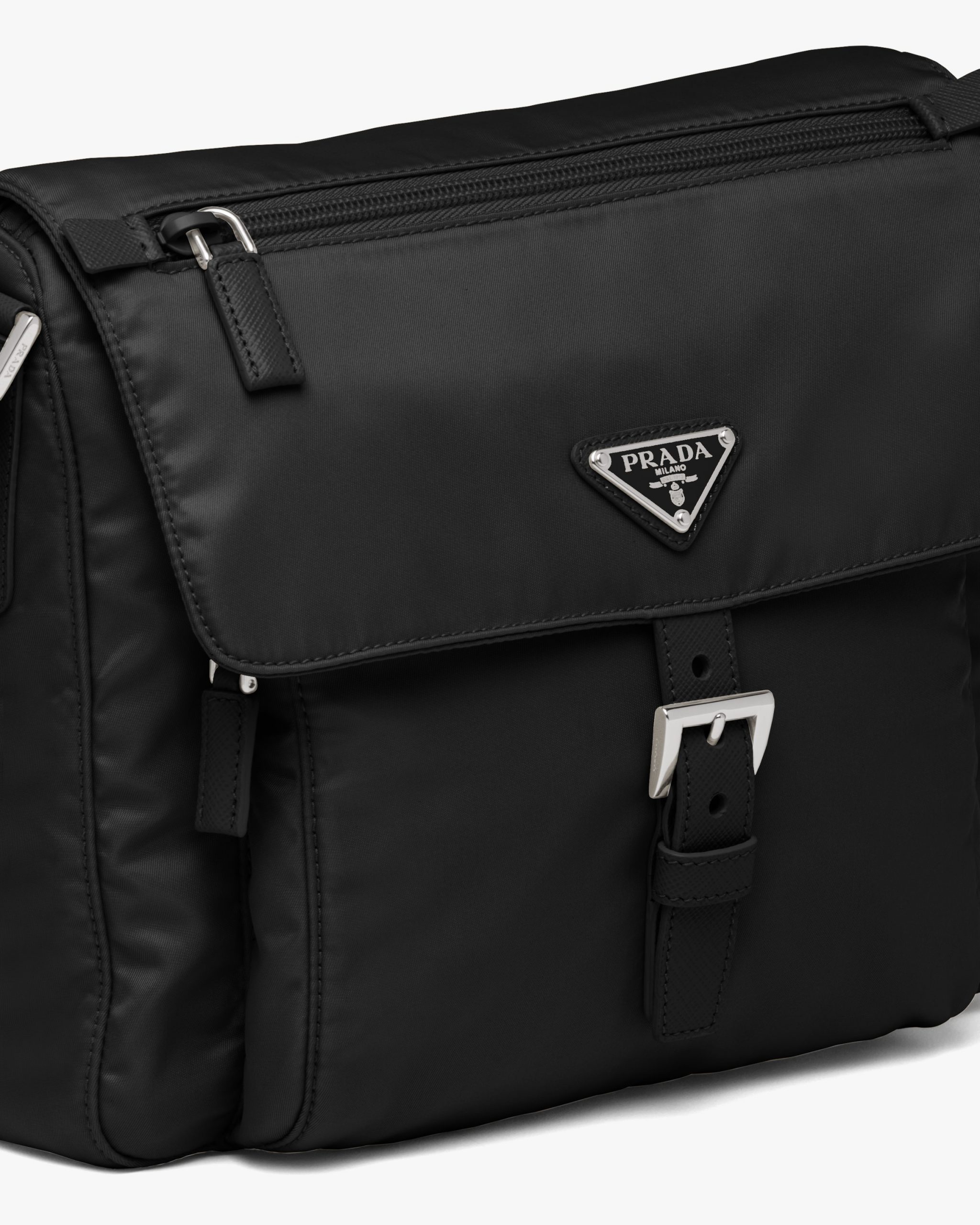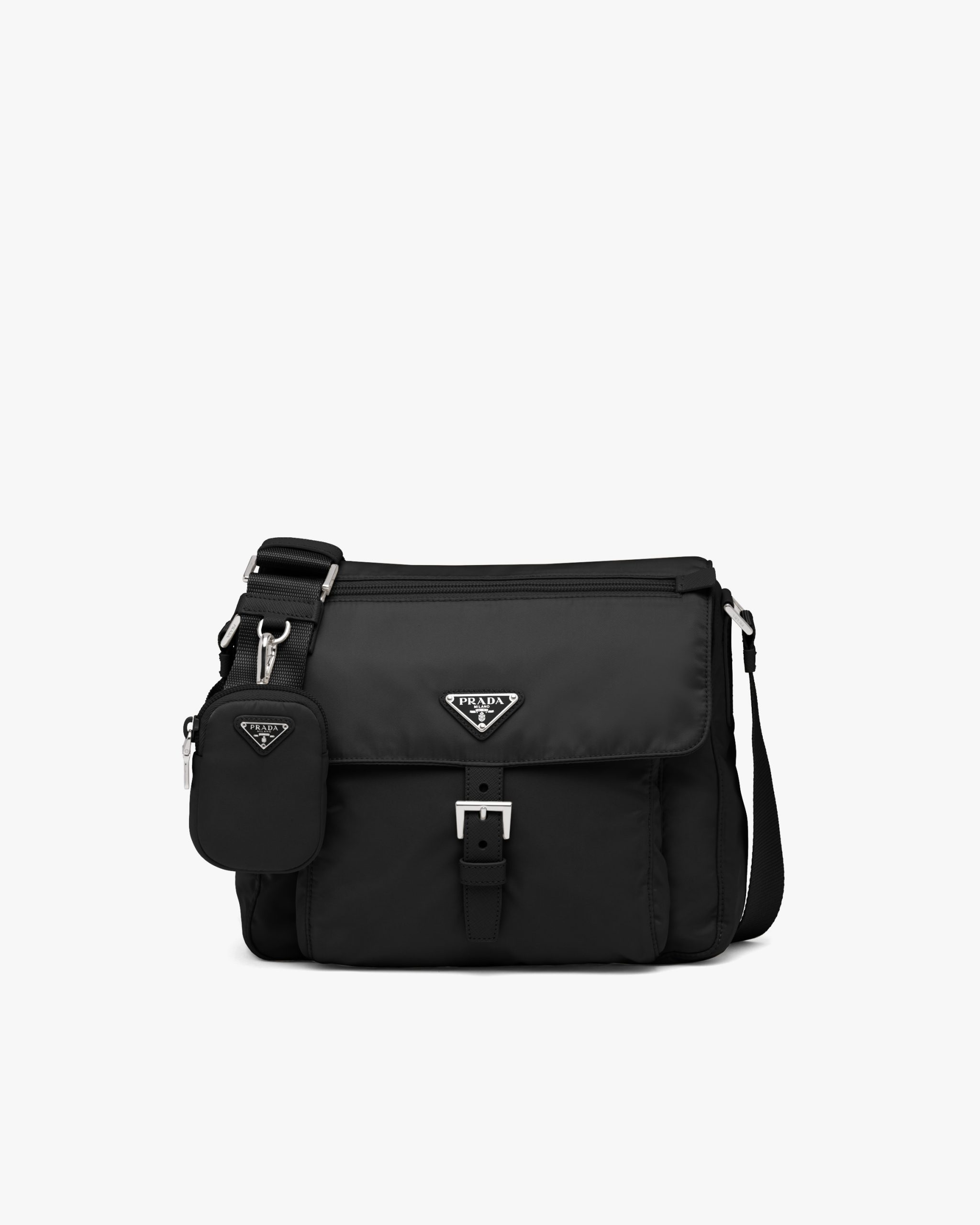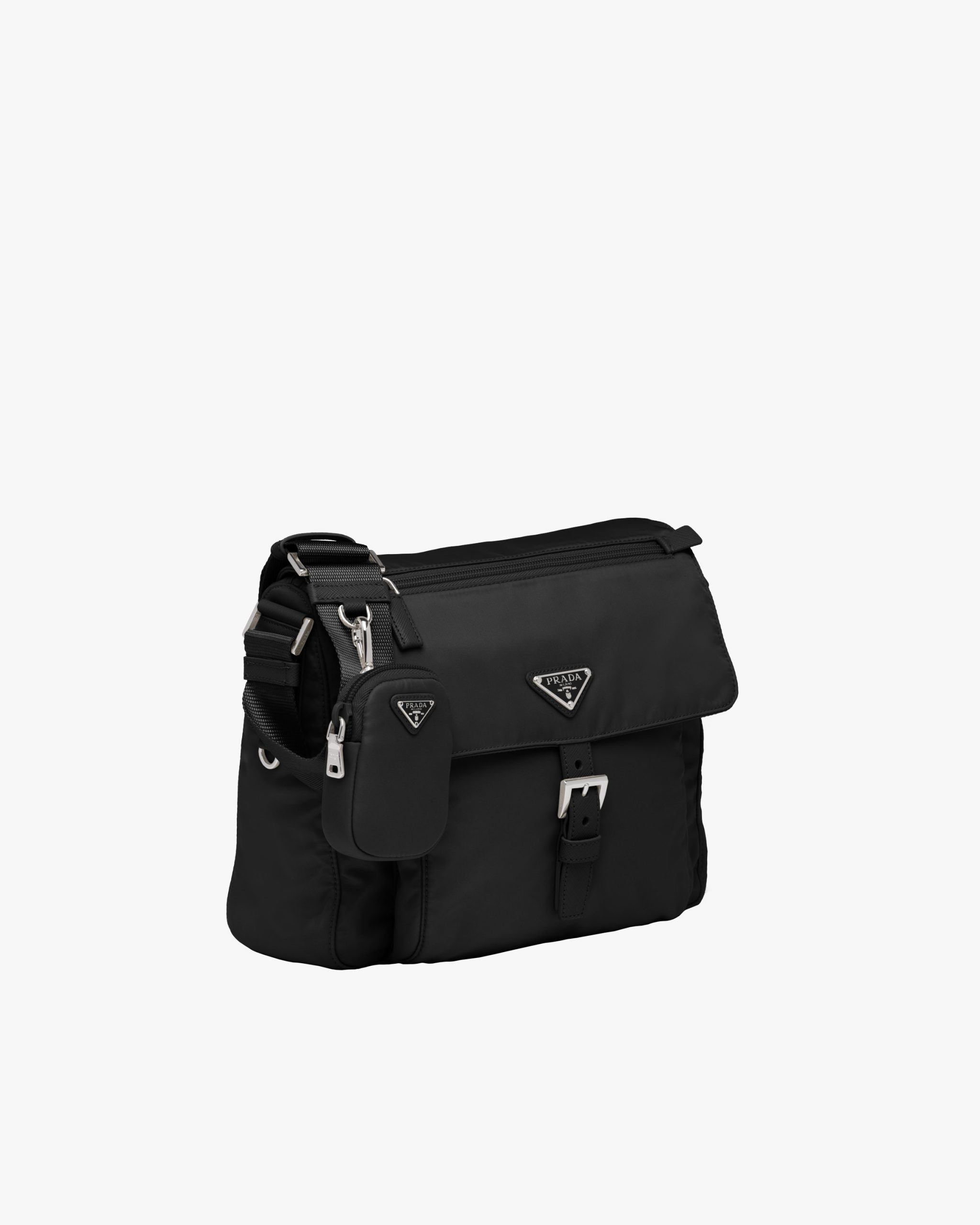 This practical leather shoulder bag is accented by the enameled metal triangle logo2 and the external pocket with buckle. The accessory is made of Prada’s innovative Re-Nylon, a fabric that can be endlessly regenerated, produced from recycled, purified plastic materials collectsed in the ocean.