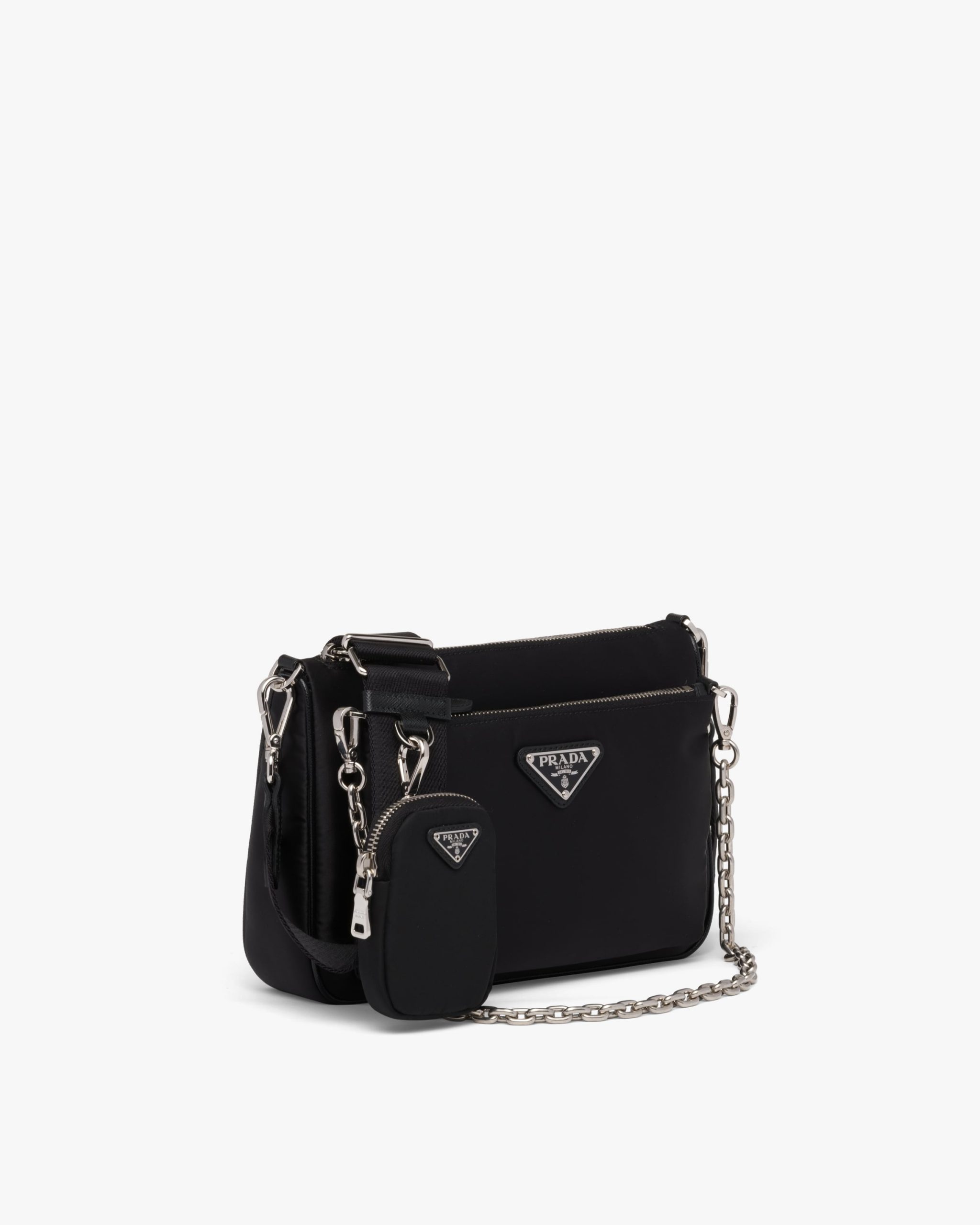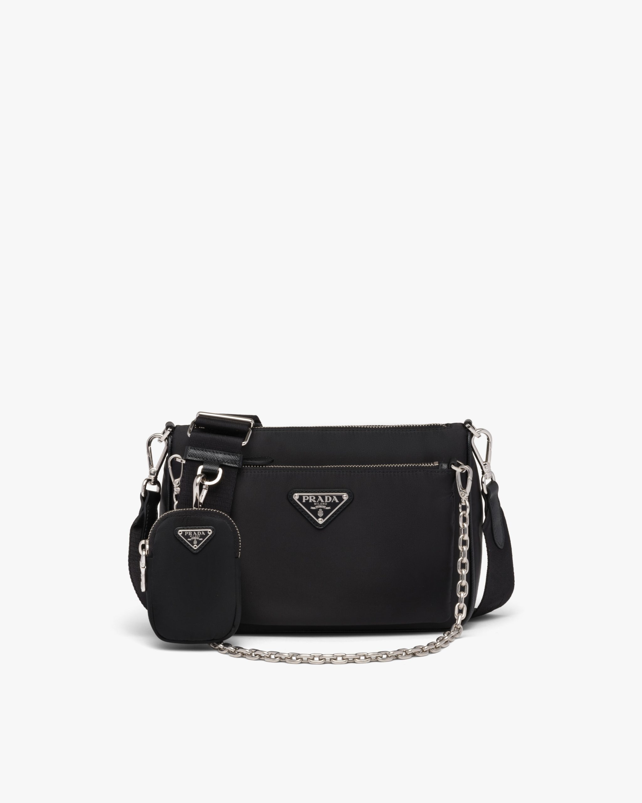 Saffiano leather details add an iconic touch to this shoulder bag made of Re-Nylon, a distinctive fabric of the brand produced from recycled, purified plastic materials collectsed in the ocean, fishing nets, and textile fibers. Its removable details are distinctive: The logo2-print shoulder strap and front pocket with chain that turns into a pouch. The accessory is embellished with the enameled metal triangle logo2.