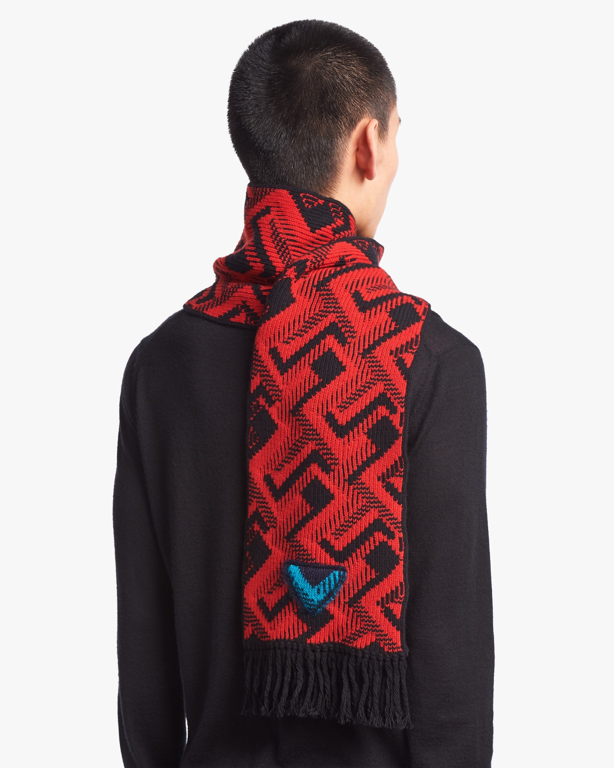 This scarf full of eclectic allure brings jacquard geometric motifs to life, evoking designs from the sixties. The cashmere and wool accessory features Prada’s iconic triangle logo2 in a new knit version animated by an elaborate pattern.