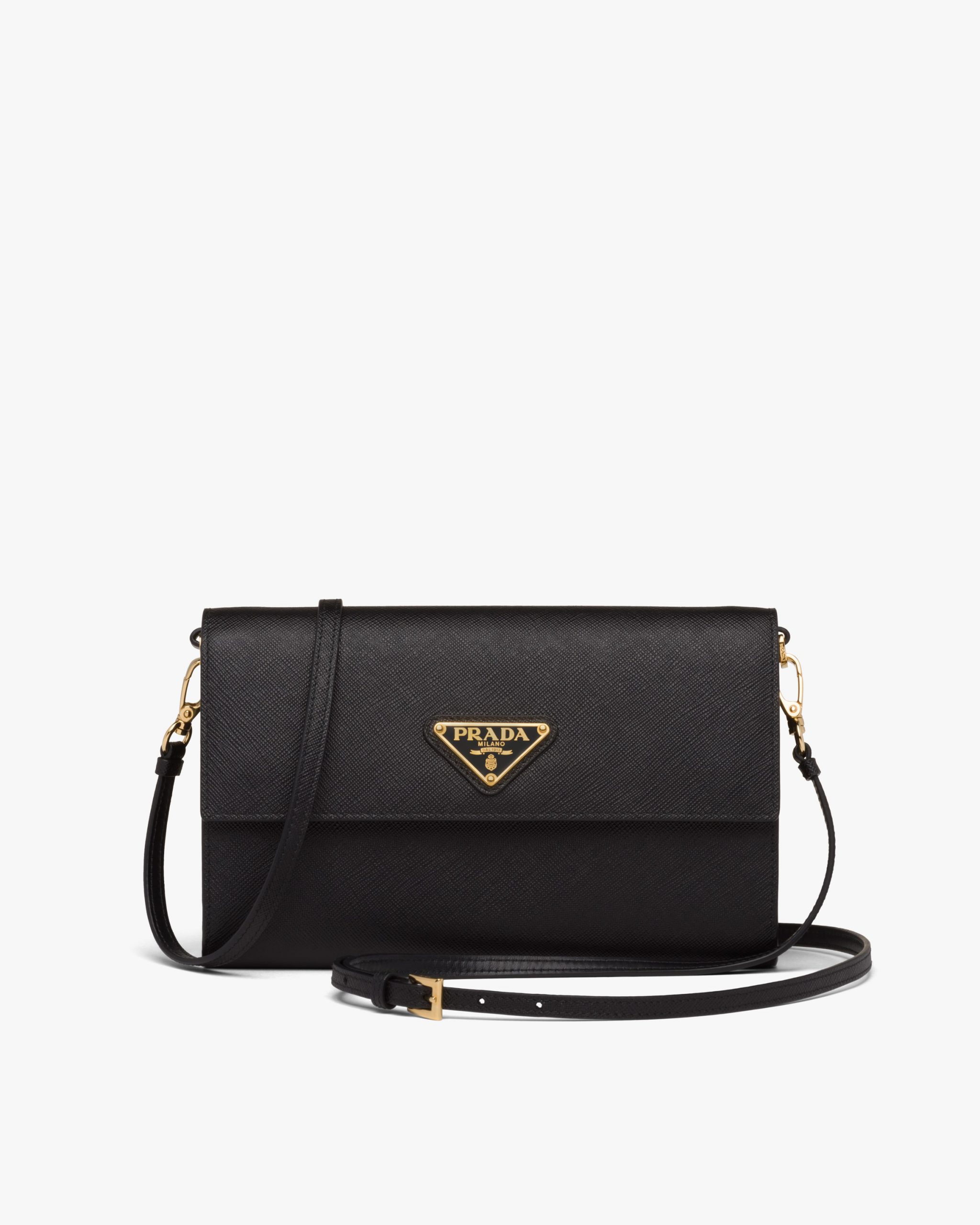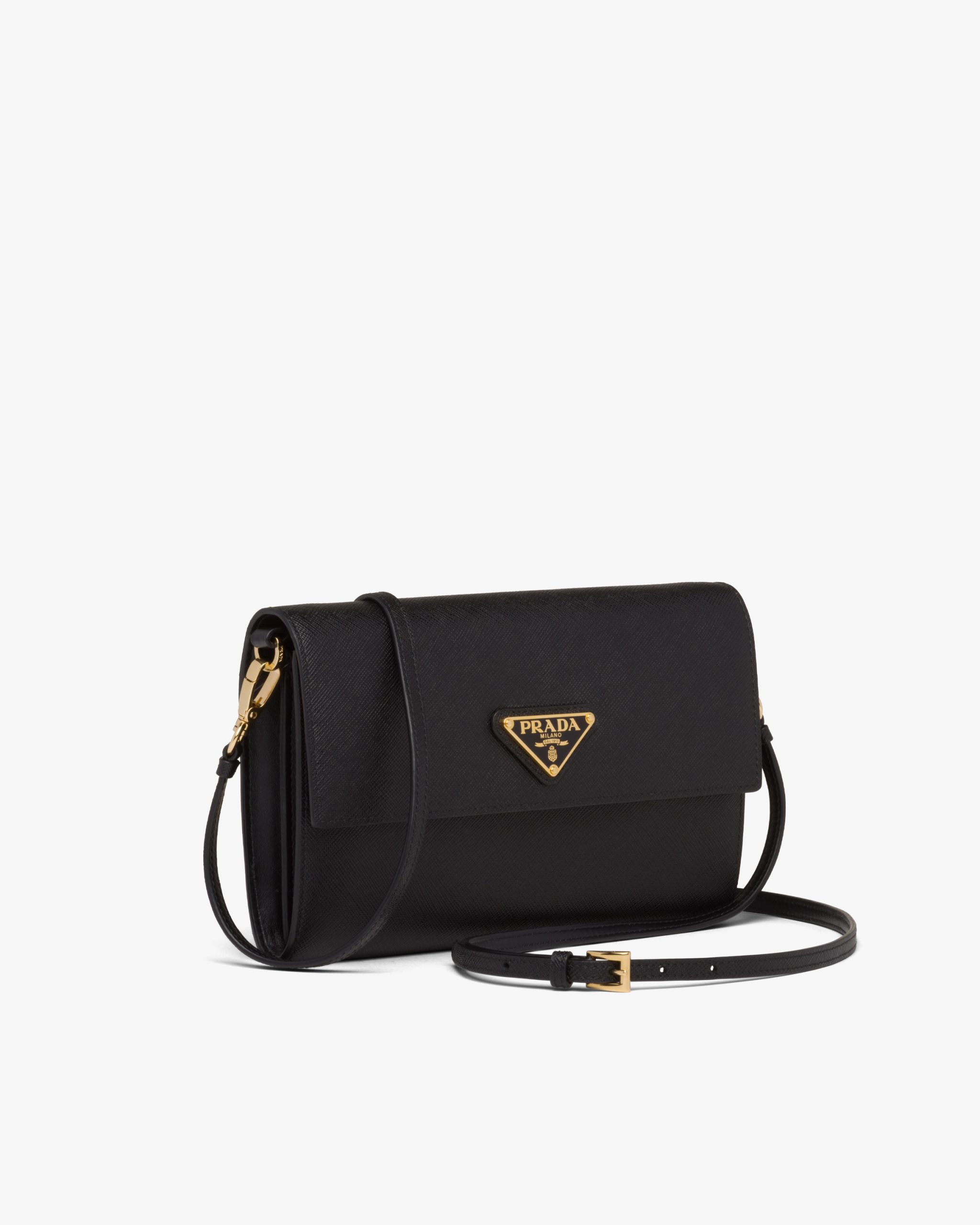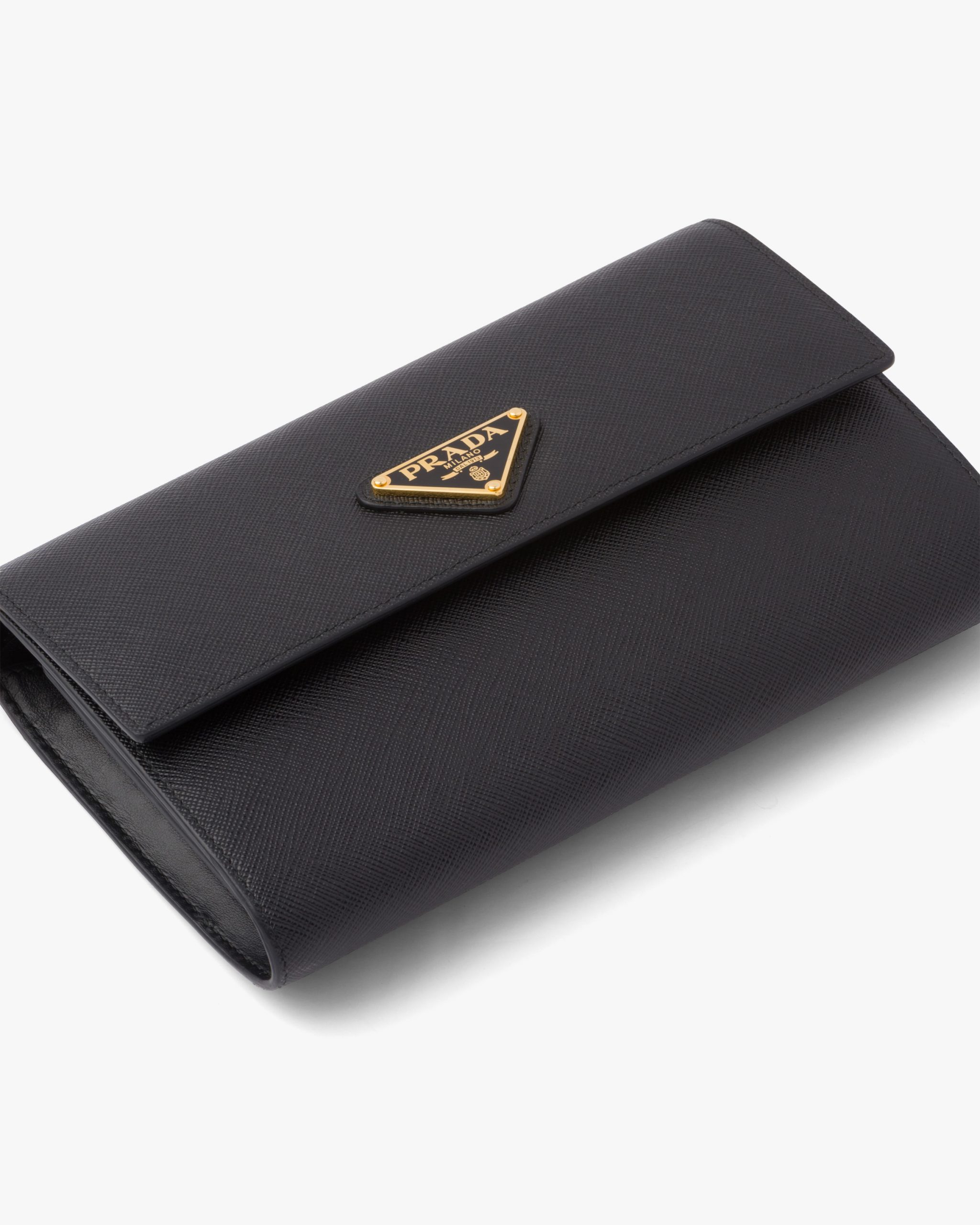 This Saffiano leather wallet embellished with an enameled metal triangle logo2 is even more versatile with its elegant detachable shoulder strap. It has several compartments and pockets inside.
