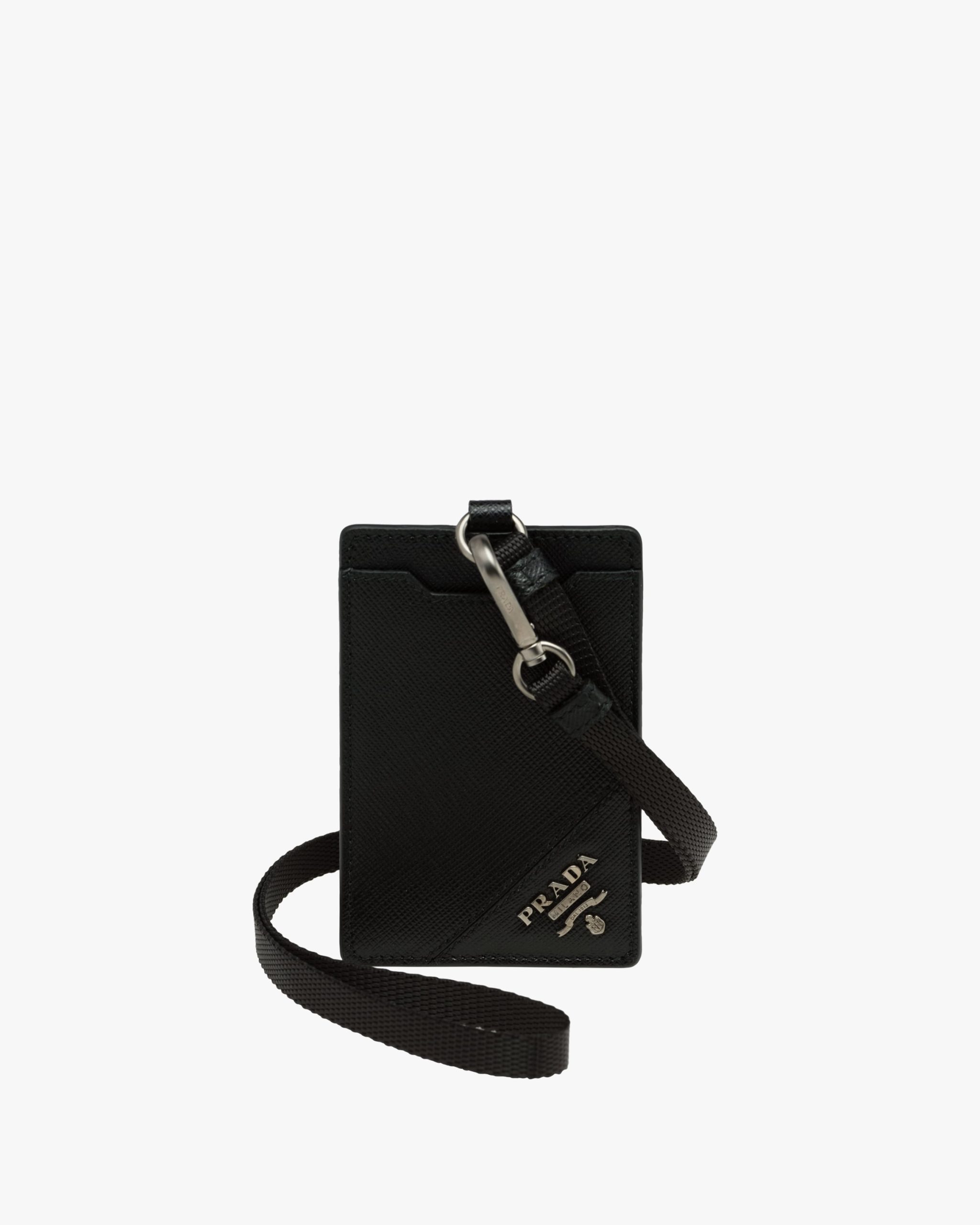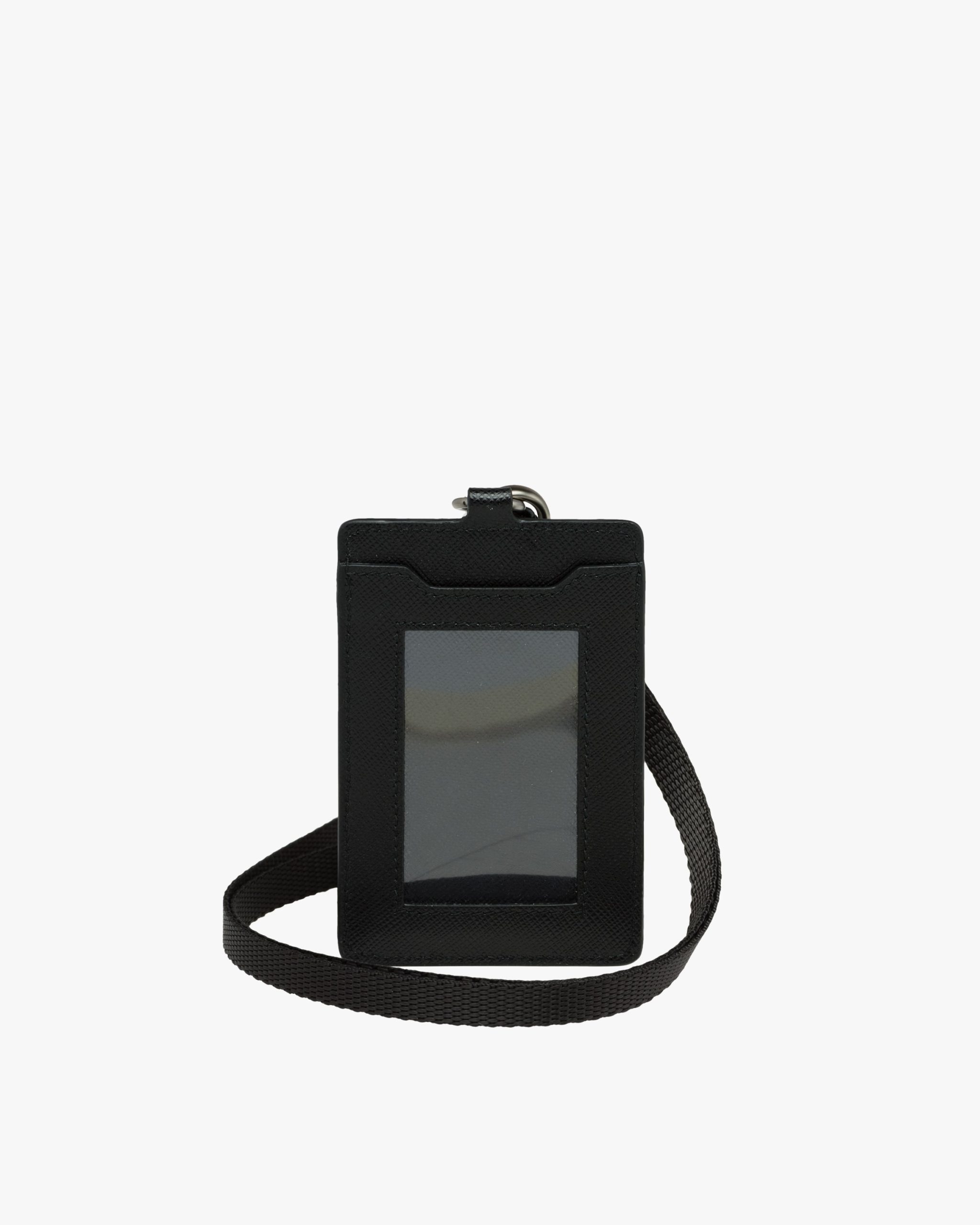 A Saffiano leather badge holder with Prada logo2. This smart and practical piece contains a compartment for credit cards on the front and a transparent window for badges on the back.