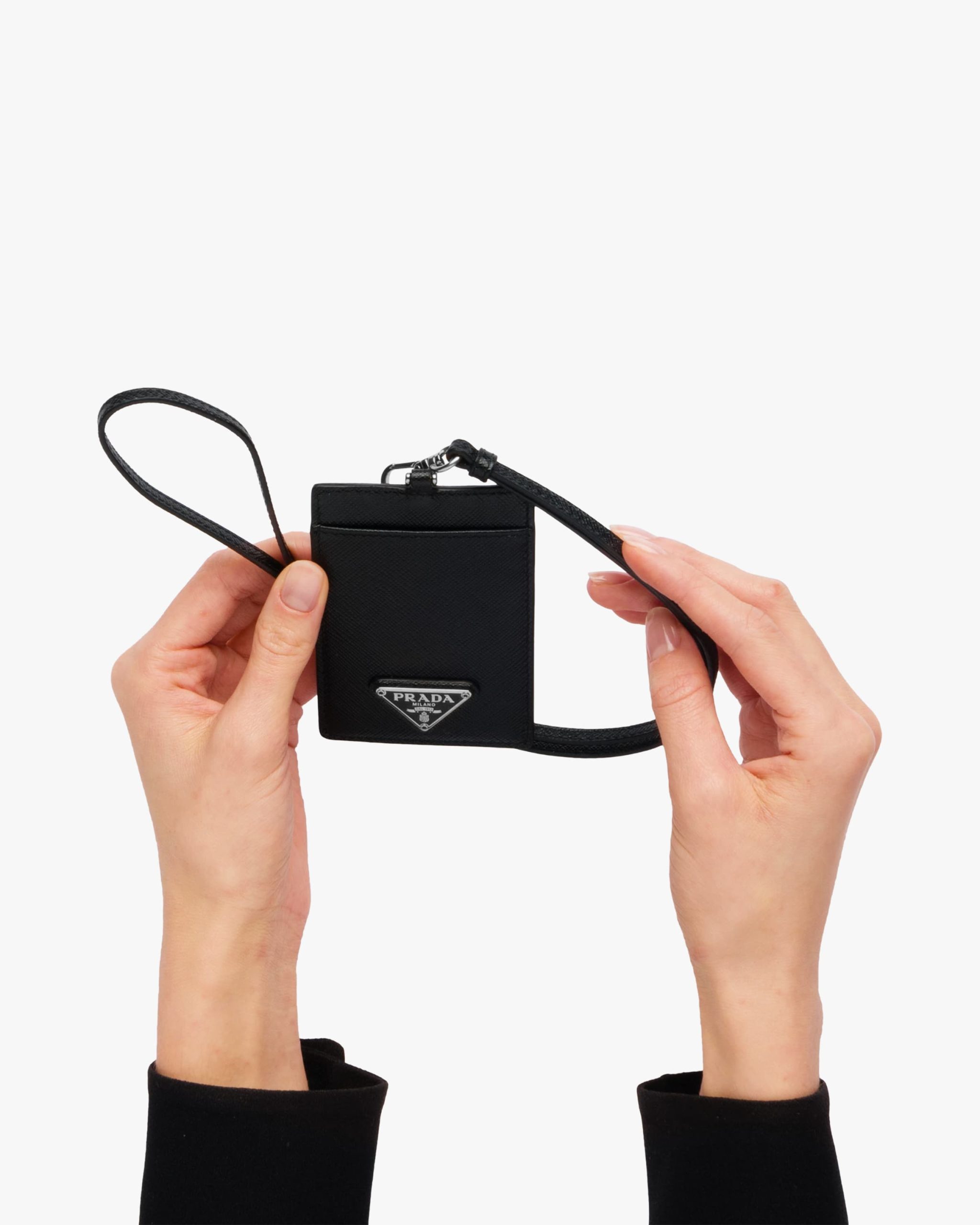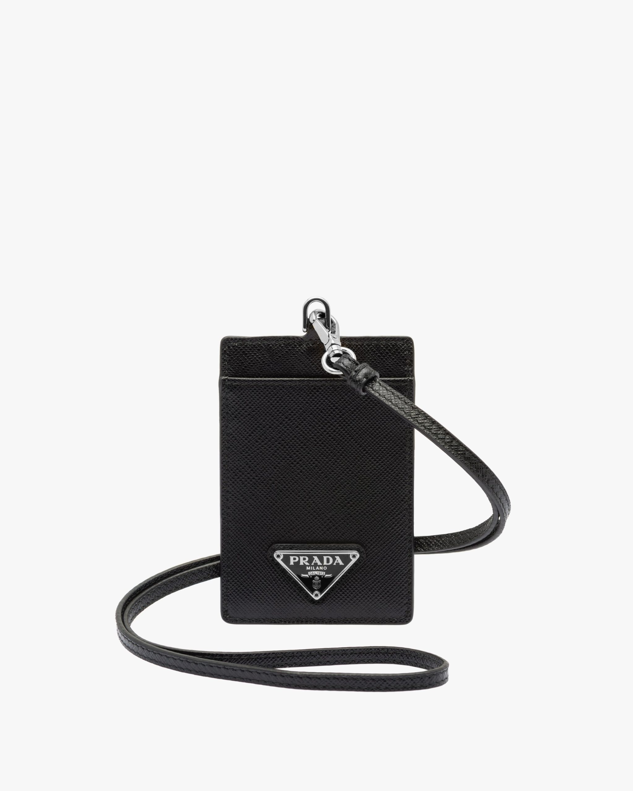 Elegant Saffiano leather badge holder with metal hardware and detachable strap.