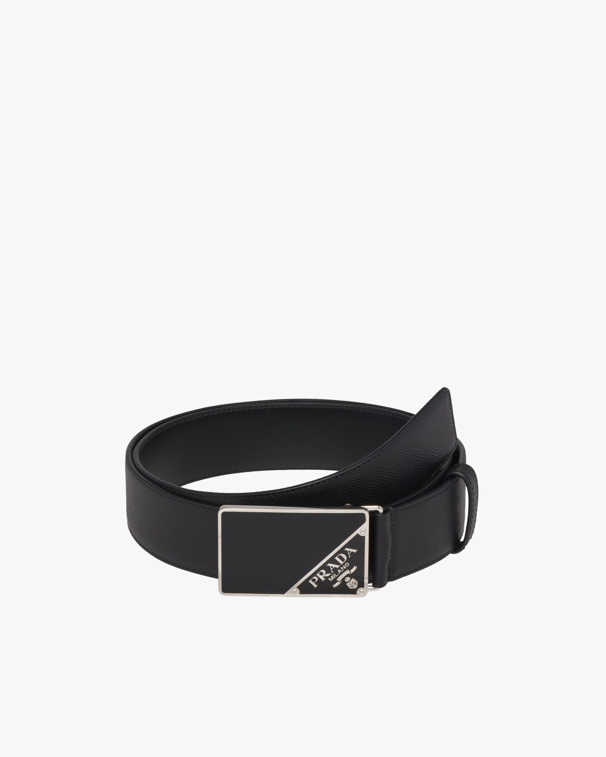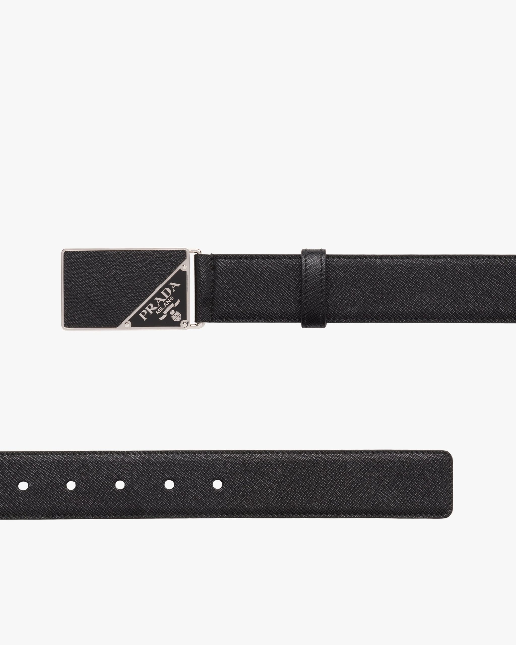 The buckle with Saffiano leather and metal details, decorated with the enameled metal triangle logo2, characterizes this iconic Saffiano leather belt.