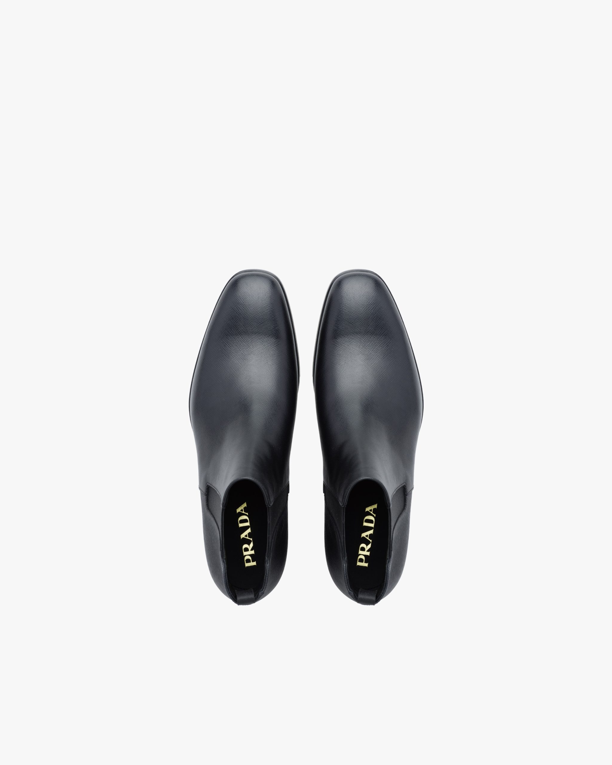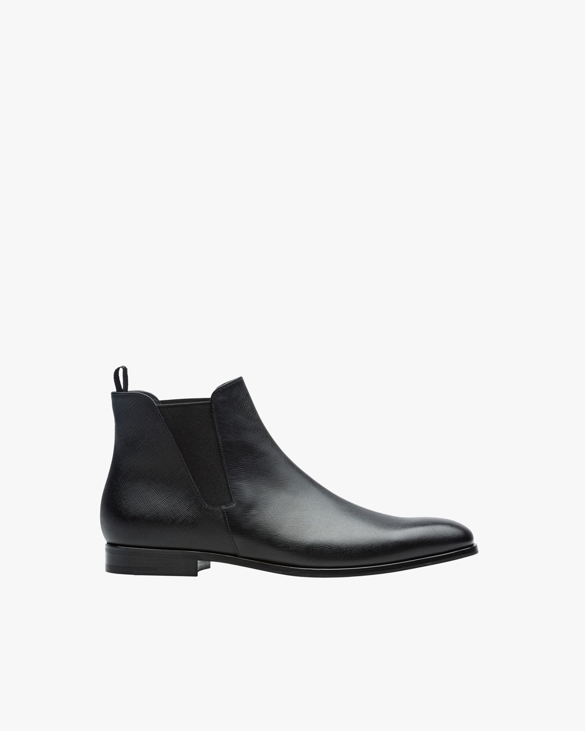 These sophisticated Saffiano leather Chelsea boots have a tapered silhouette and distinctive elasticized side gussets. The leather sole has a non-slip rubber half-sole.