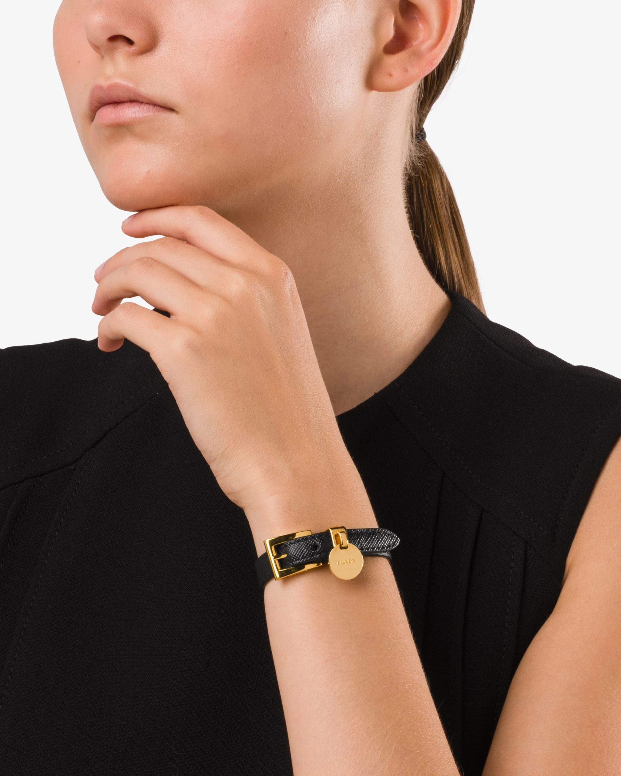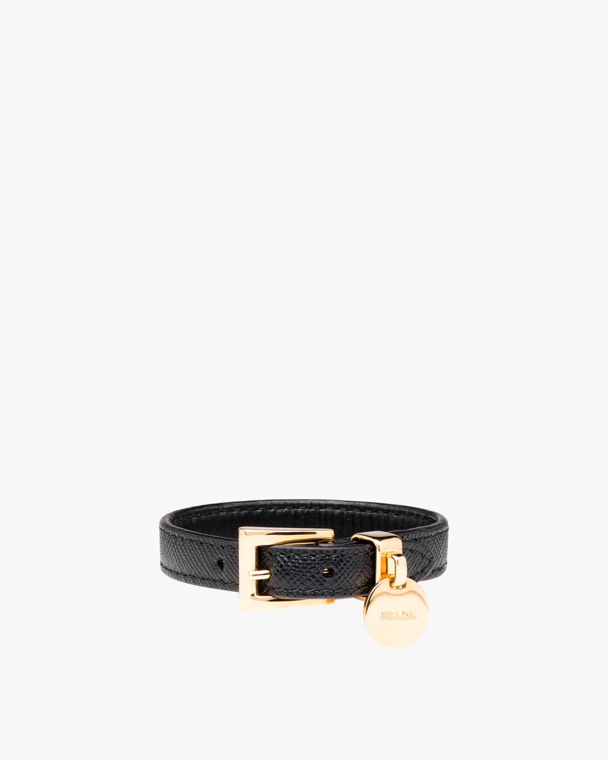 A Saffiano leather bracelet defined by its gold-toned buckle closure and Prada logo2 tag.