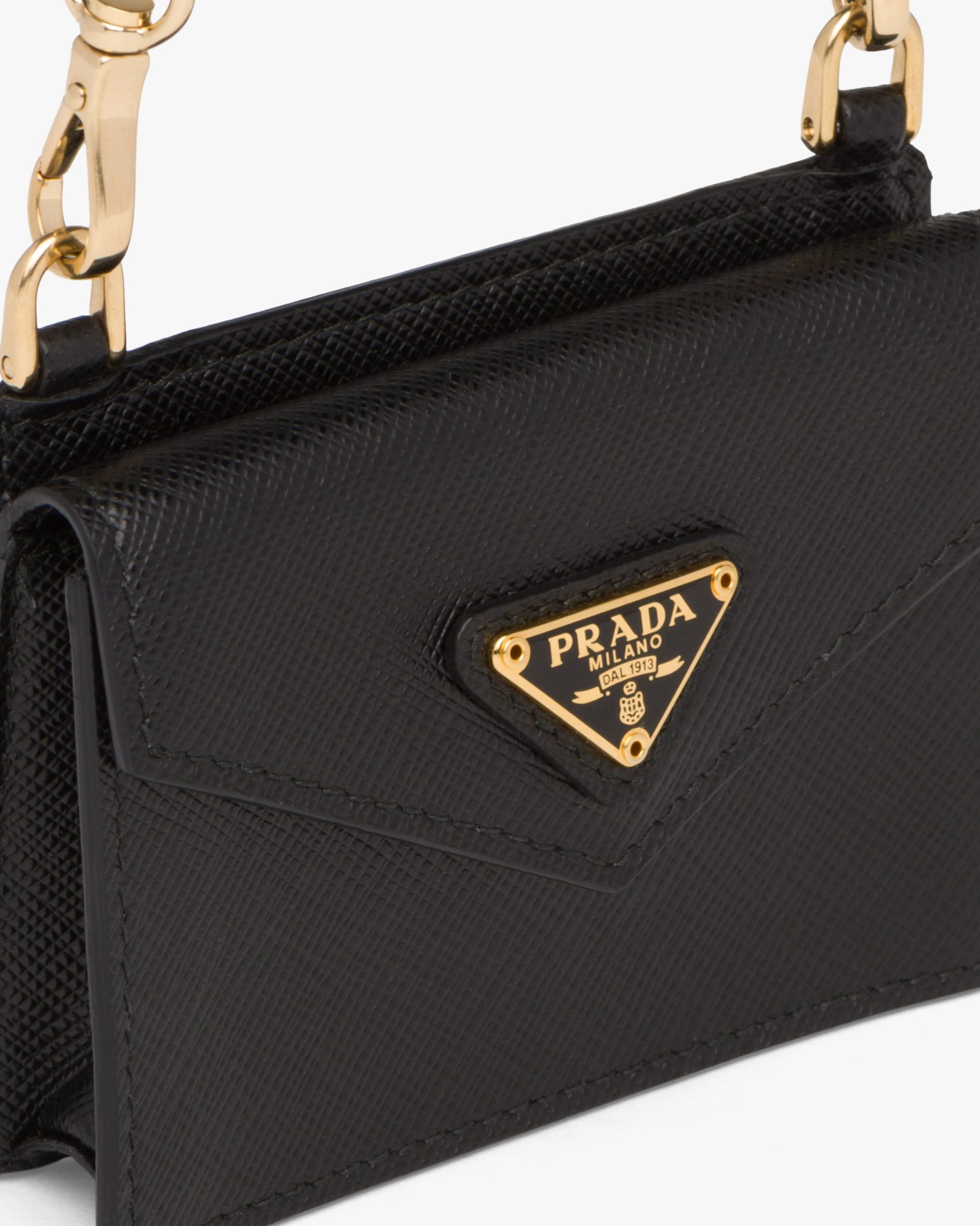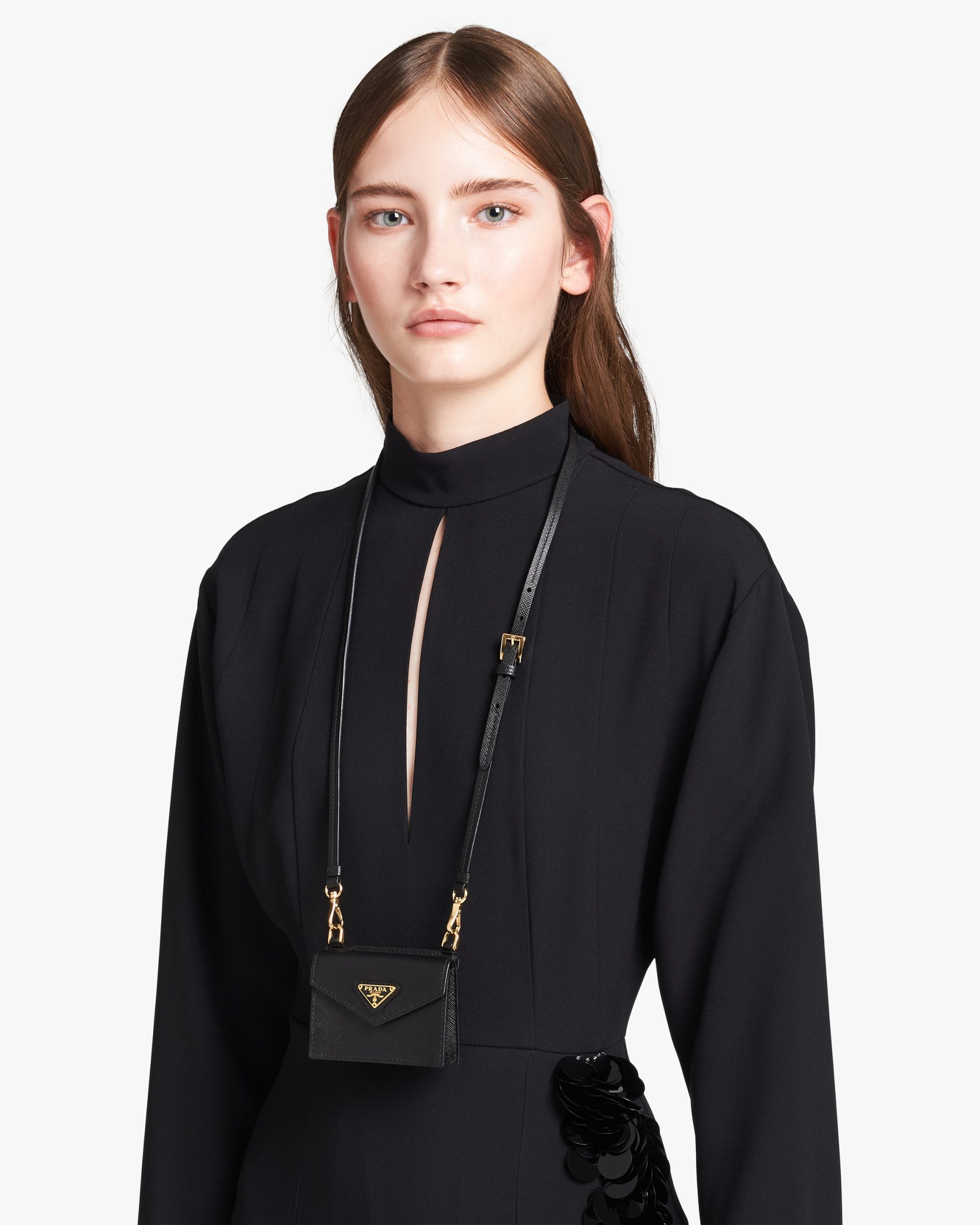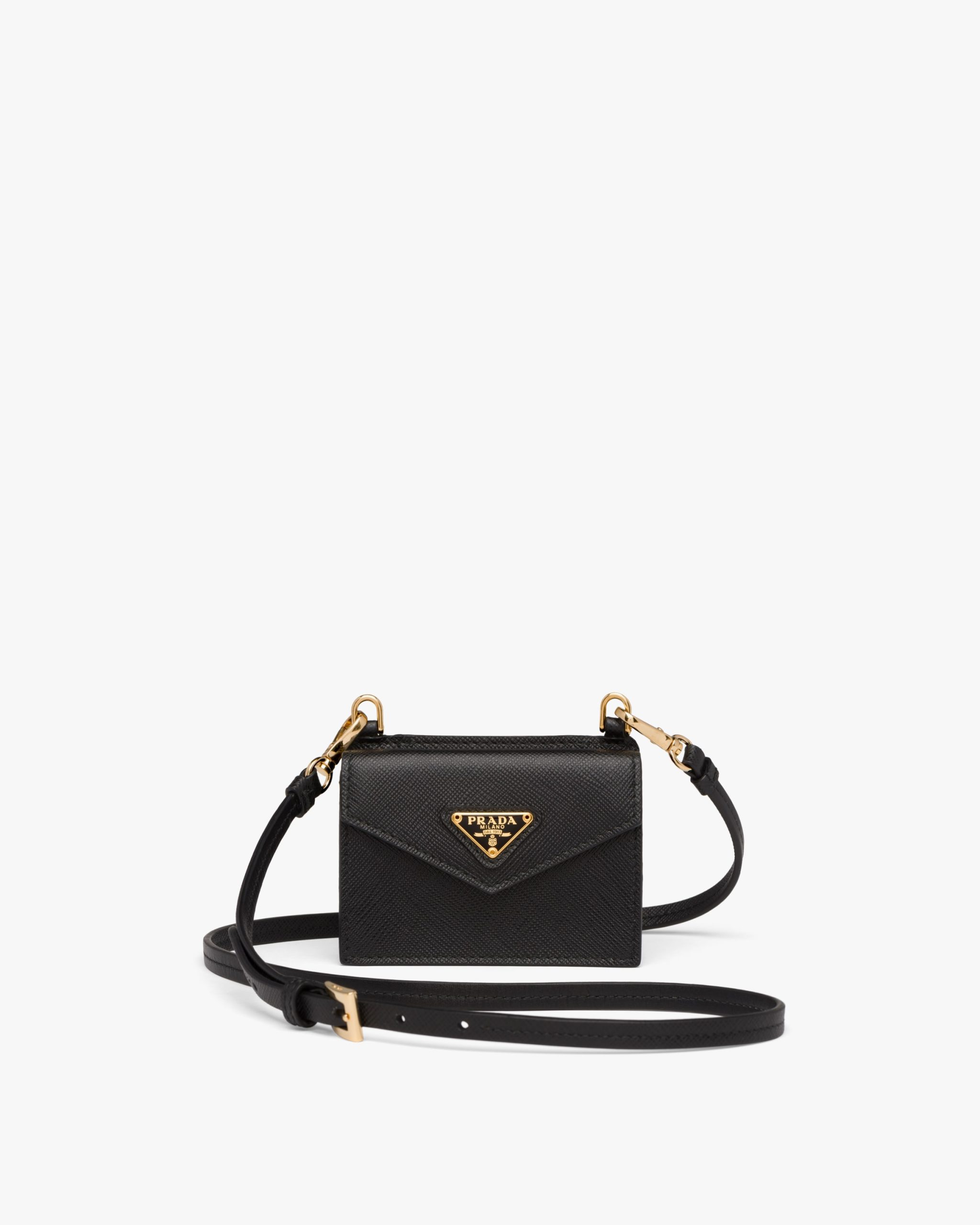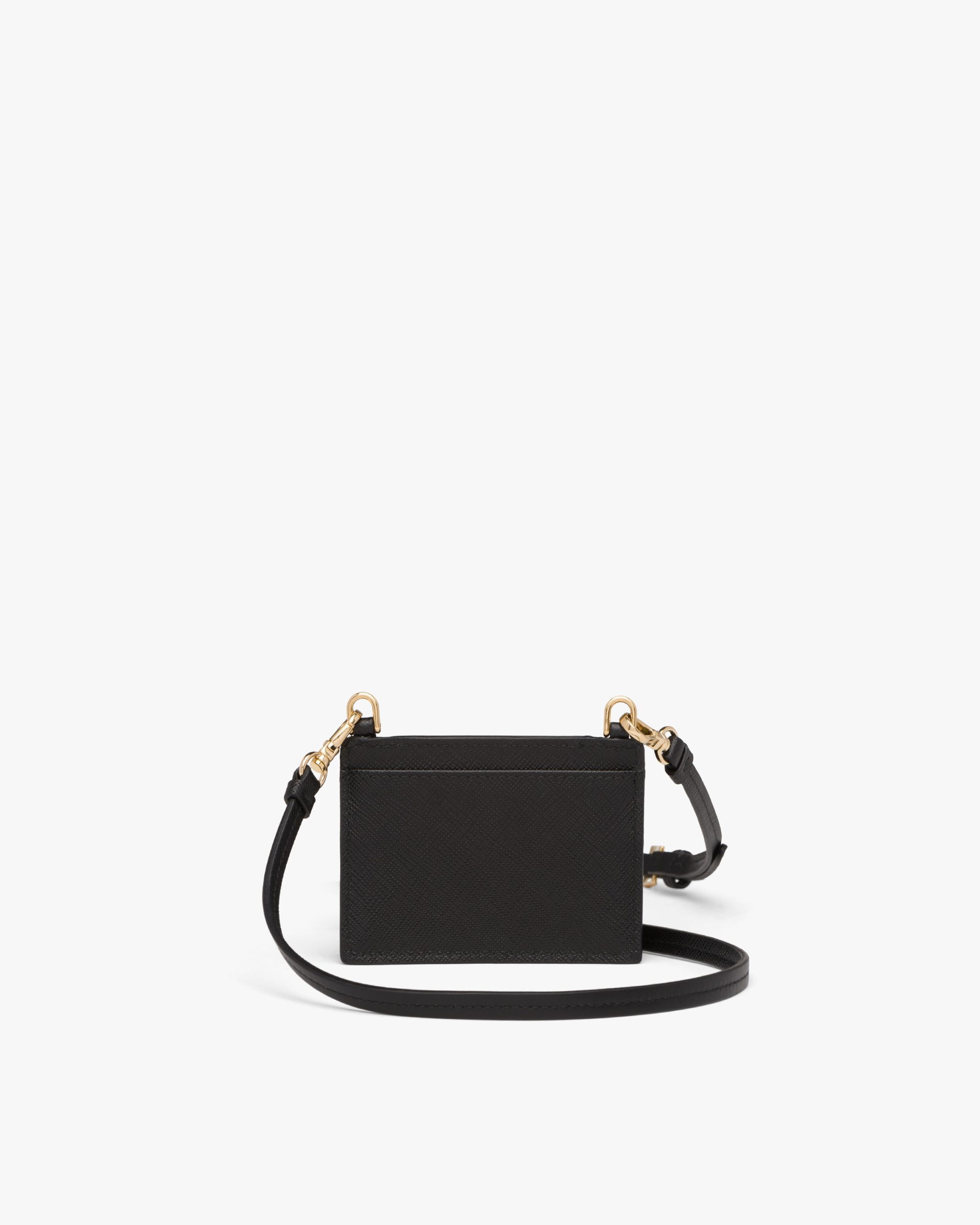 This Saffiano leather card holder comes with a shoulder strap. The triangle logo2 decorates the accessory.