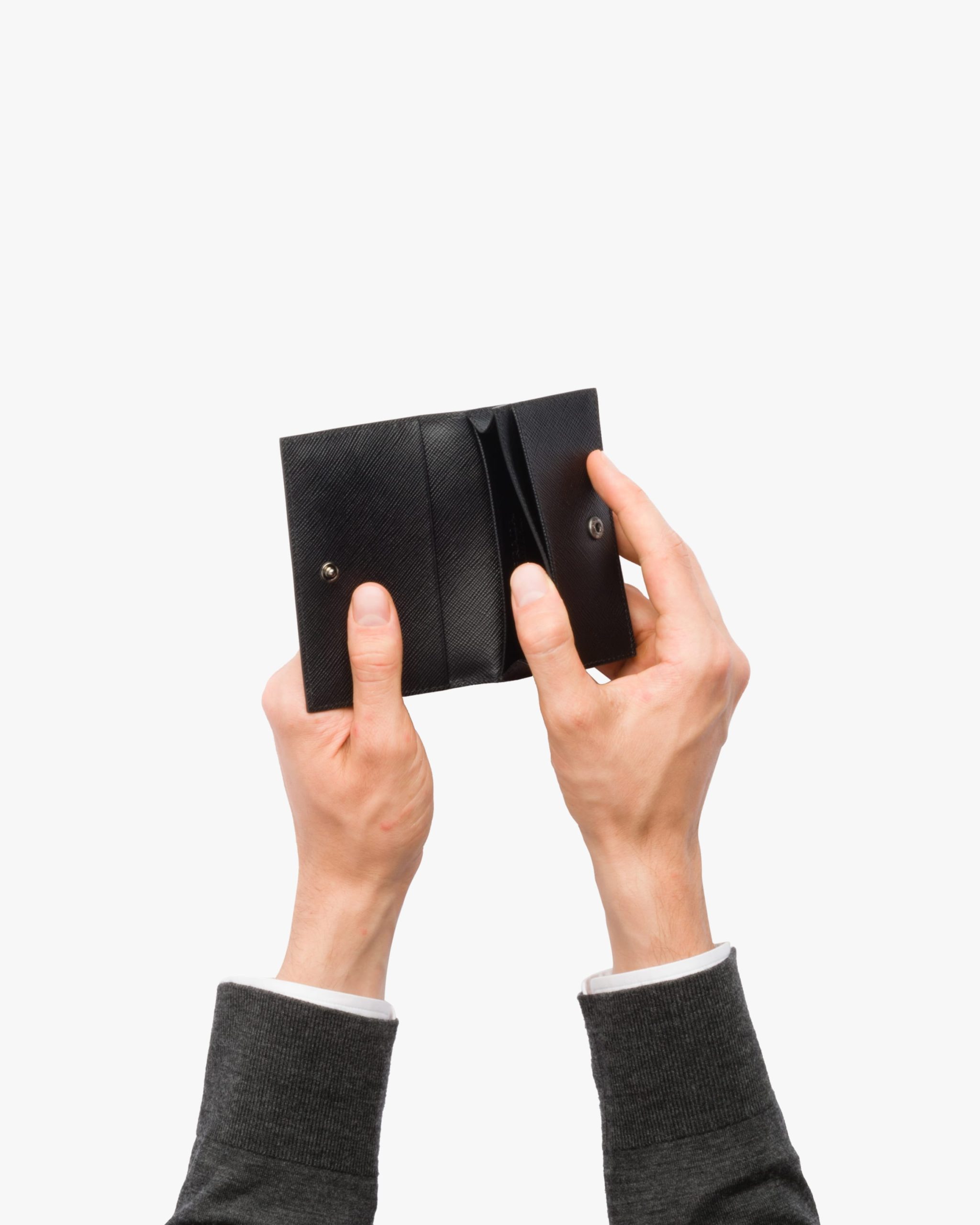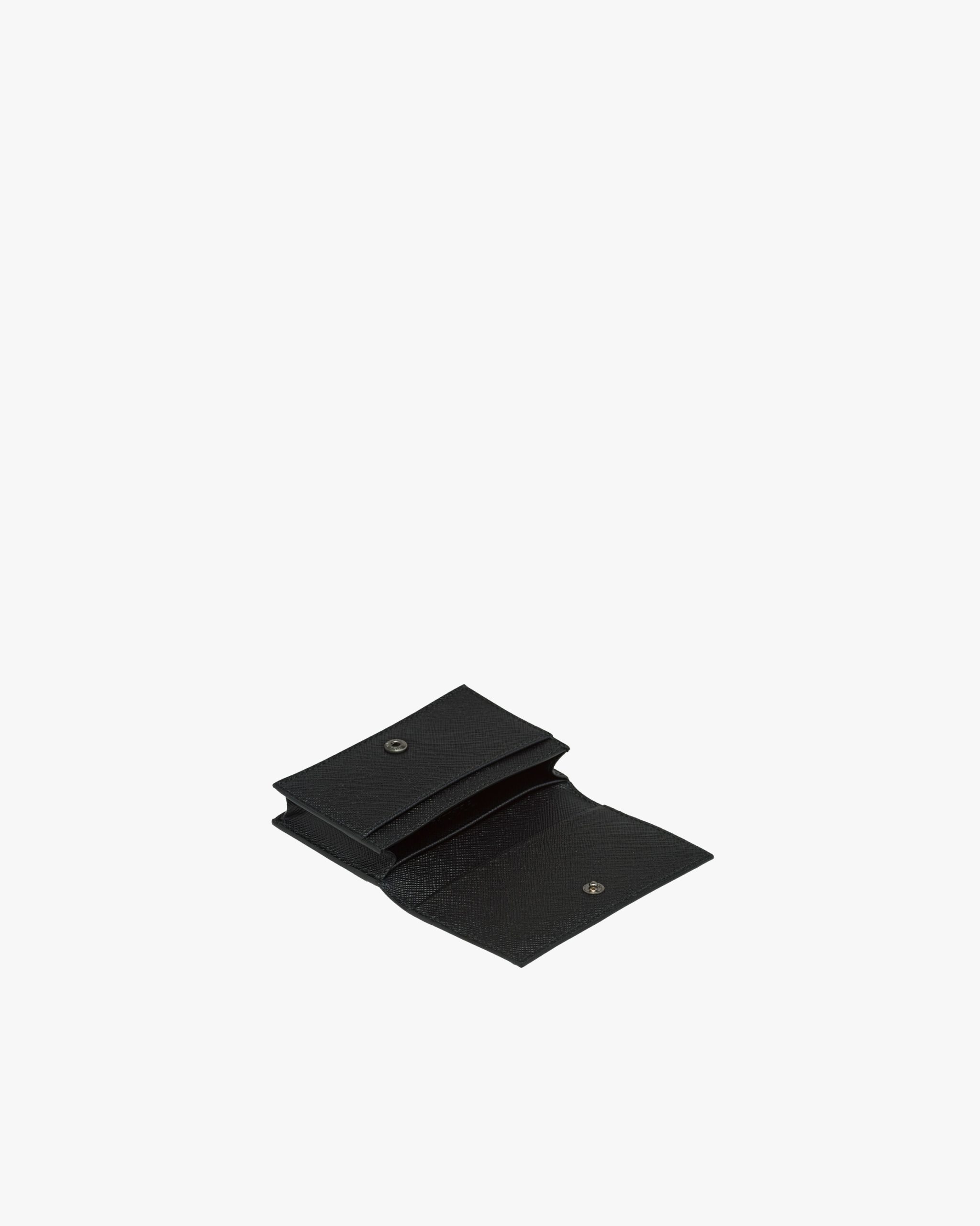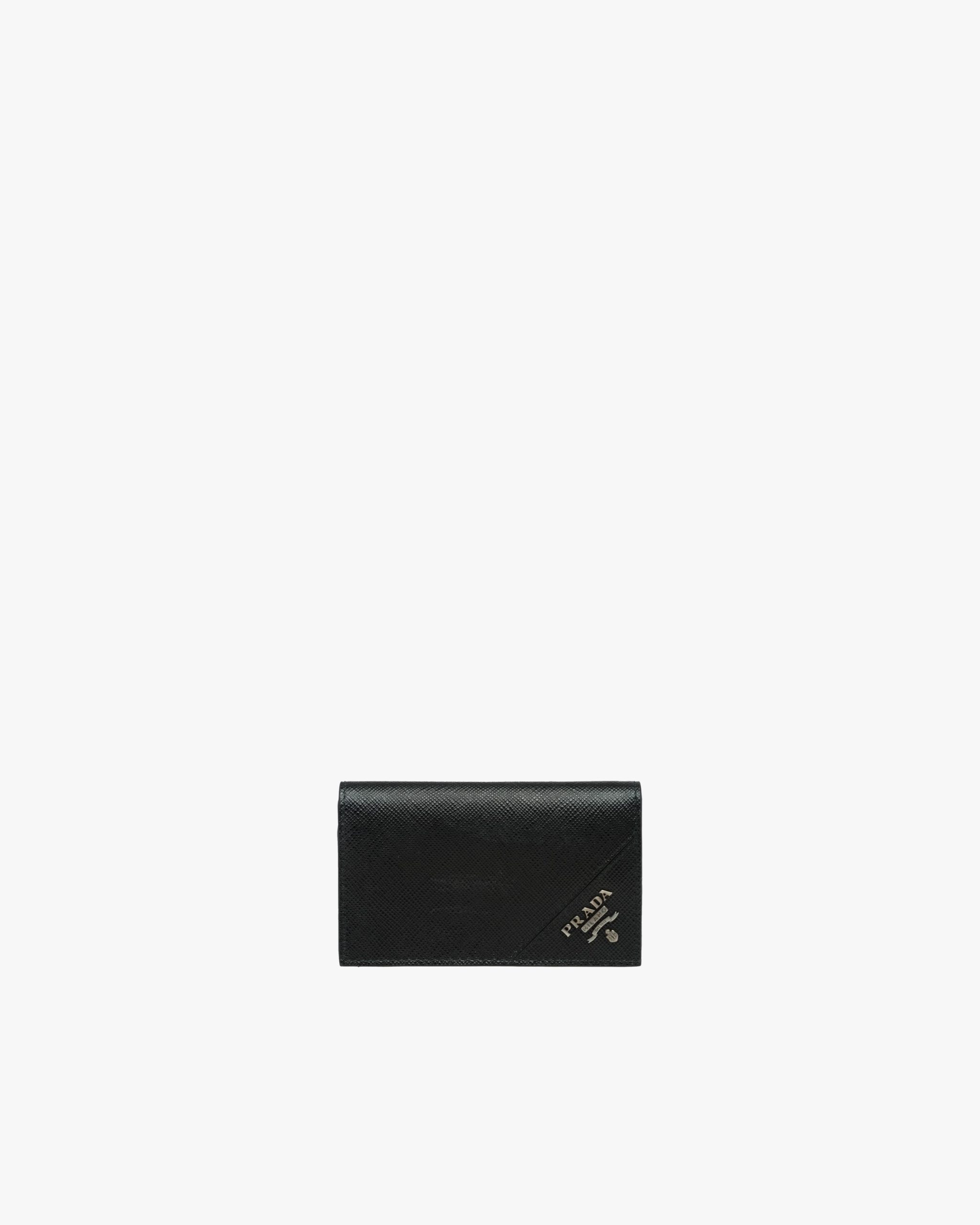This Saffiano leather credit card holder is detailed with a Prada logo2 in the bottom corner. One main compartment with bellow and three compartments are revealed by the snap closure.