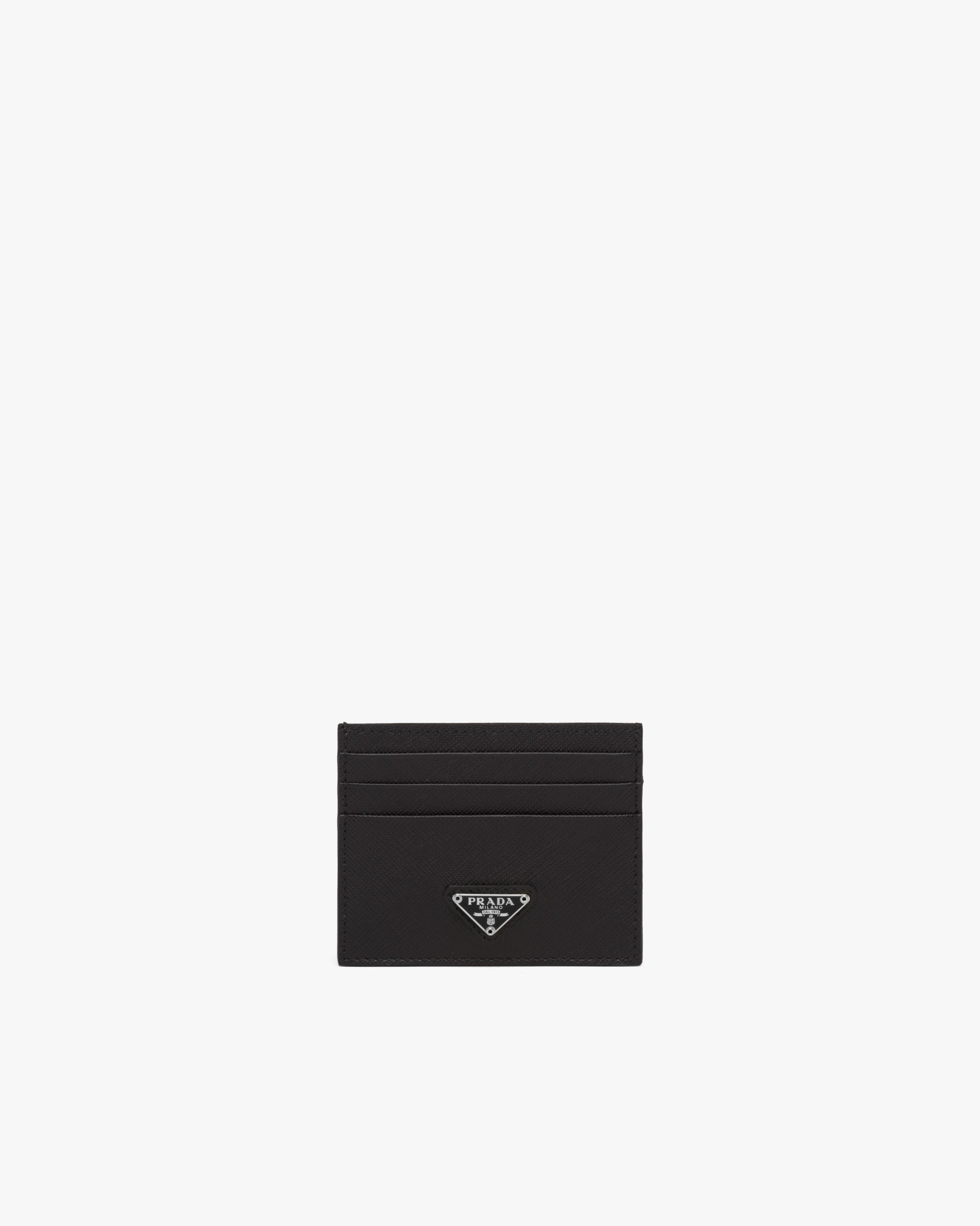 The unmistakable texture of Saffiano leather characterizes this sleek card holder. The accessory with six card slots is decorated with a tonal enameled metal triangle logo2.