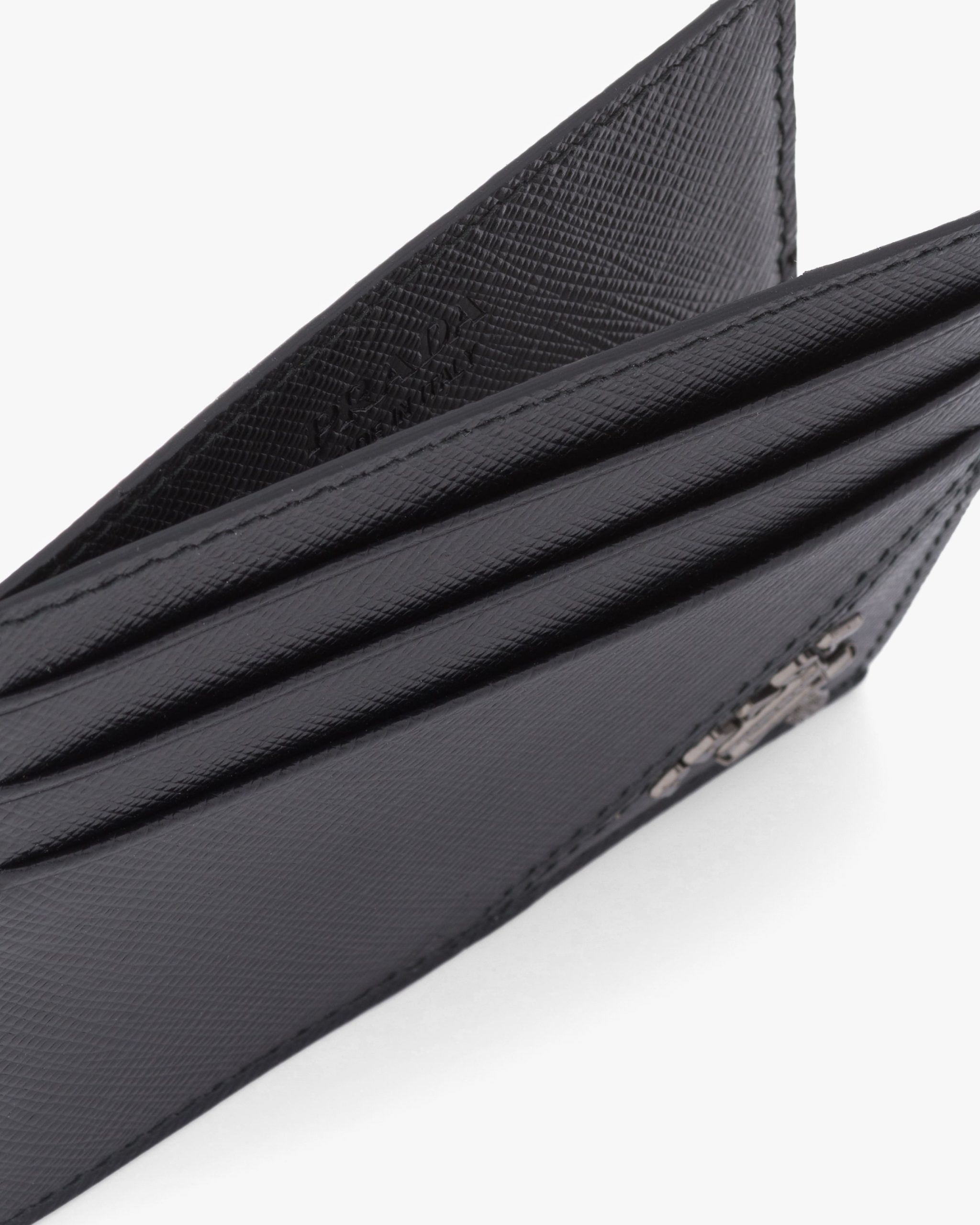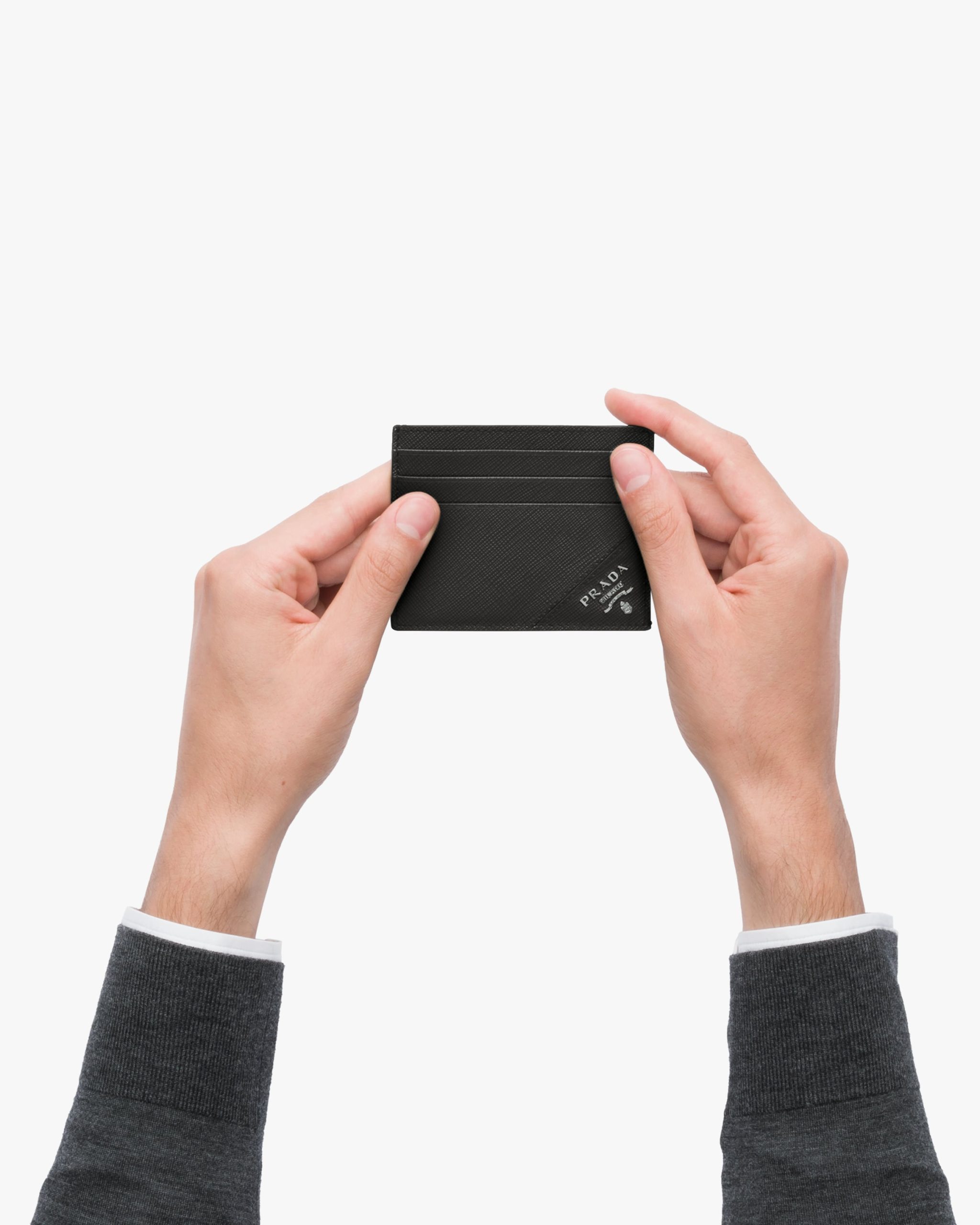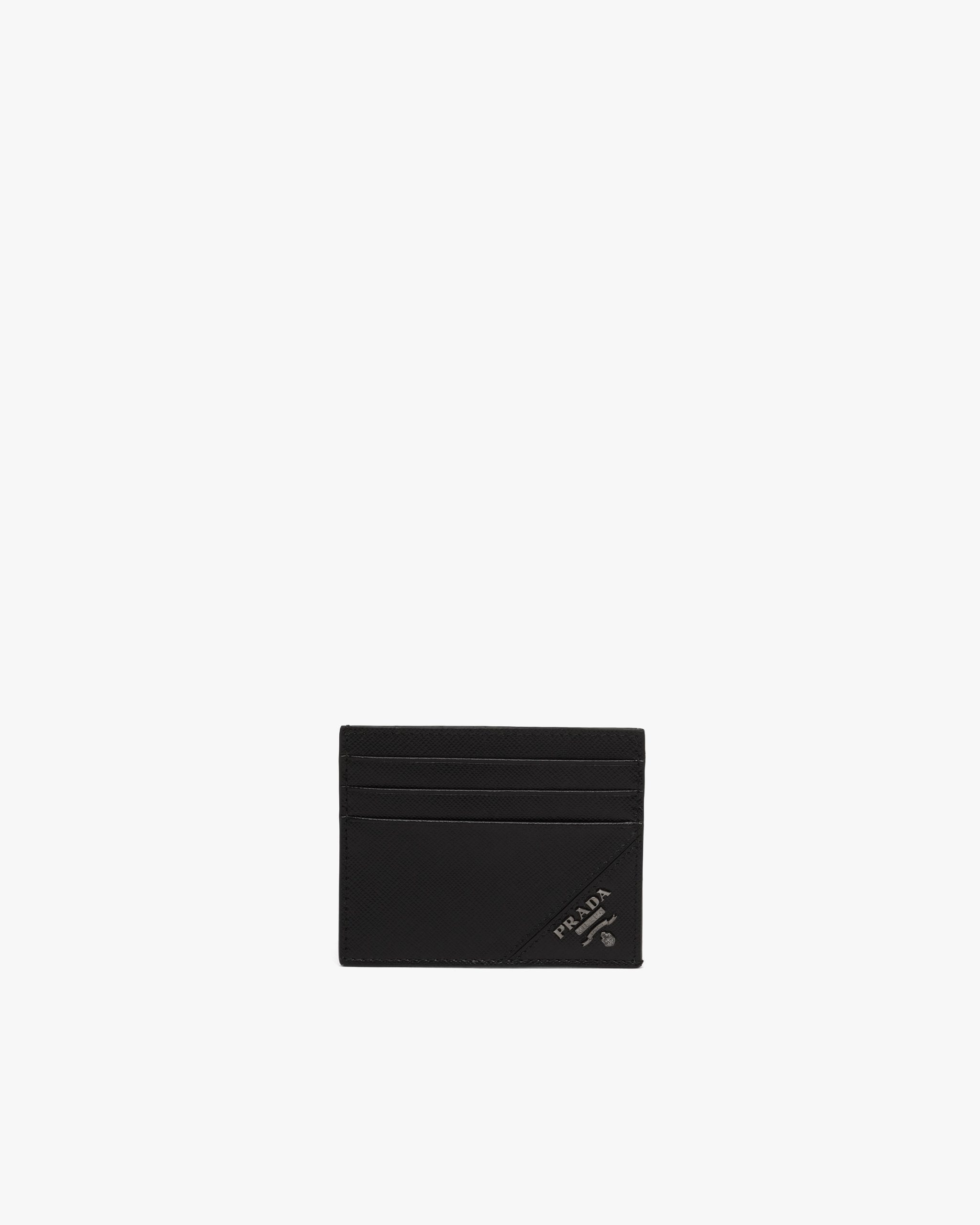 A triangle embellished with the Prada logo2 distinguishes this Saffiano leather credit card holder. There are six slots for credit cards ??three on the front, three on the back ??and one center pocket.