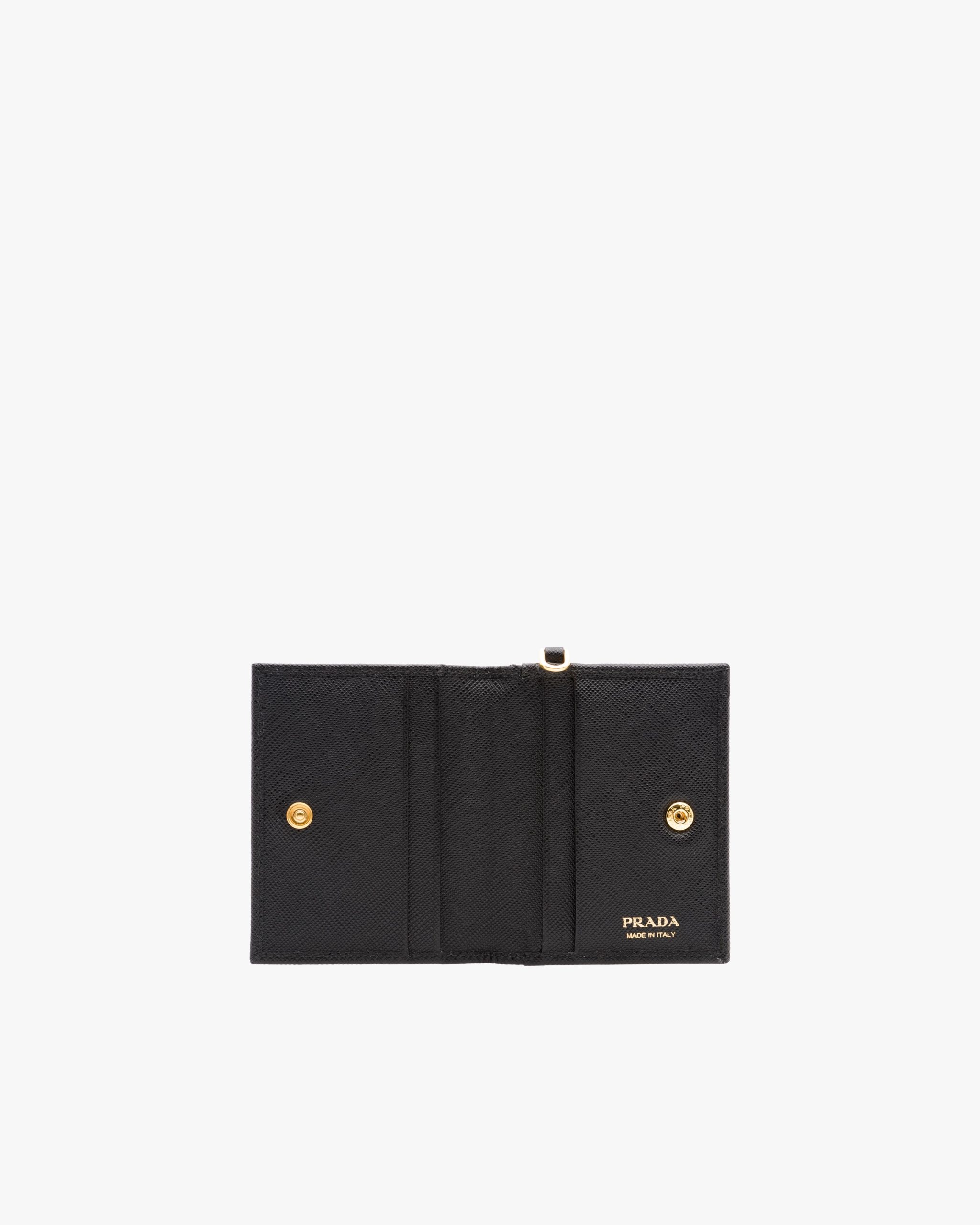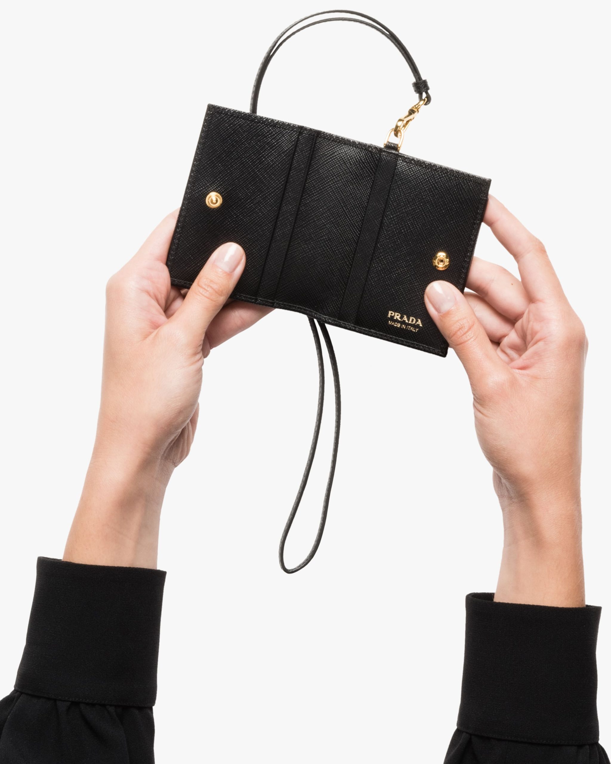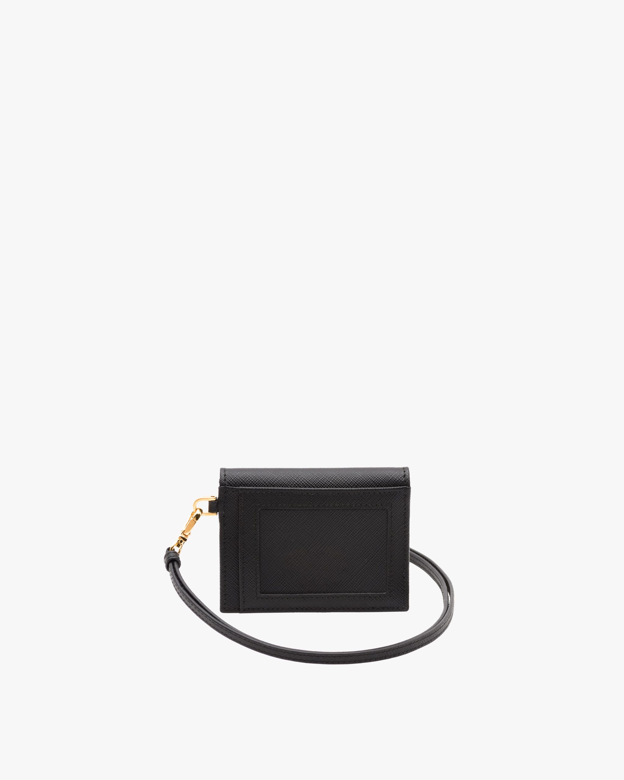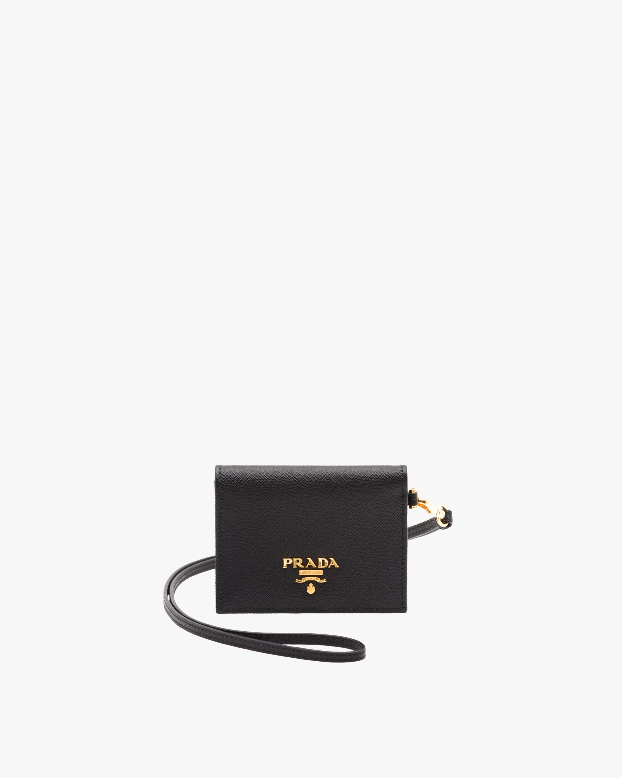 This Saffiano leather badge holder is detailed with gold-finish Prada lettering. Opening with a snap closure, there are two pockets for holding documents or tickets.