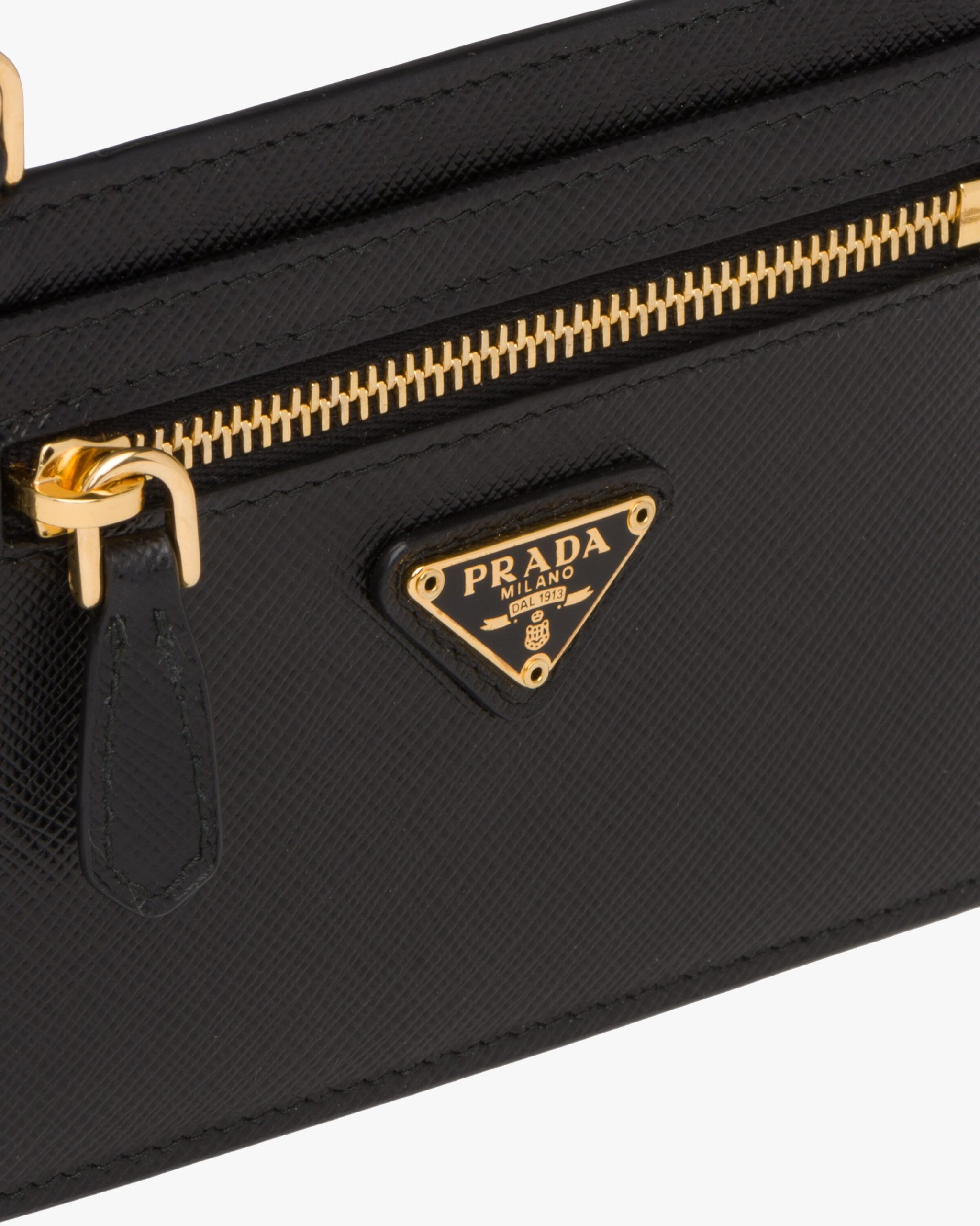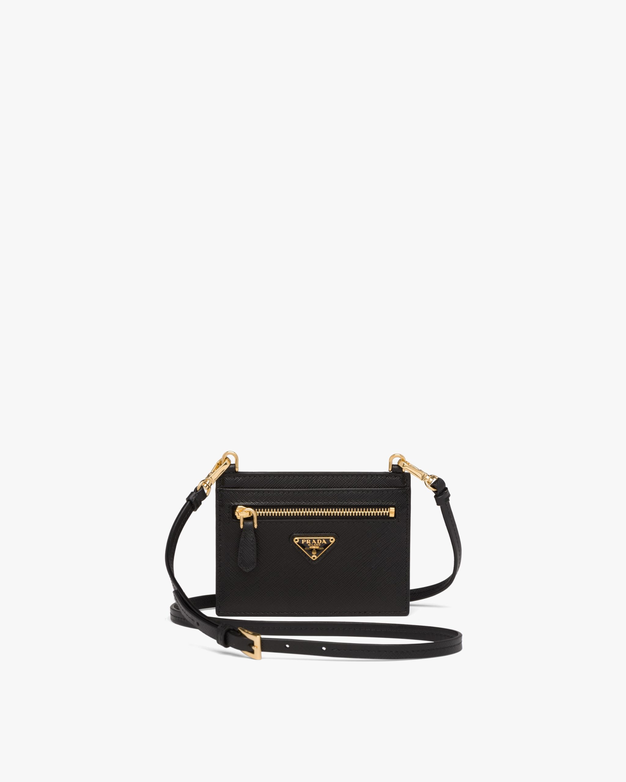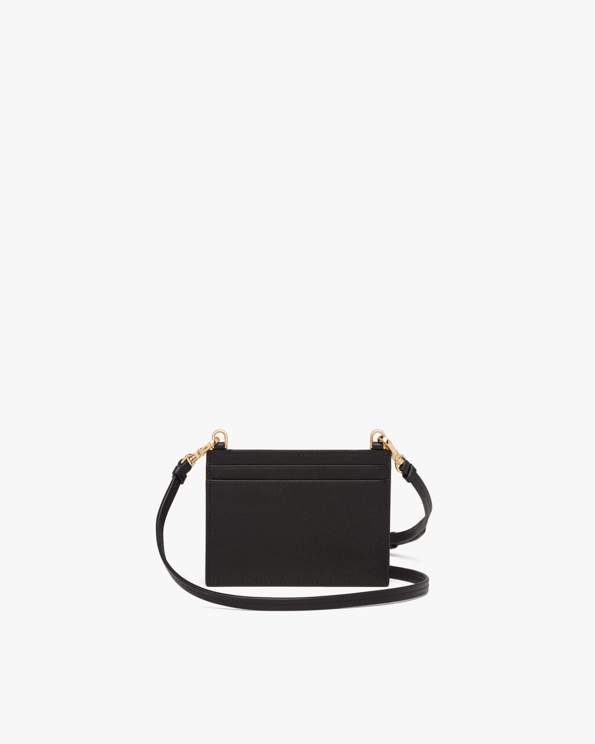 This compact Saffiano leather card holder has a detachable adjustable shoulder strap.