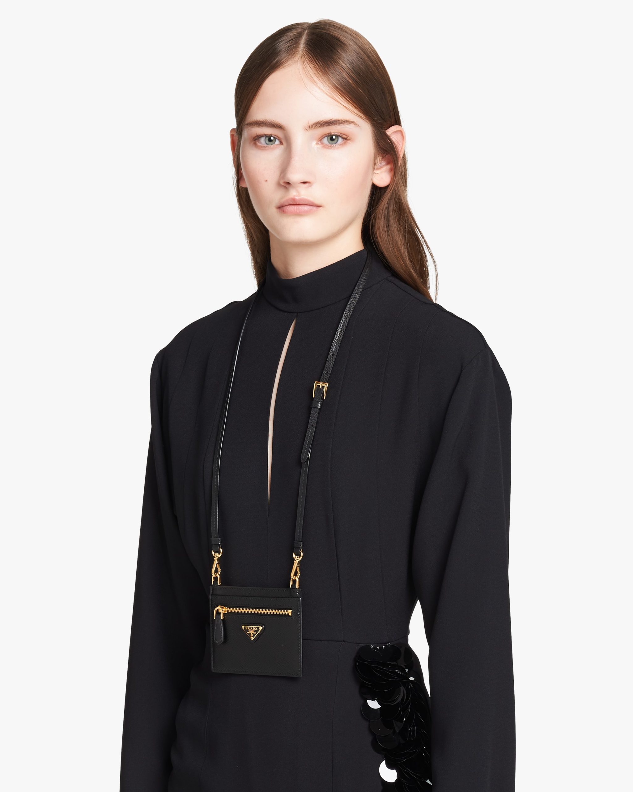 • Detachable and adjustable Saffiano leather neck strap