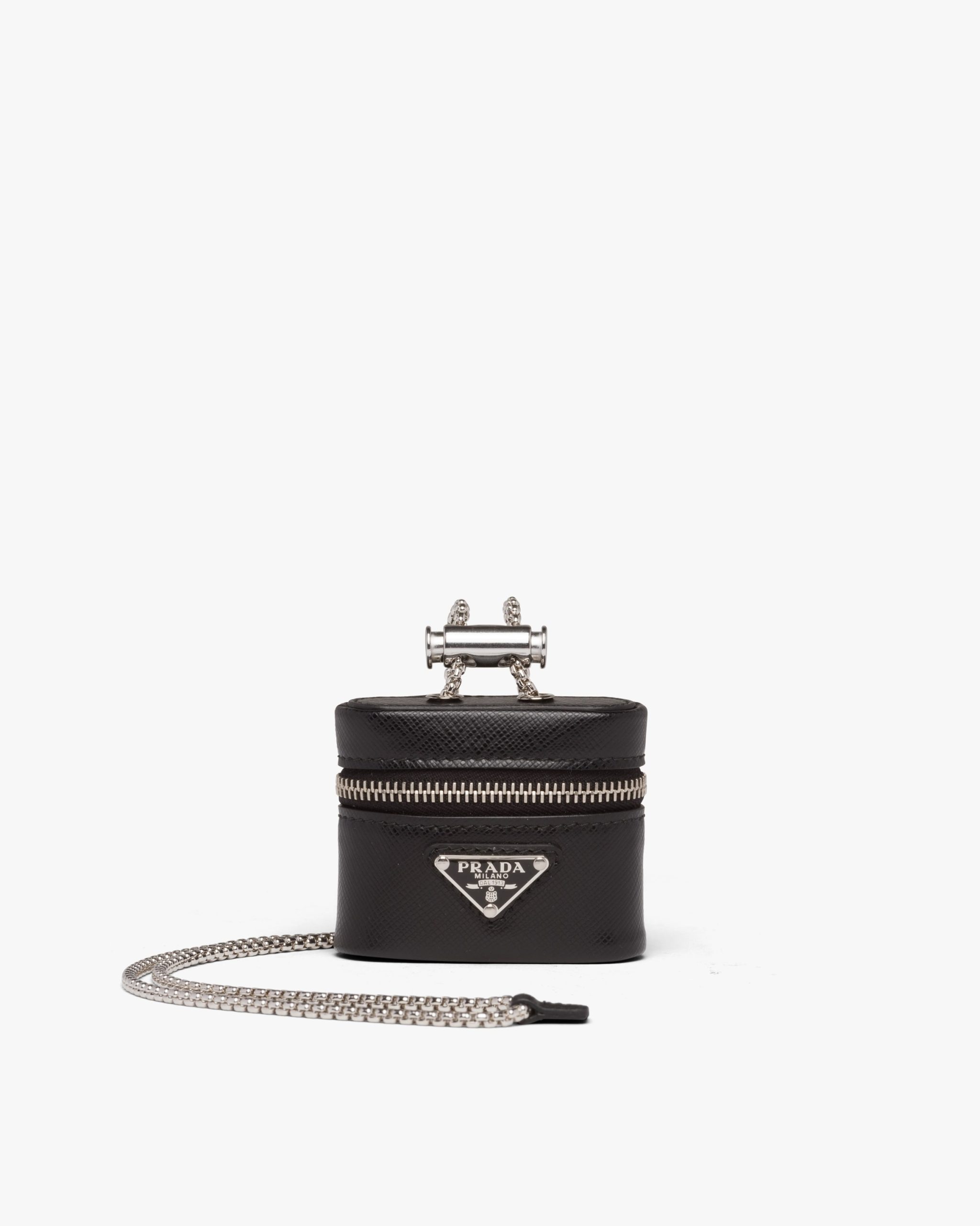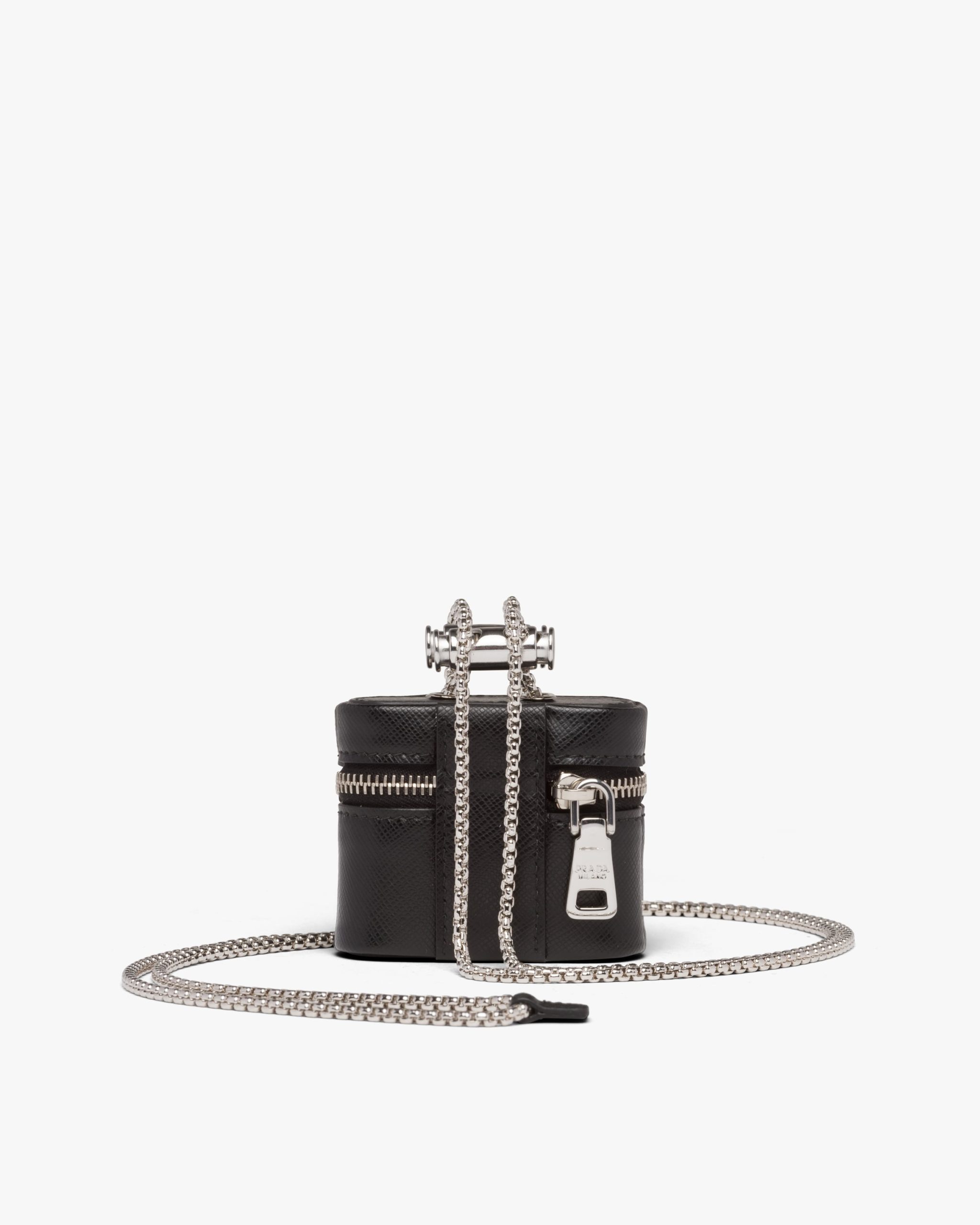 A contemporary and versatile accessory, this mini-pouch is made of Saffiano, an iconic material of Prada: calf leather of the highest quality defined by the crosshatch texture and waxed finish. The enameled metal triangle logo2 accents the design, completed by an adjustable chain for wearing it different ways.